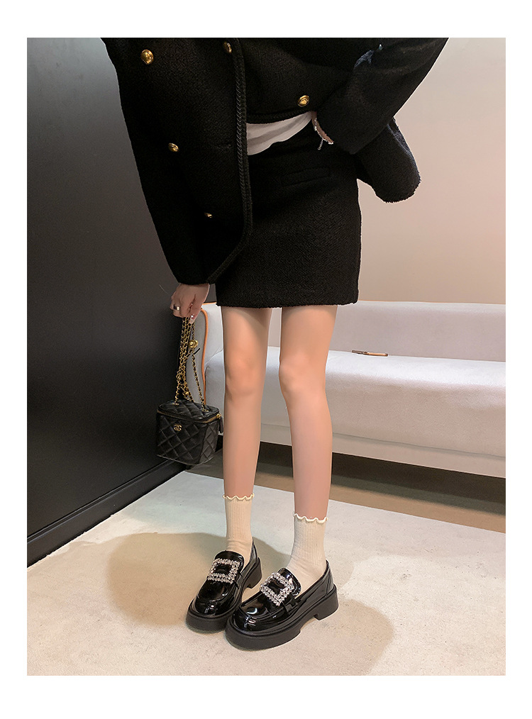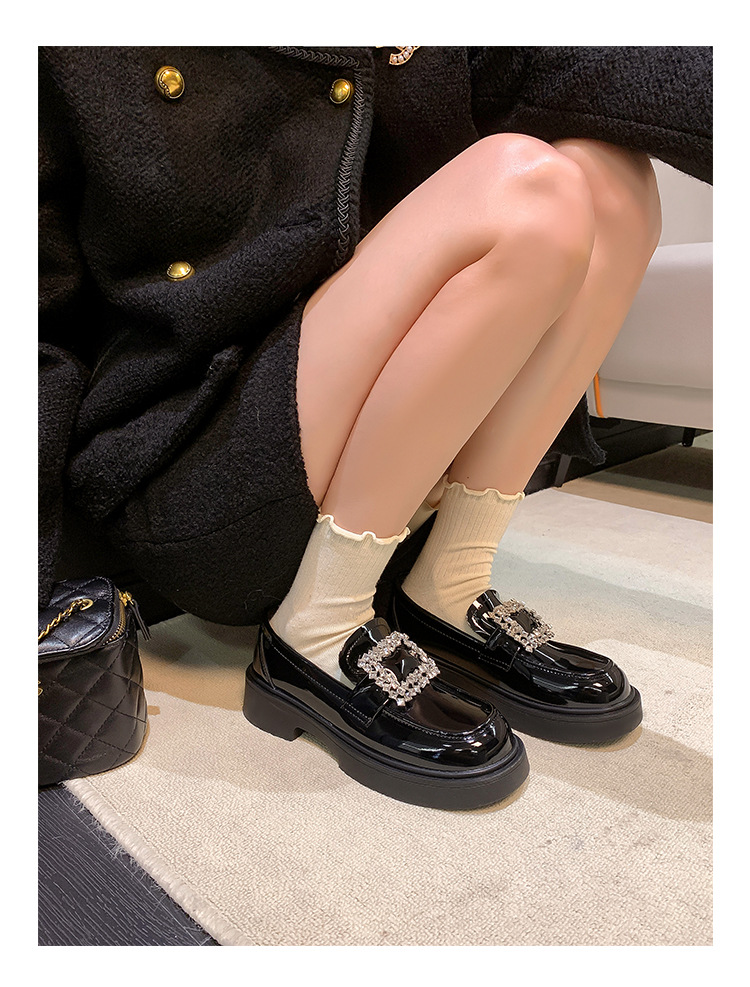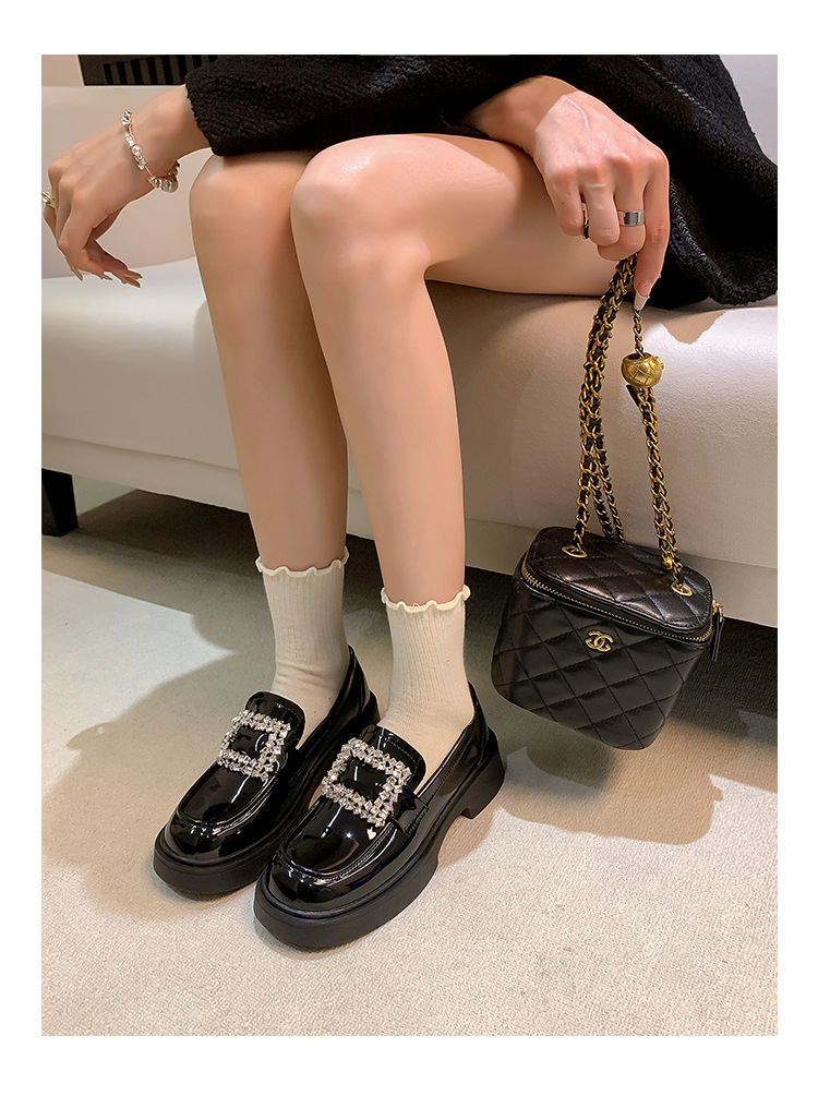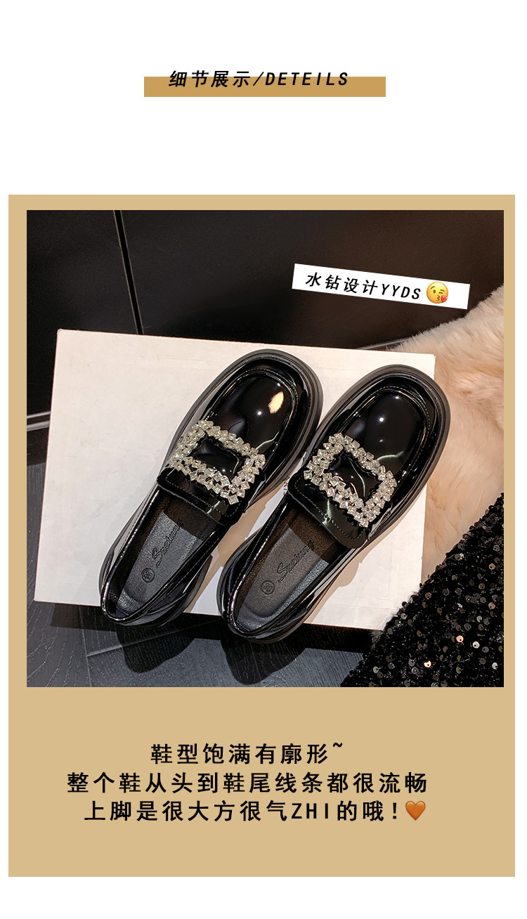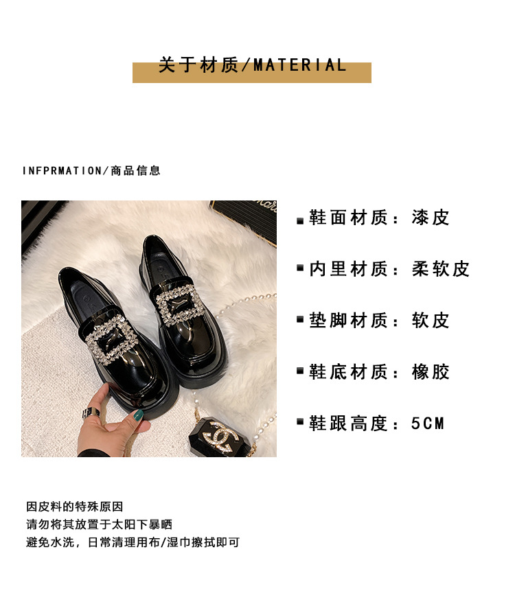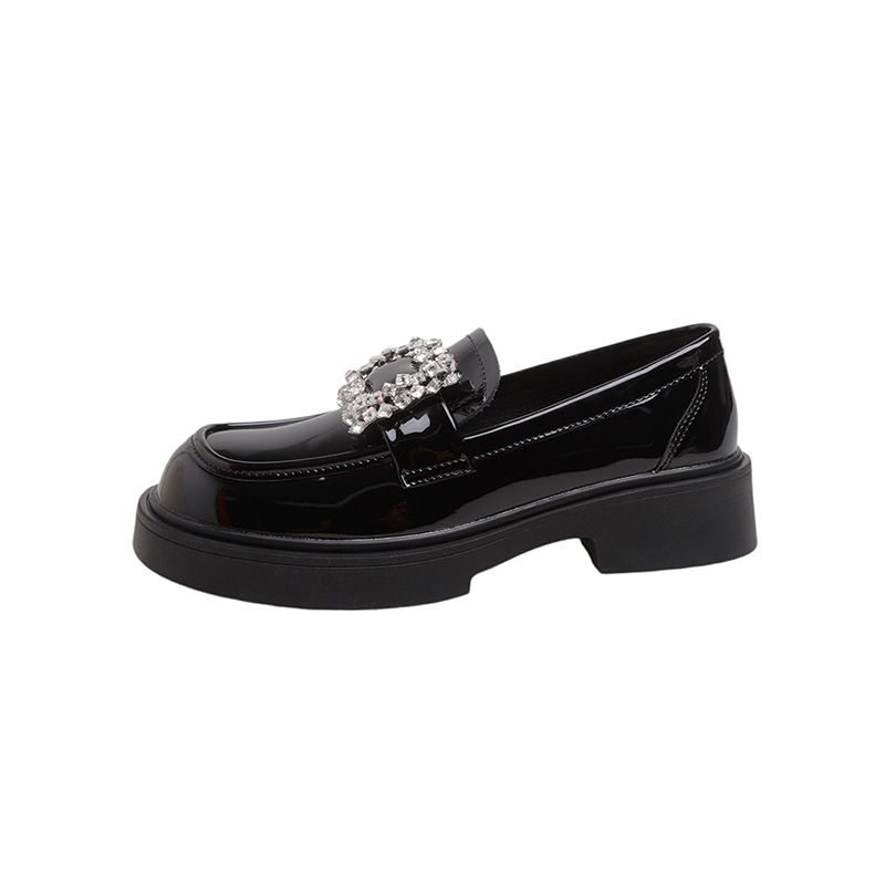 부드러운 가죽 버전 페이턴트 가죽 두꺼운 밑창 로퍼 여성용 가을과 겨울 새로운 라인 석 스퀘어 버클 라운드 토 브리티시 청키 힐 작은 가죽 신발 단층 신발
