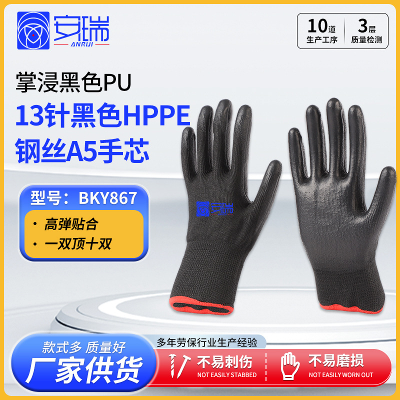 PU 코팅 손바닥 장갑 블랙 디핑 팜 코팅 손바닥 PU 코팅 13 핀 스틸 와이어 A2 핸드 코어 미끄럼 방지 보호 장갑