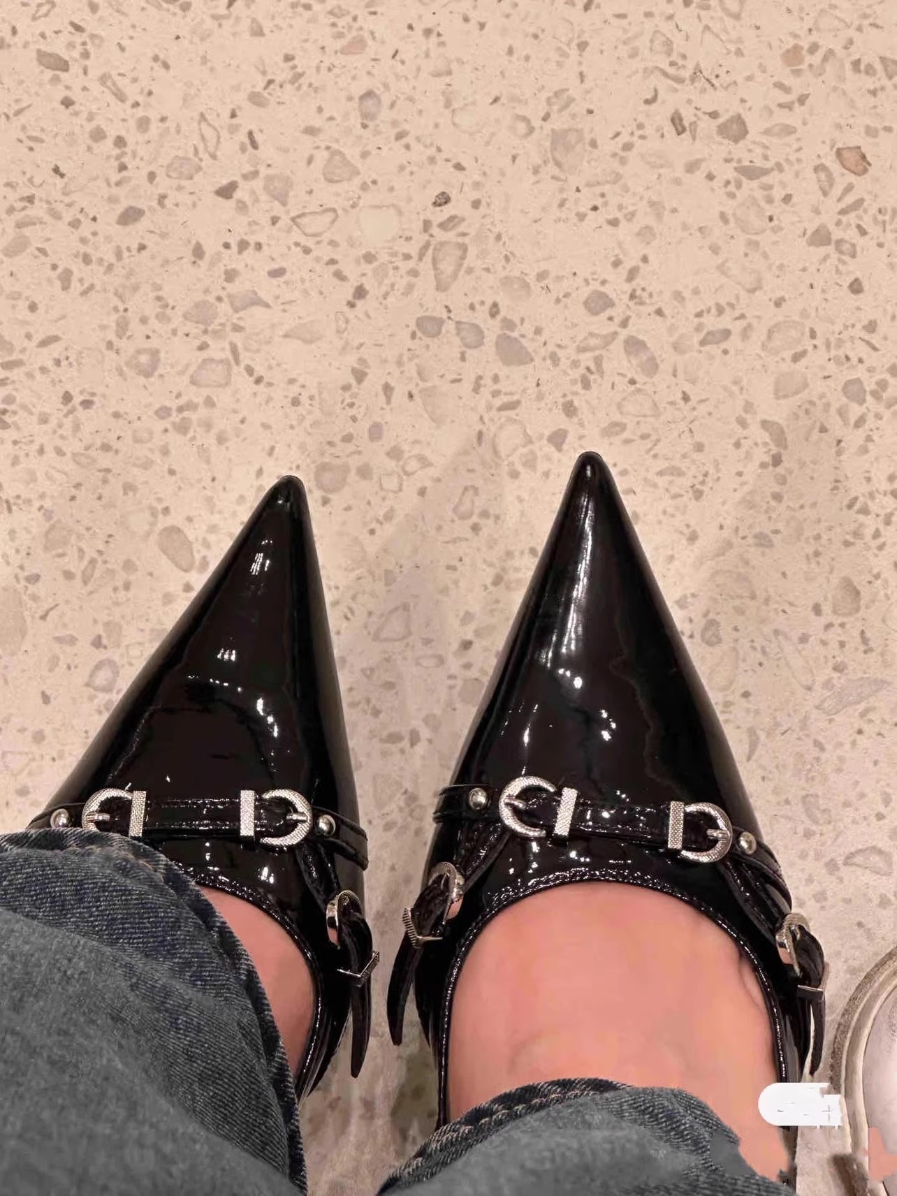 2025 봄과 가을 새로운 스타일 백 중공 단일 신발 여성의 작은 벨트 버클 지적 발가락 스틸레토 샌들 다목적 곡선 발 뒤꿈치 특허 가죽 하이힐스토어 가기