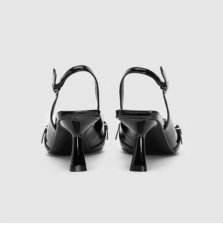2025 봄과 가을 새로운 스타일 백 중공 단일 신발 여성의 작은 벨트 버클 지적 발가락 스틸레토 샌들 다목적 곡선 발 뒤꿈치 특허 가죽 하이힐