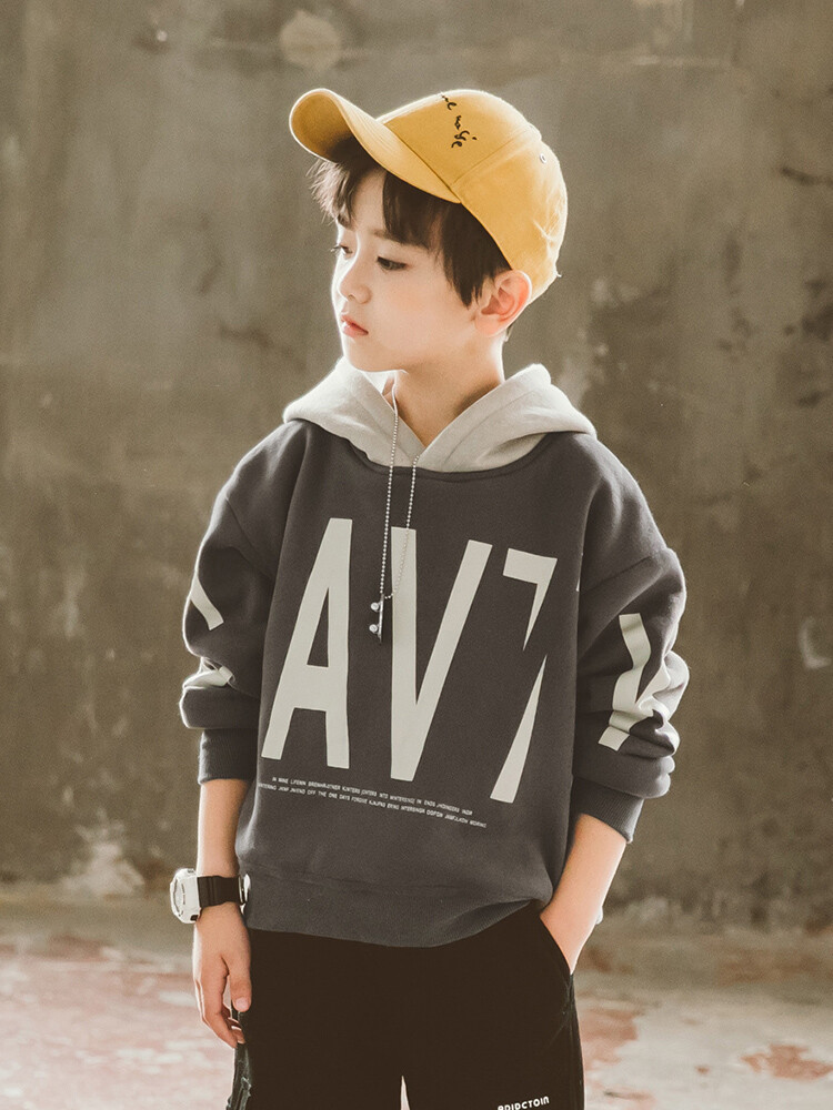 아동복 기모 땀 소년의 편지 두꺼운 후드 땀 서양 스타일 중간 및 큰 어린이를위한 긴 소매 탑 겨울 2023 유행