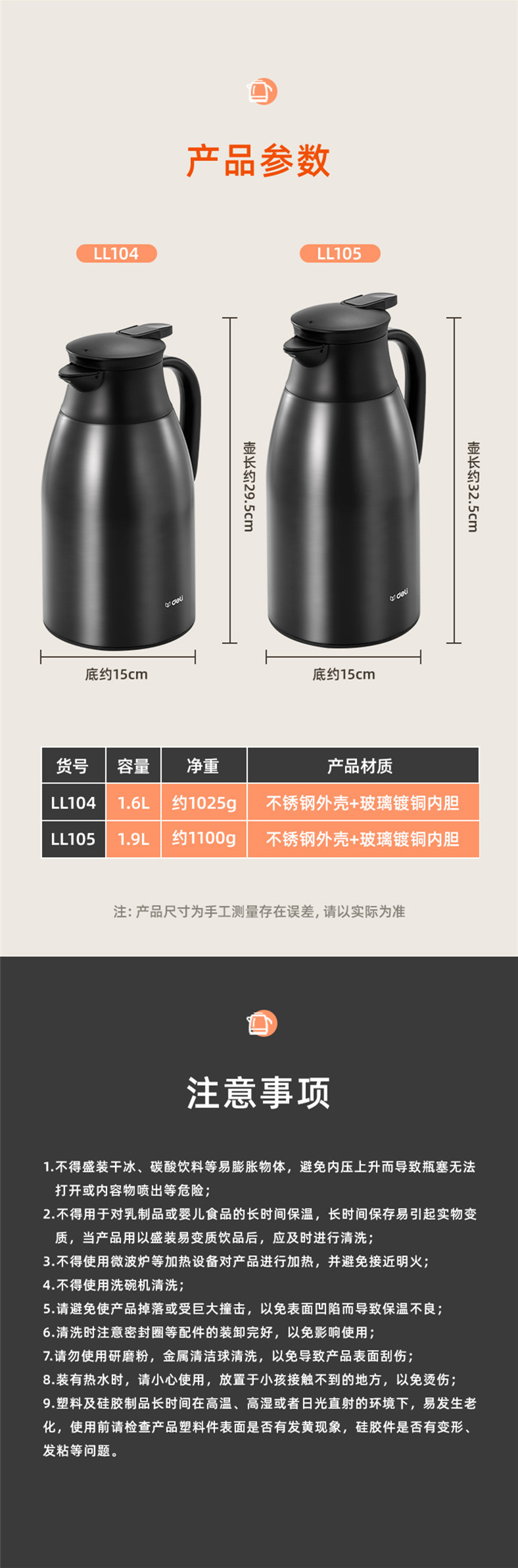 델리 LL104 절연 포트 유리 구리 도금 라이너 절연 콜드 포트 여행 사무실 가정 단열 포트 1.6L