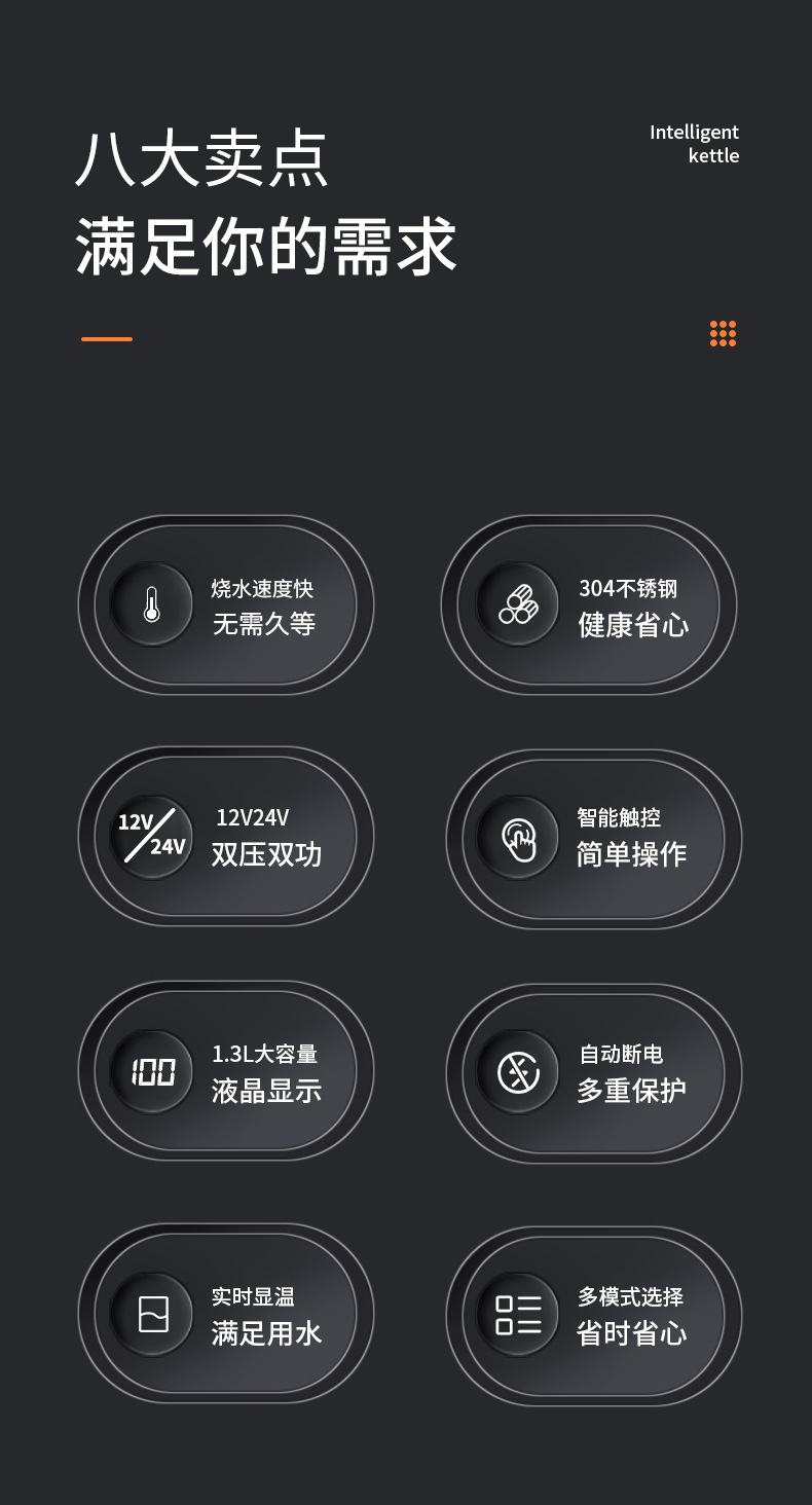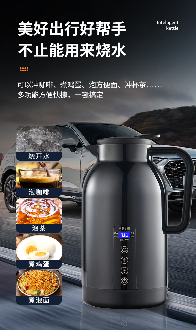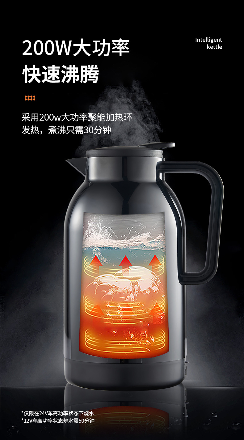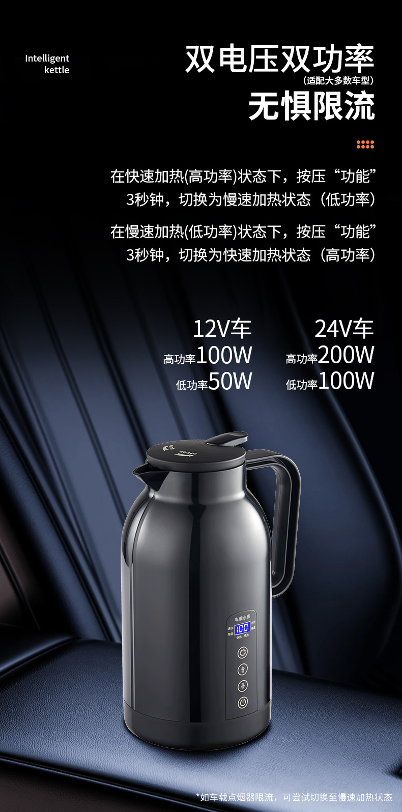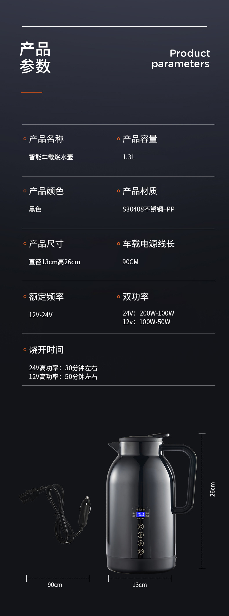 【加热时间】:12V模式60分钟左右100摄氏度(具体烧水时间根据不同车型电流高低及环境温度而定有所区别)
