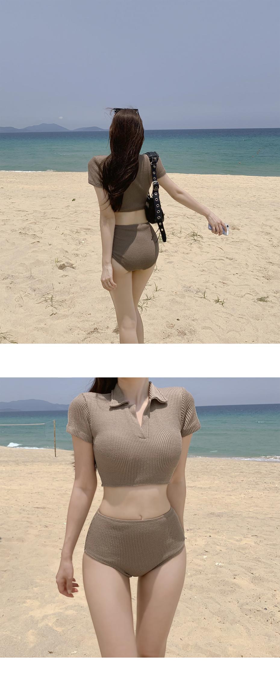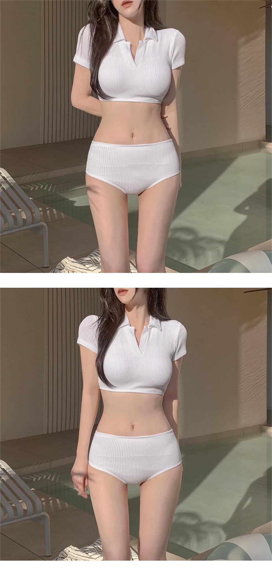 2024 새로운 한국 단색 하이 웨이스트 배꼽 커버 슬림 보수 온천 수영복 여성용 V-넥 멀티 컬러 비키니
