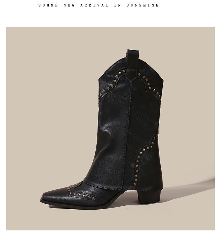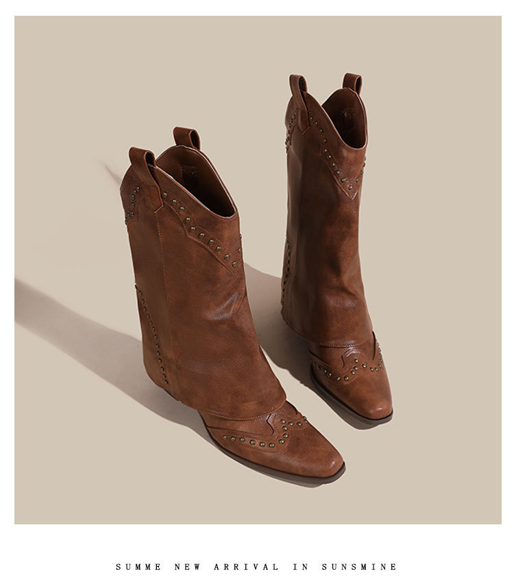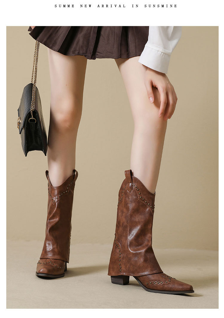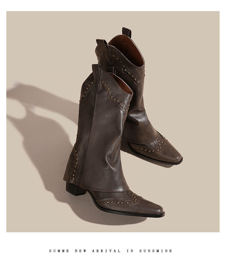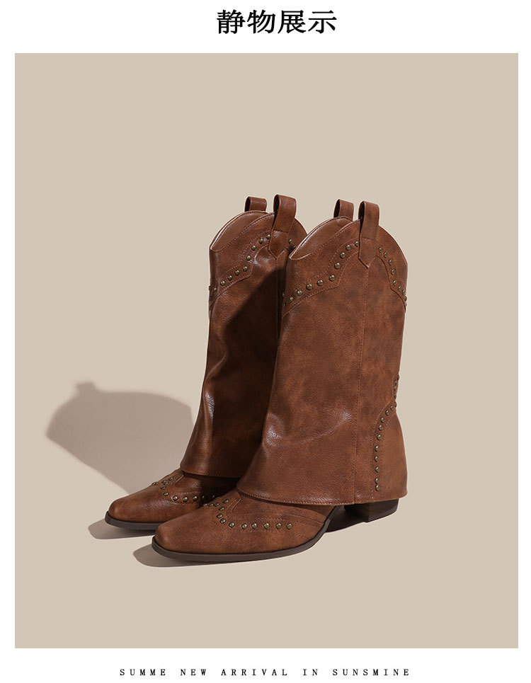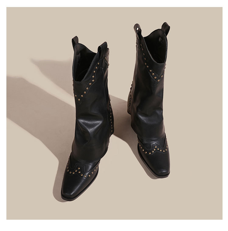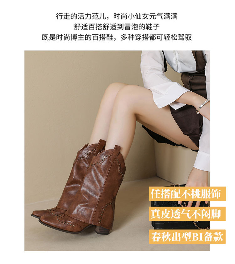 뾰족코 웨스턴 부츠 여성 숏부츠 봄 가을 신상 레트로 브라운 리벳 팬츠부츠 다용도 두꺼운 굽 중간 길이 벨벳 부츠