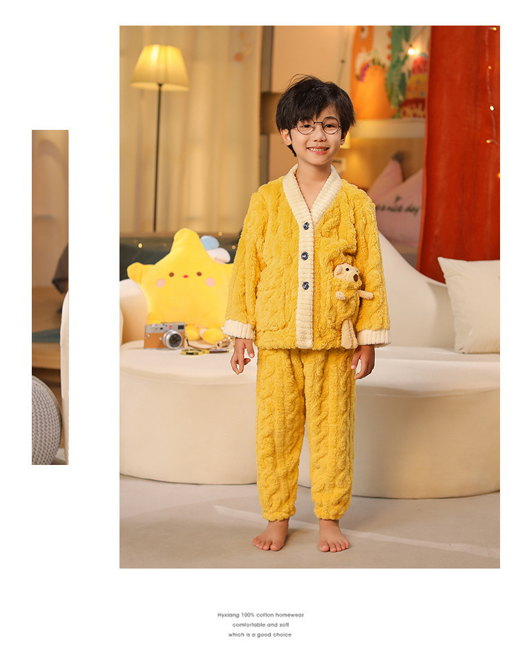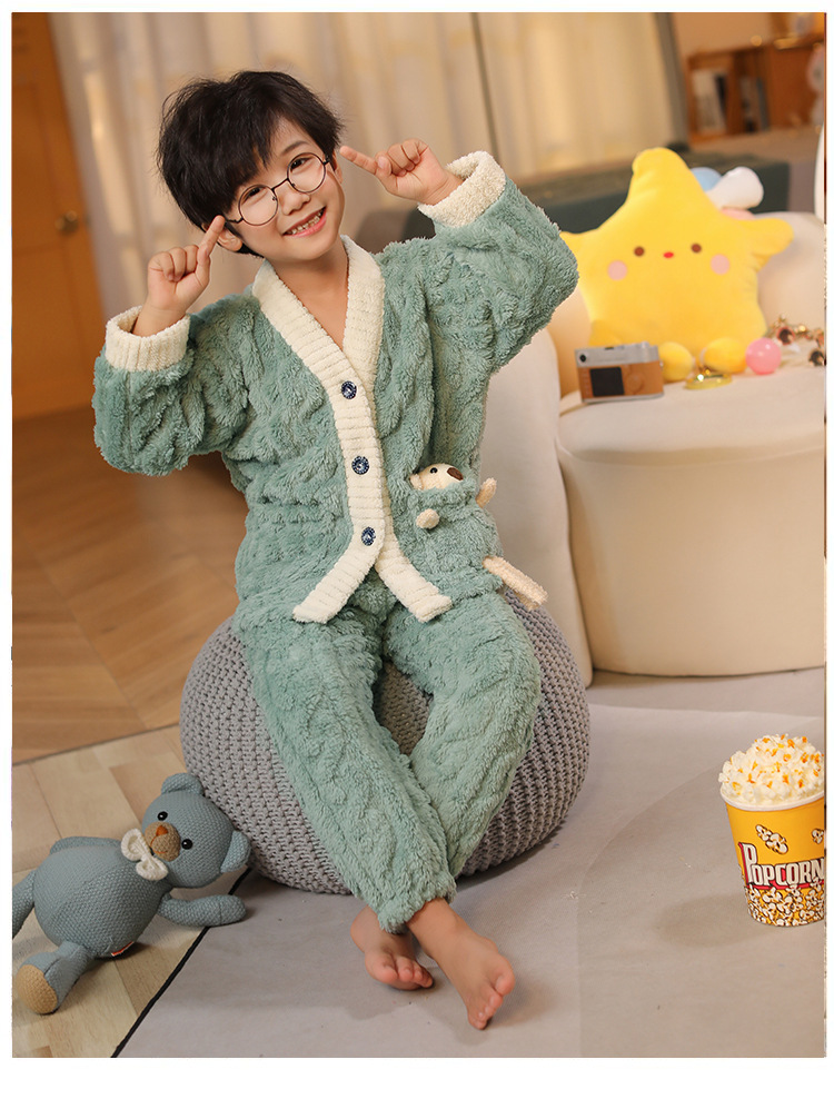 가을과 겨울 새로운 어린이 플란넬 잠옷 아기 두꺼운 겉옷 가정복 남아 '큰 어린이 산호 양털 세트