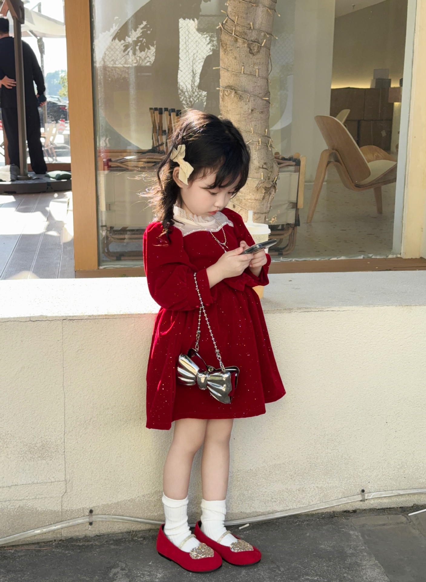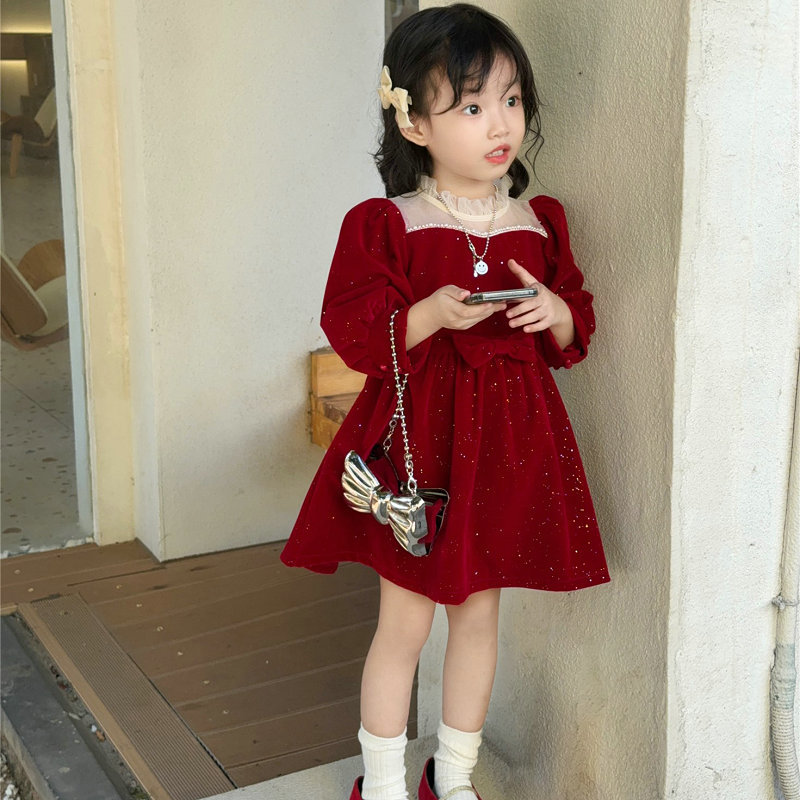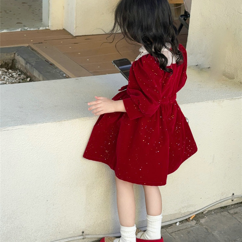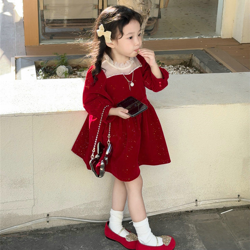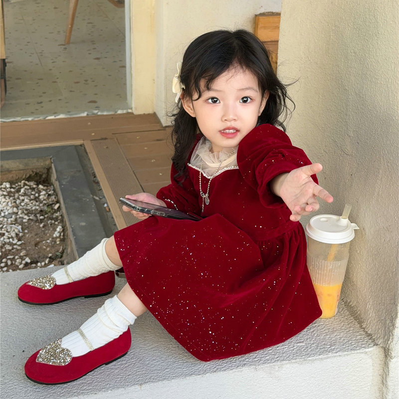 여아용 반짝이는 벨벳 플러스 벨벳 안감 두꺼운 공주 드레스 2025 가을 겨울 신상품 수출용