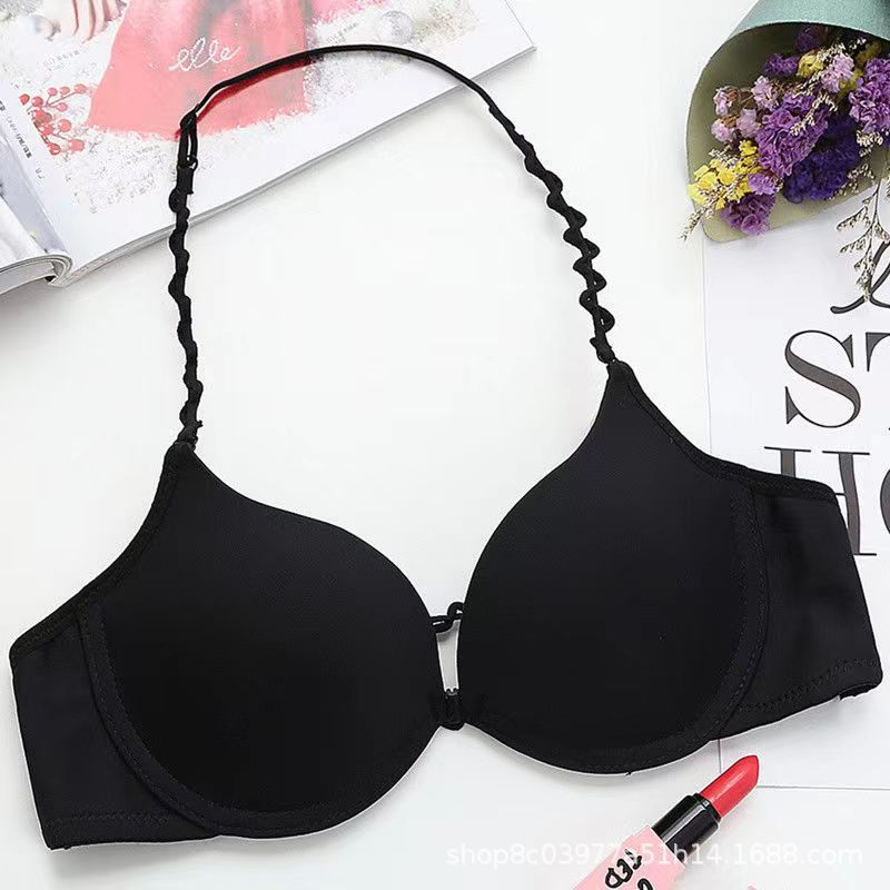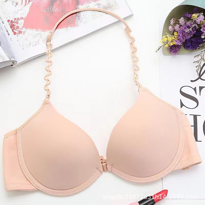 섹시한 아름다운 등 매달려 목 앞 버튼 브래지어 푸시 업 두꺼운 속옷 여성의 광택 원활한 얇은 브래지어 쇼백 작은 브래지어