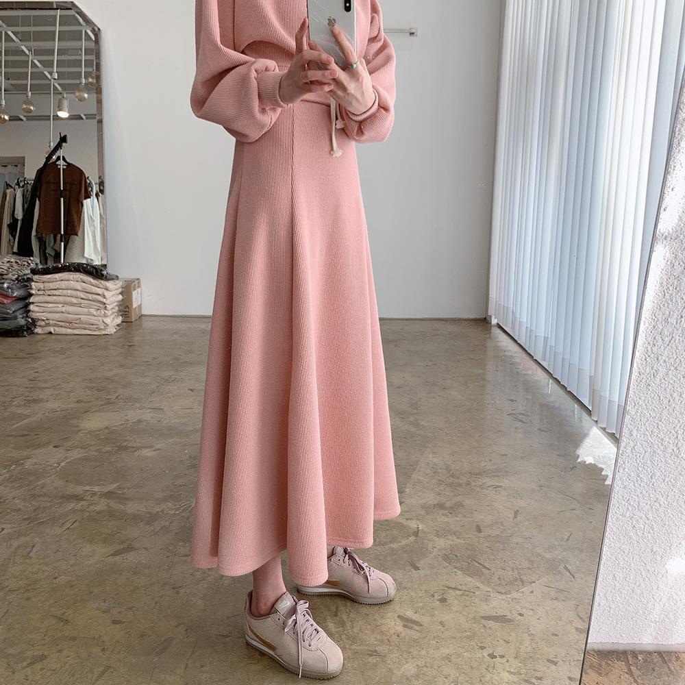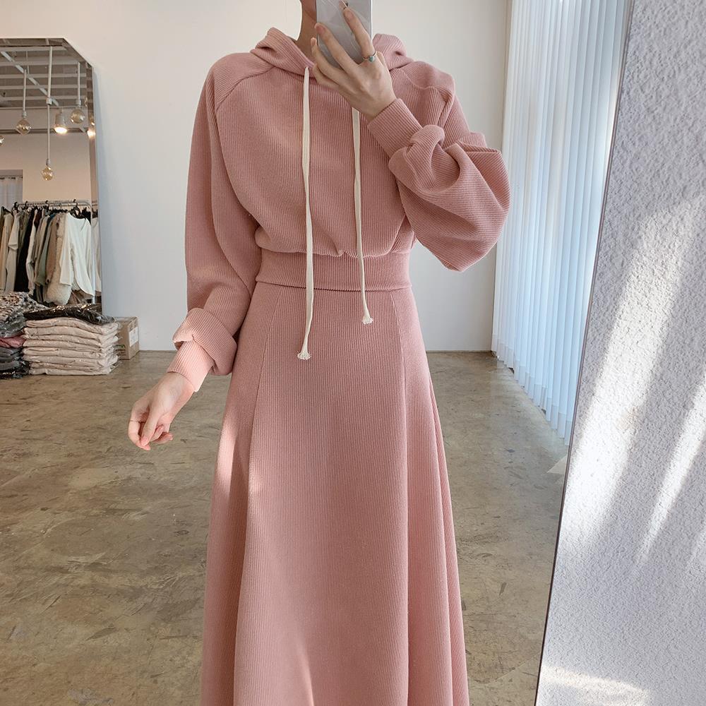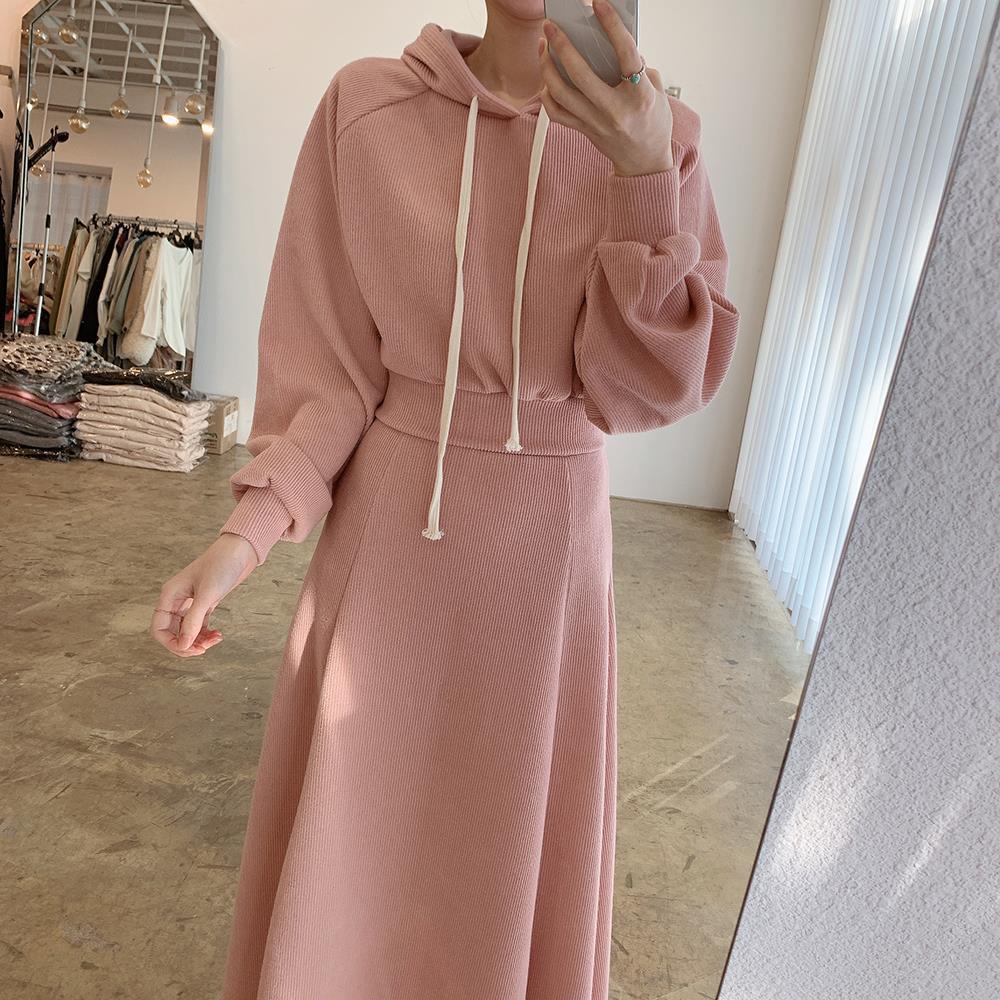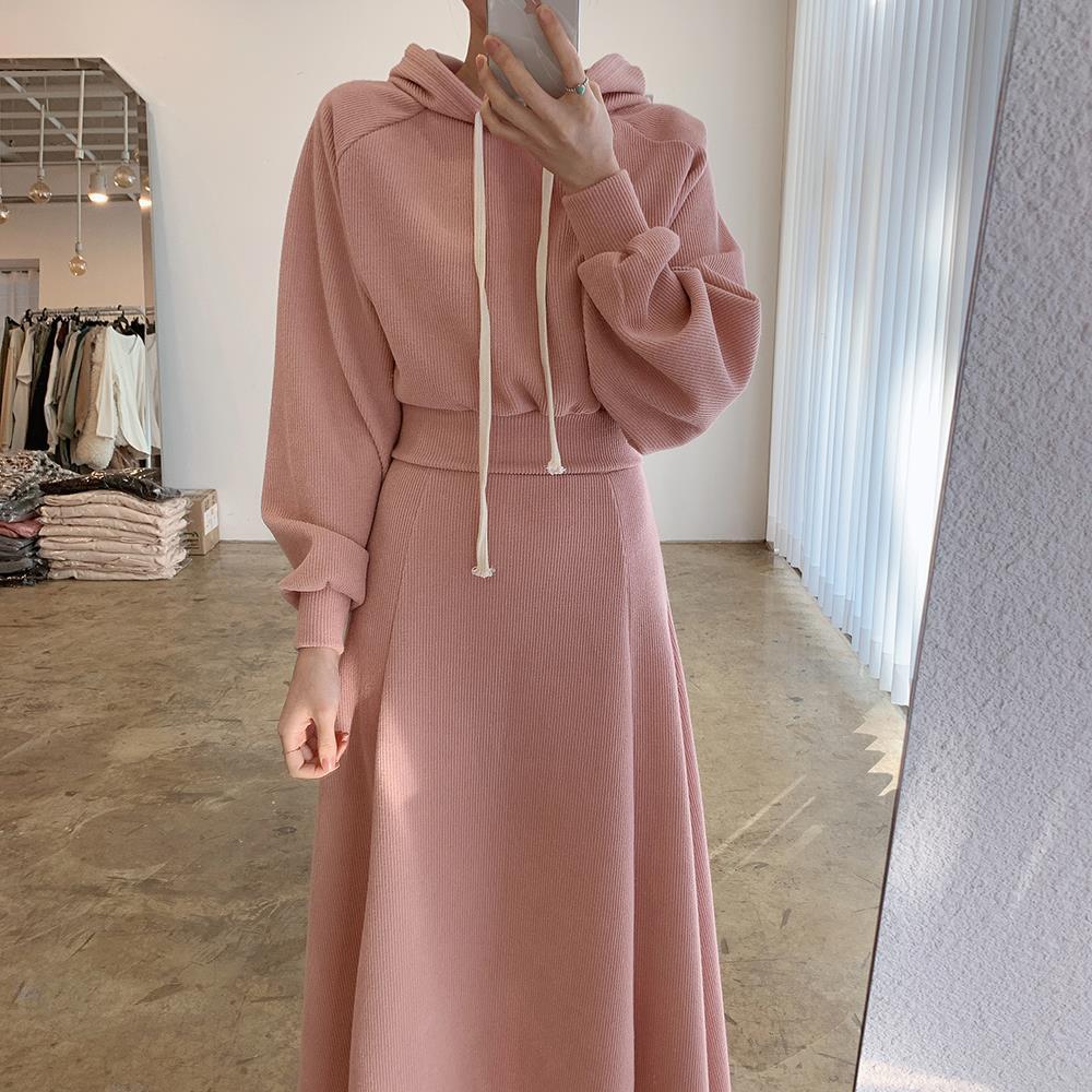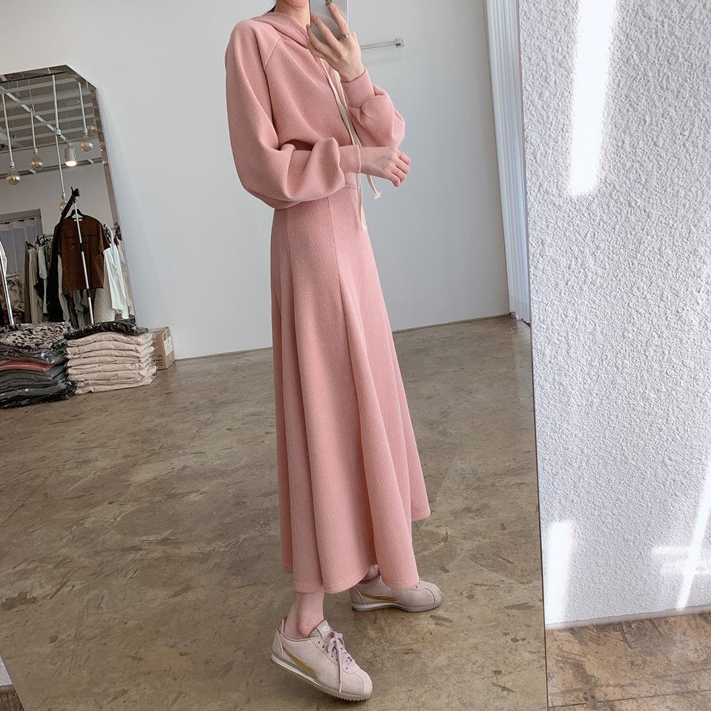 세트 여성 in 가을과 겨울 세련된 느슨한 긴팔 후드 스웨터 하이 웨이스트 A-라인 롱 스커트 투피스 세트스토어 가기