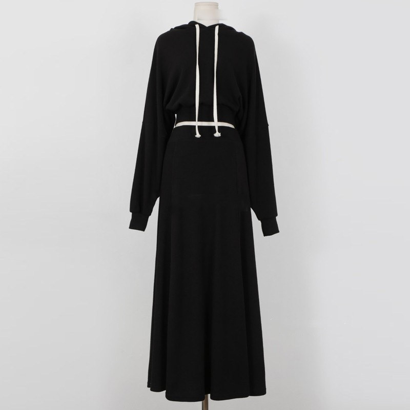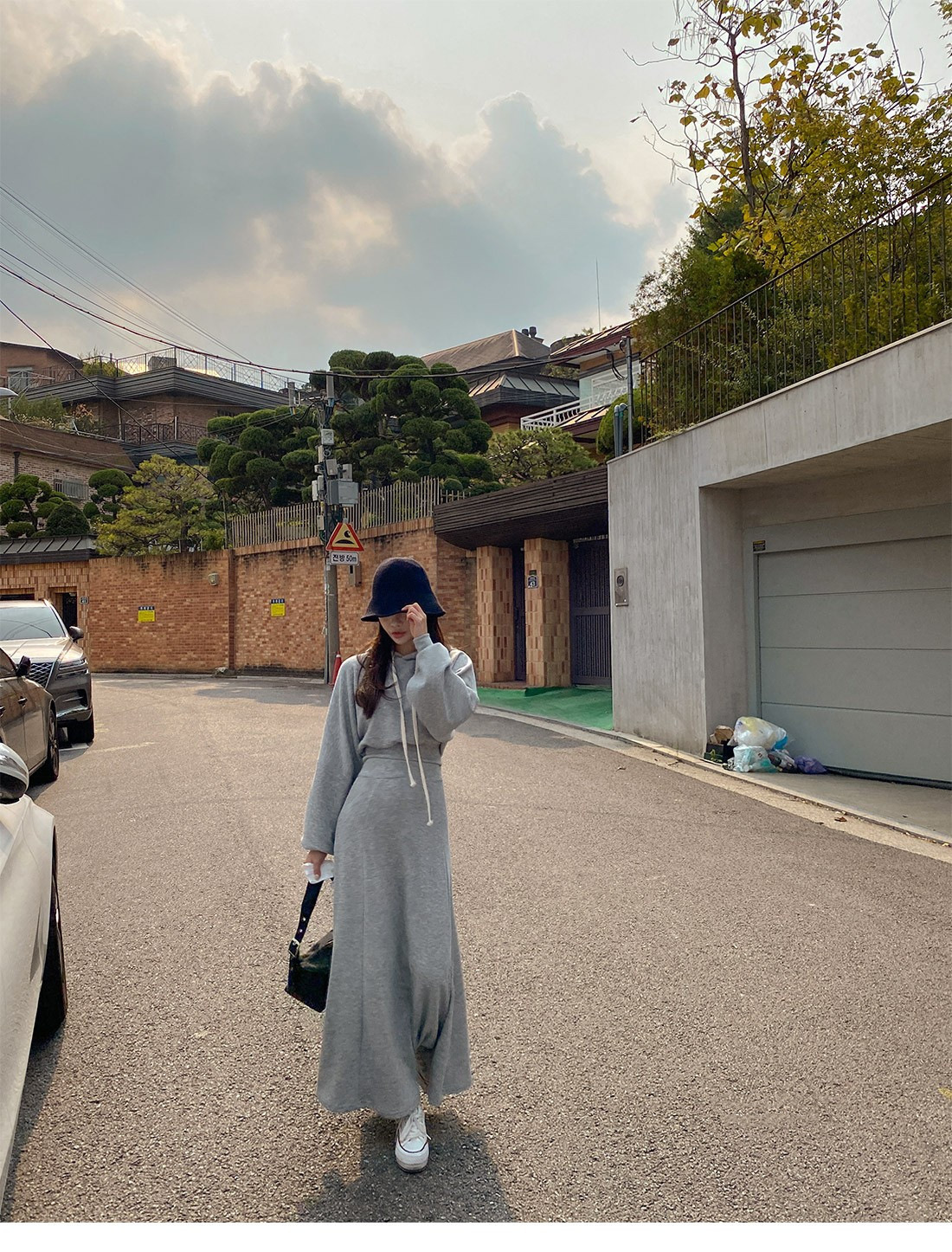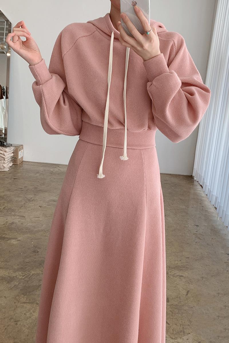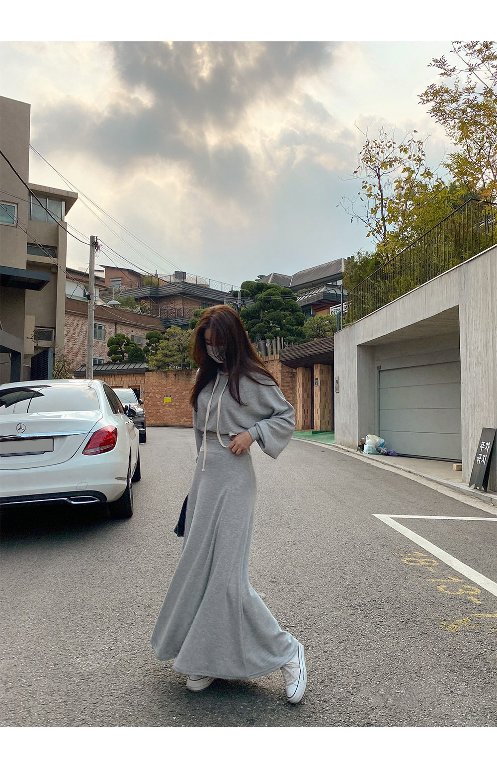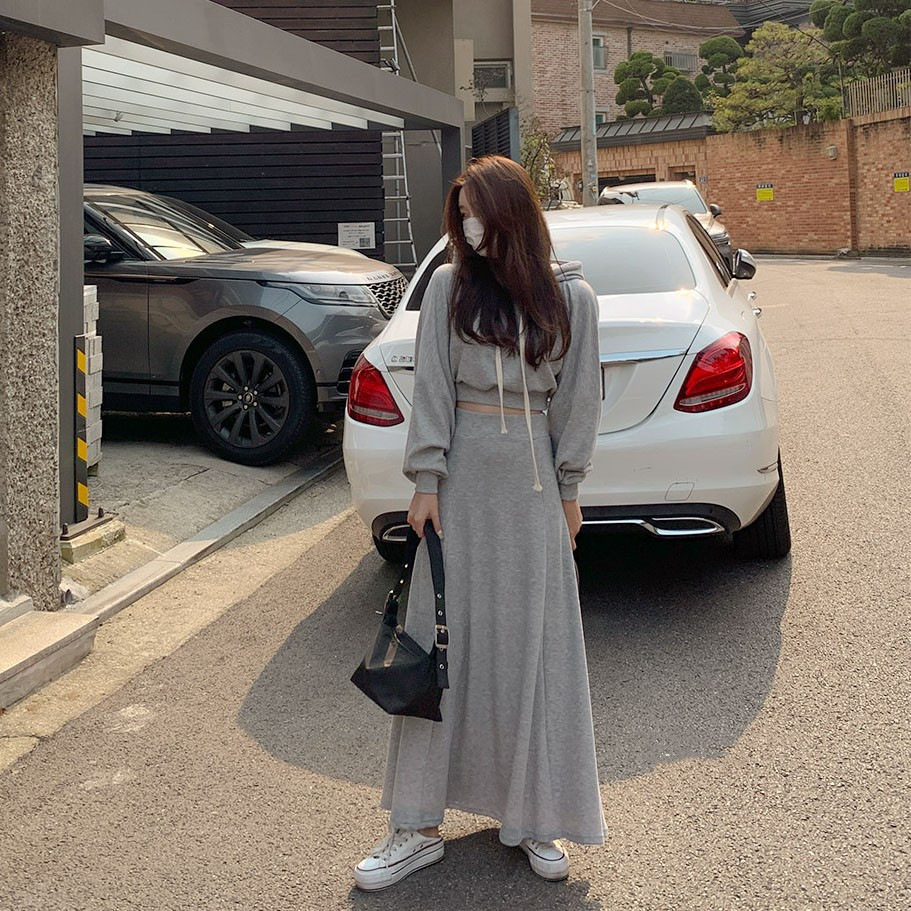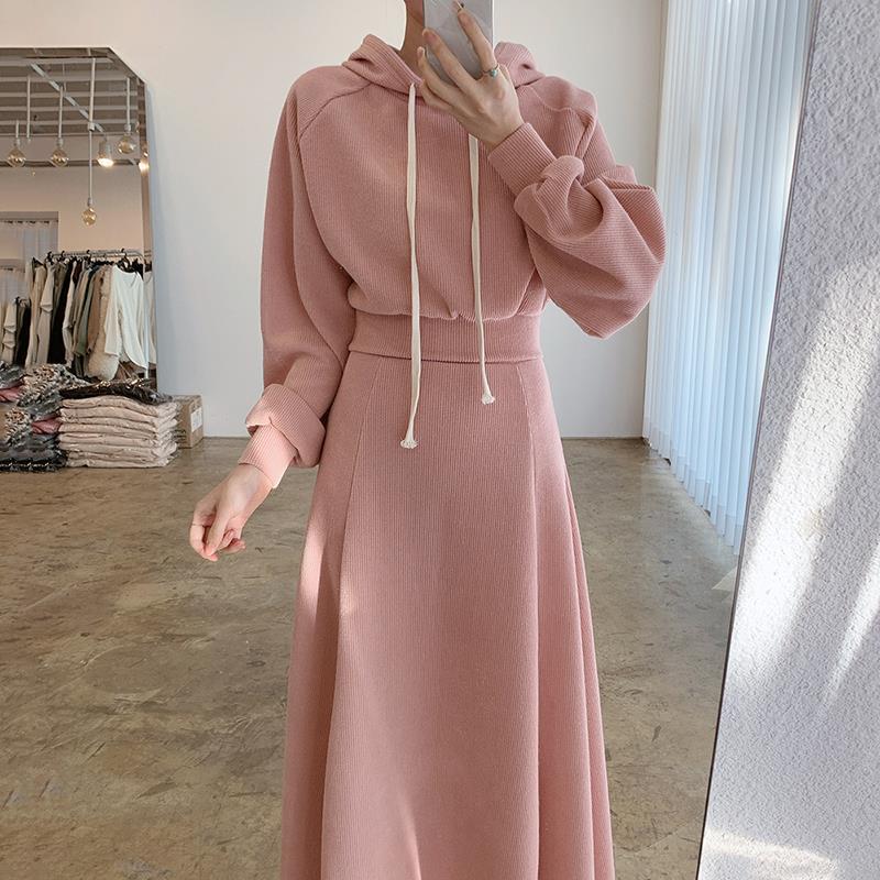 세트 여성 in 가을과 겨울 세련된 느슨한 긴팔 후드 스웨터 하이 웨이스트 A-라인 롱 스커트 투피스 세트스토어 가기