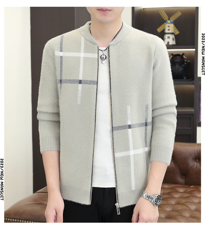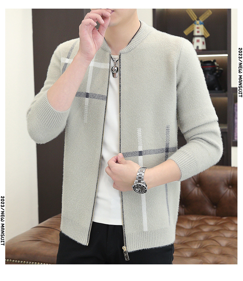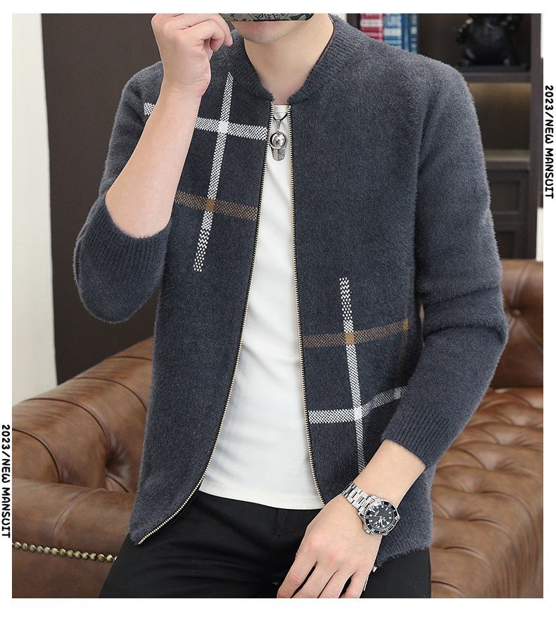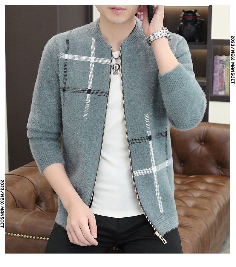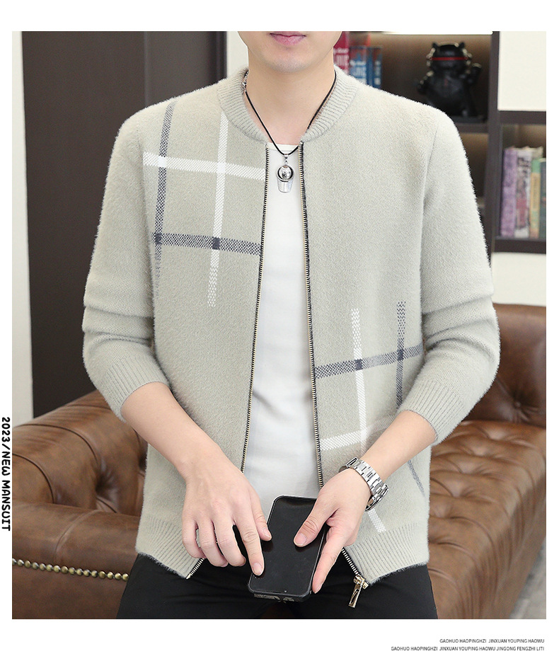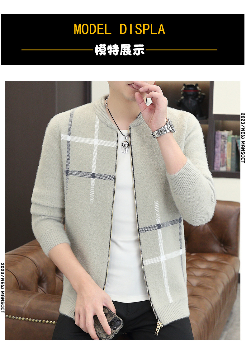 2023 새로운 니트 카디건 남성용 스웨터 모조 밍크 벨벳 캐주얼 야구 칼라 남성용 지퍼 재킷