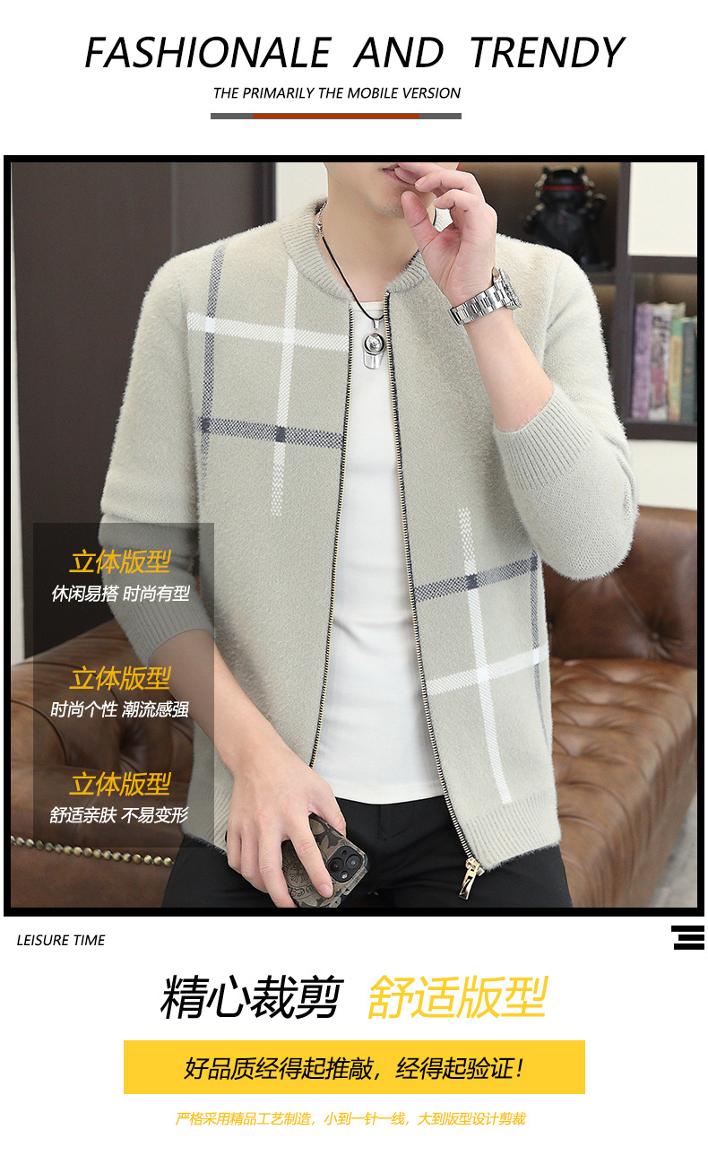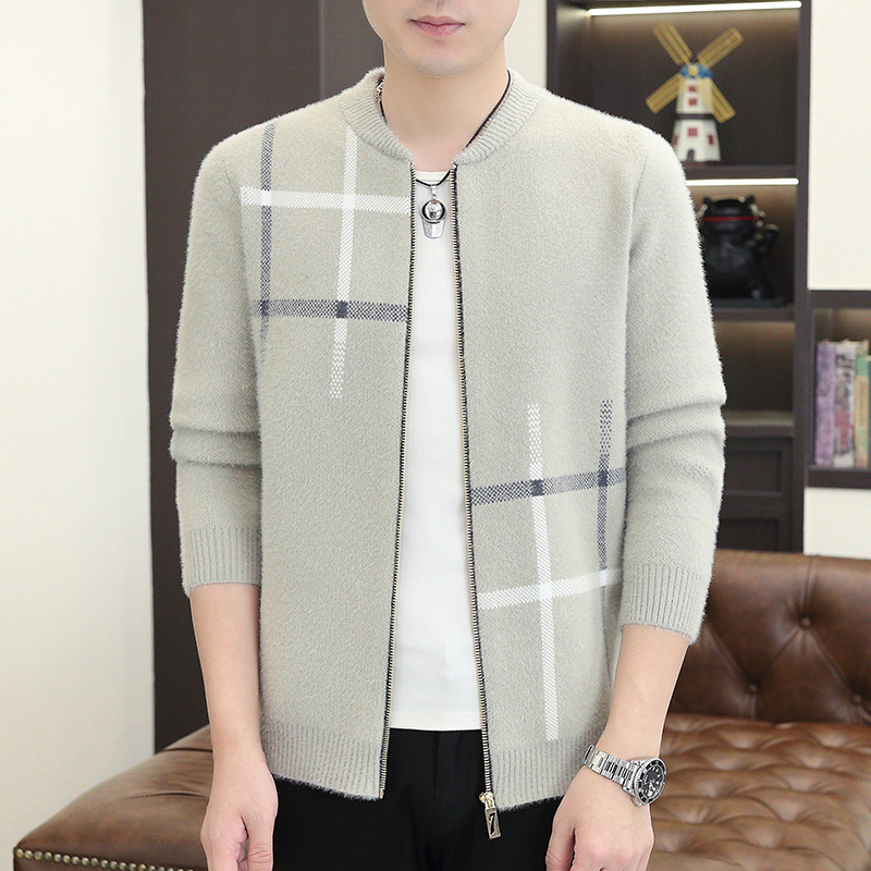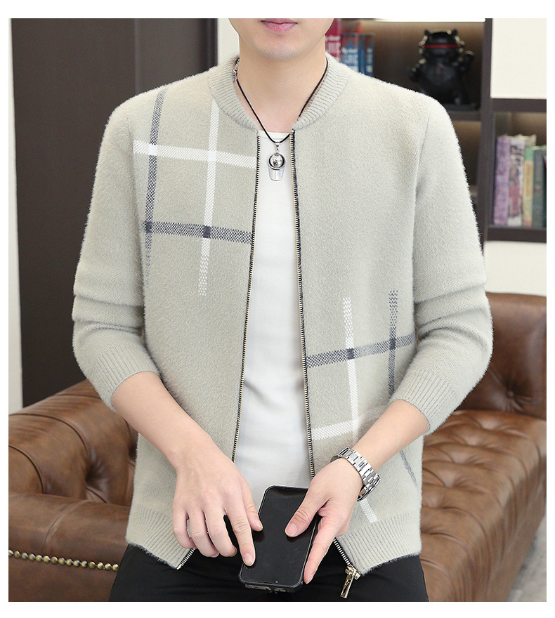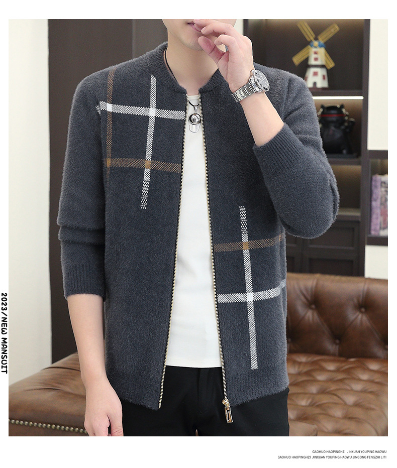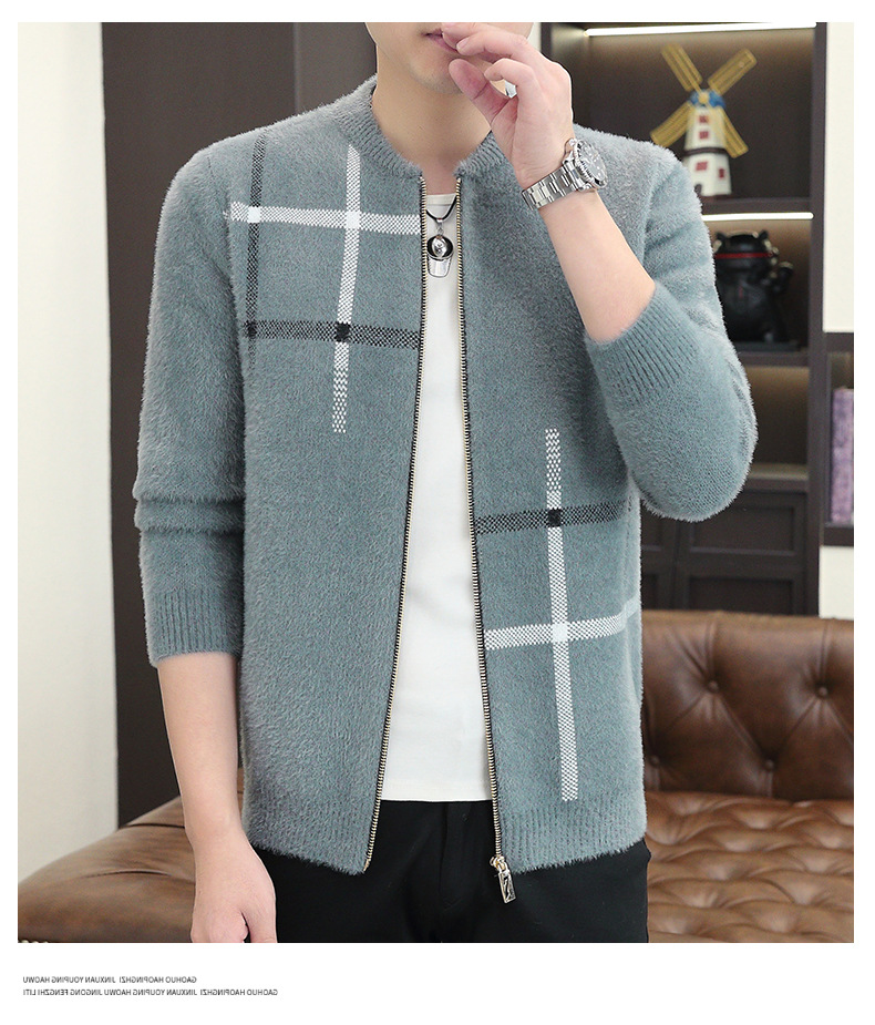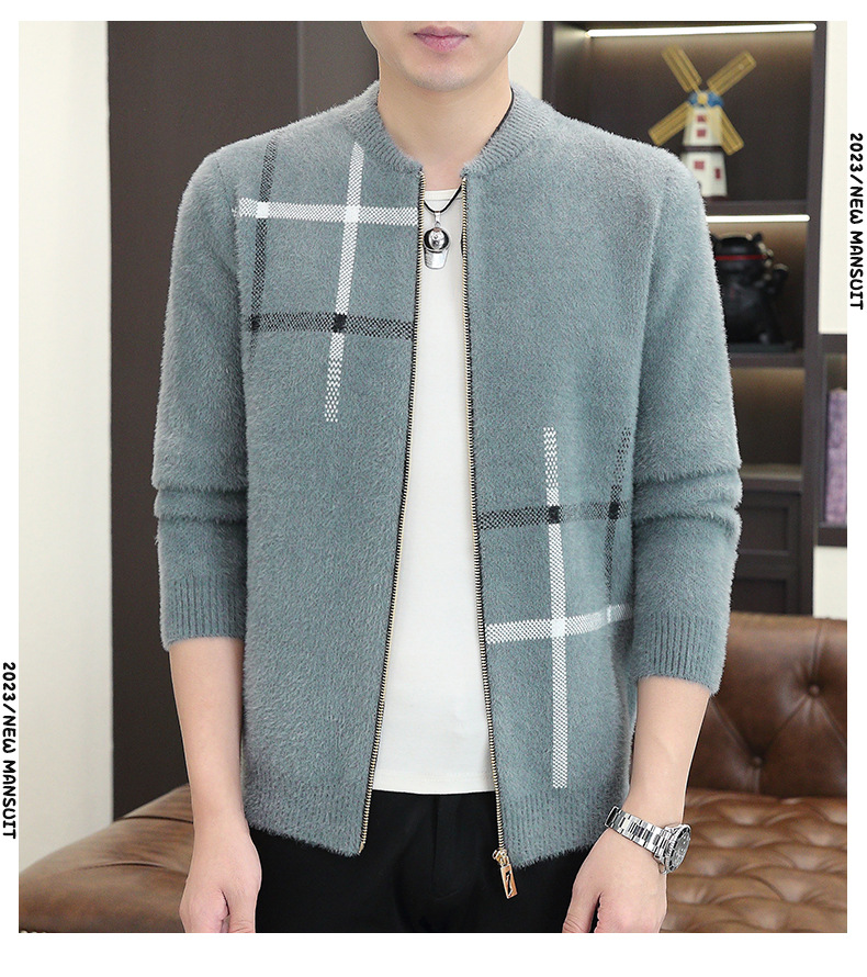 2023 새로운 니트 카디건 남성용 스웨터 모조 밍크 벨벳 캐주얼 야구 칼라 남성용 지퍼 재킷