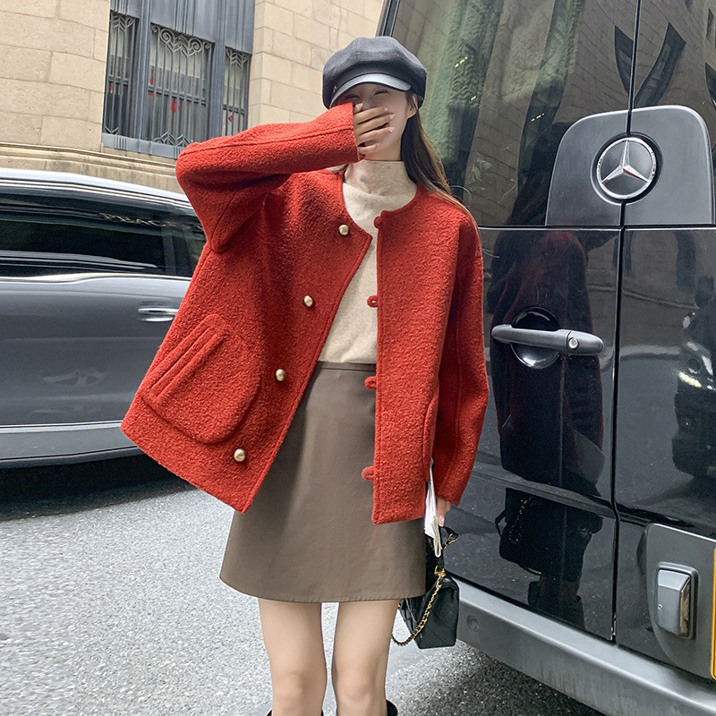 항저우 Yilin 의류 2023 유행 레트로 메탈 싱글 브레스트 라운드 넥 느슨한 슬리밍 레드 모직 코트 여성용스토어 가기