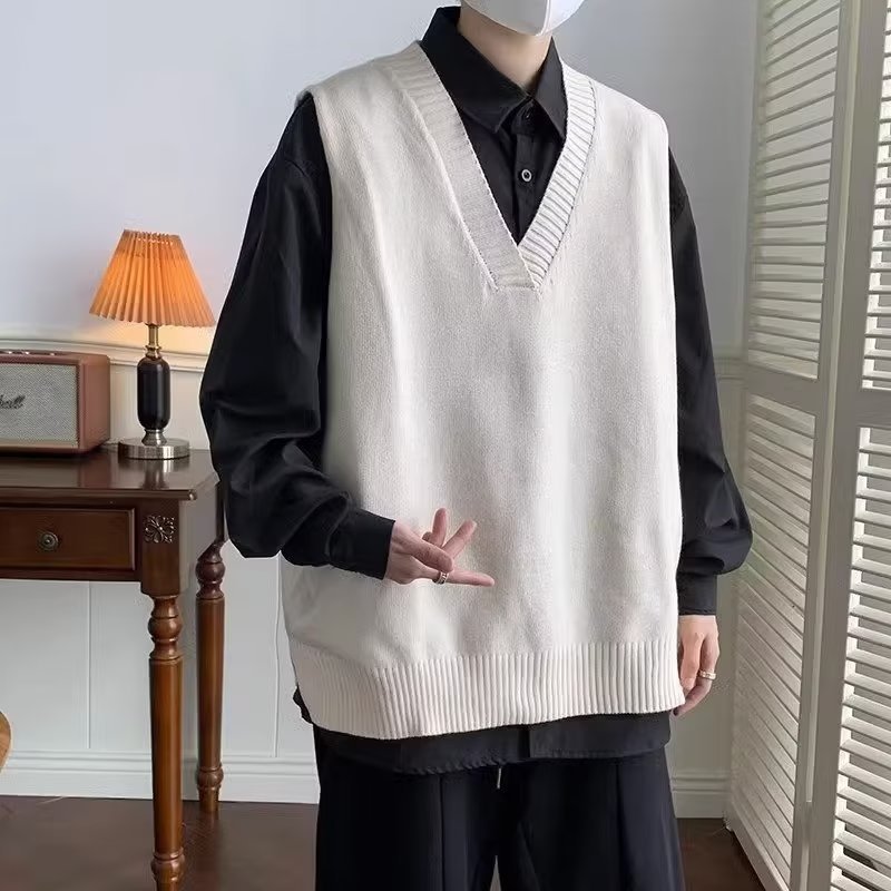 봄과 가을 다크 브라운 V-넥 모직 조끼 남자의 인스 타 그램 인기 브랜드 느슨한 캐주얼 민소매 스웨터 한국 유행 스웨터스토어 가기