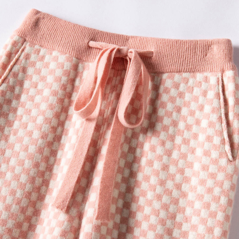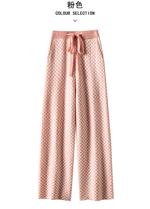 100% 울 두꺼운 체크 무늬 니트 와이드 팬츠 여성용 키 큰 겉옷 가을과 겨울 스트레이트 울 팬츠 포켓