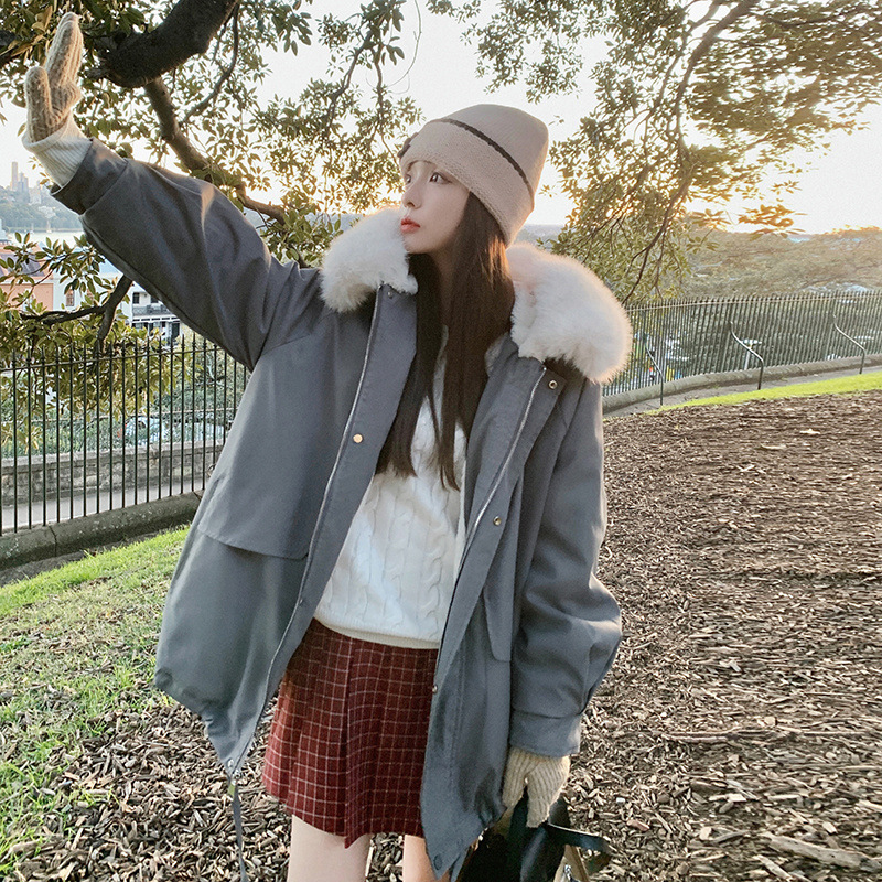 항저우 이린 의상 2023 느슨한 후드 대형 모피 칼라 캐주얼 모든 일치 밑단 드로스트링 그레이 파커 코튼 패딩 코트 여성