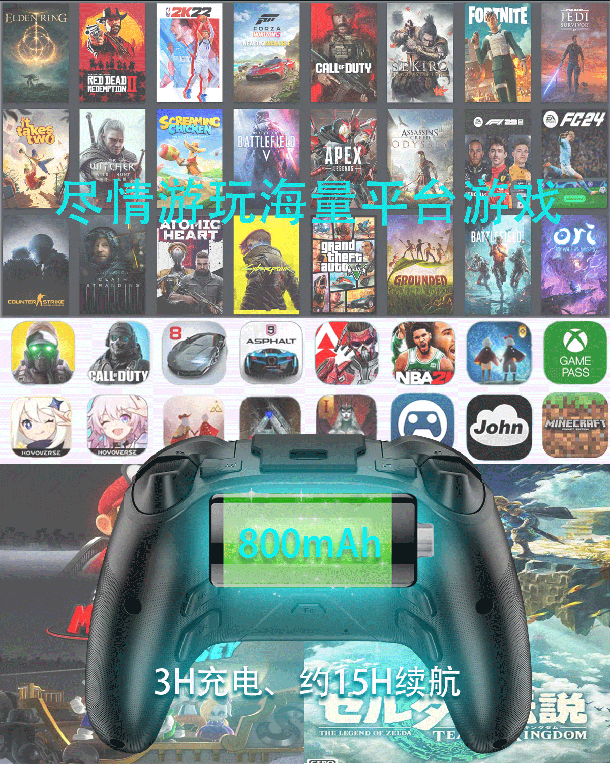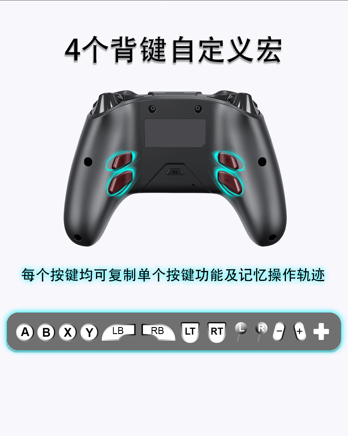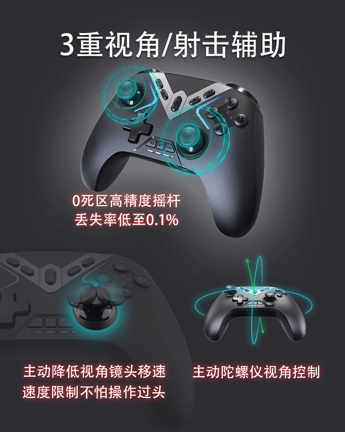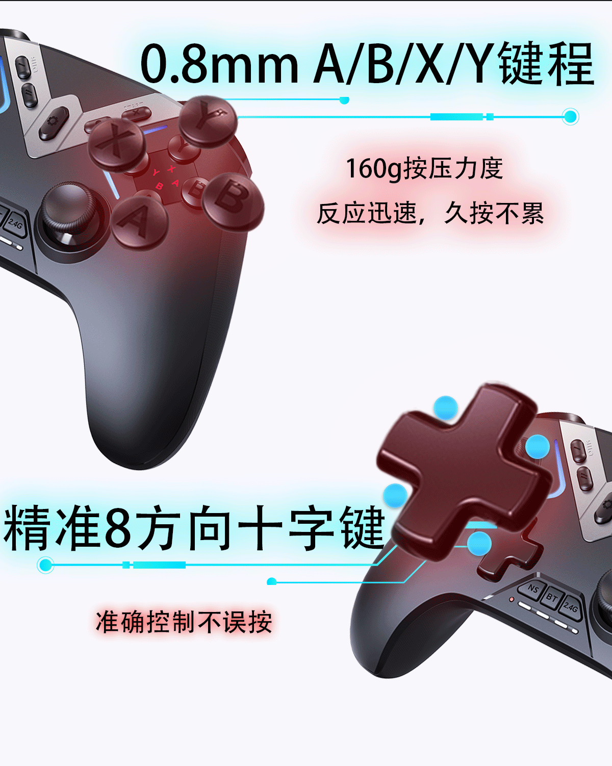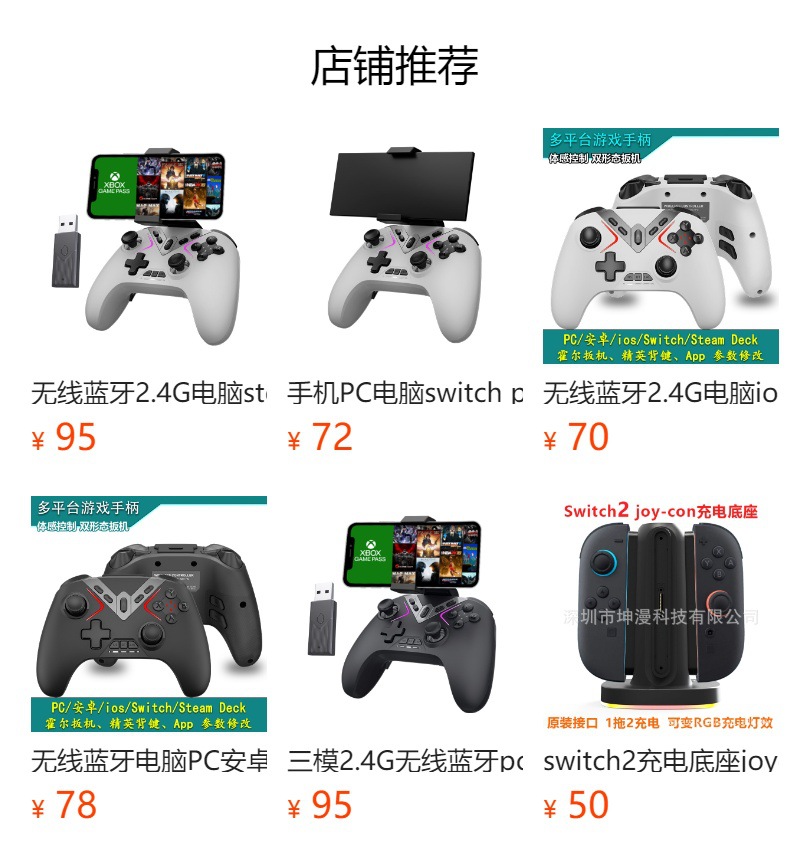 3模一键连接,快速/霍尔双板机,4背键宏定义,APP自定义设置,高精度无死区摇杆,全平台体感映射,自适应ABXY按键等;(详细功能请咨询客服)