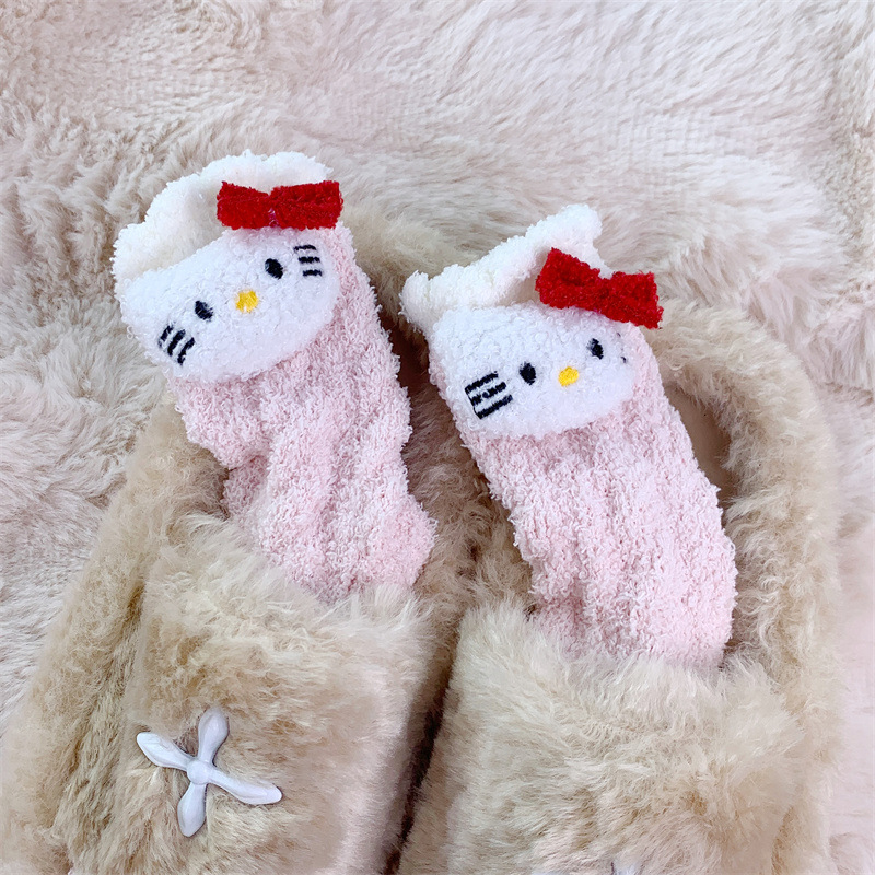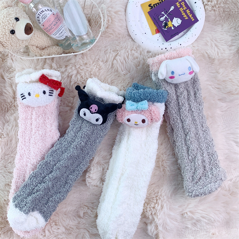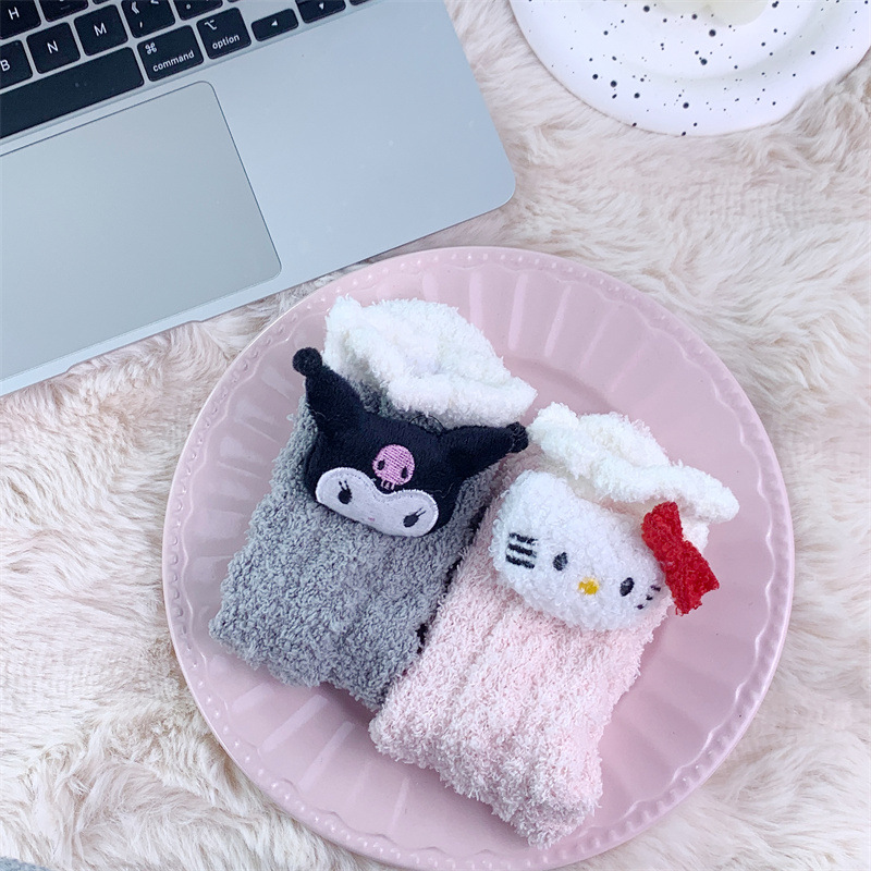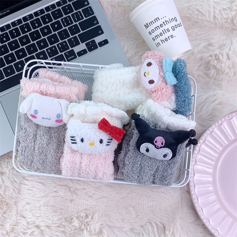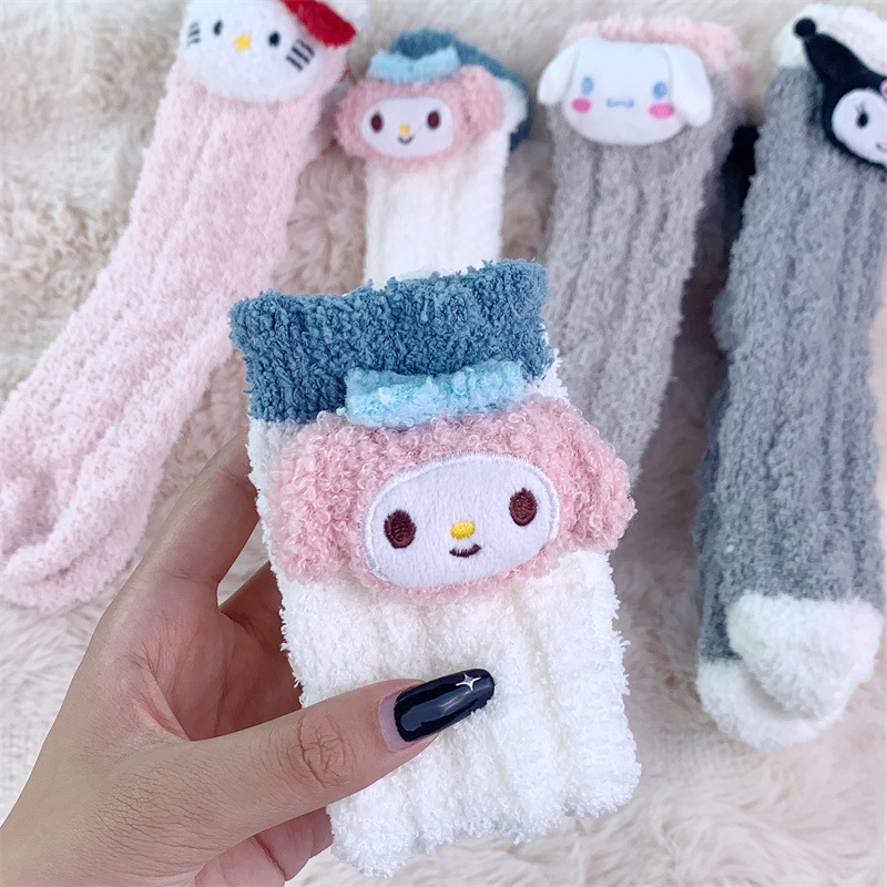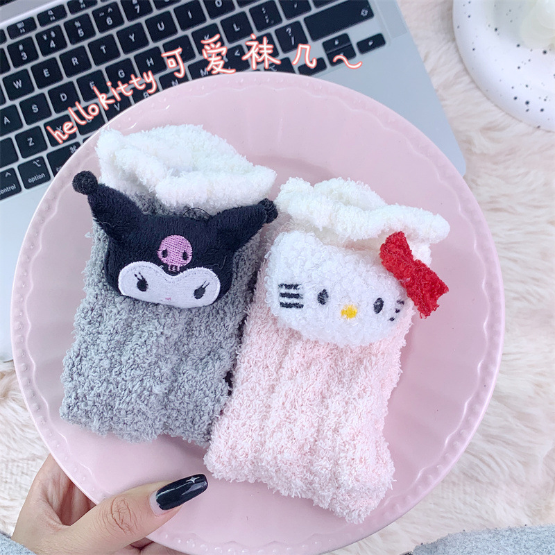 산리오 새로운 산호 양털 양말 통기성 두꺼운 따뜻한 흰색 로리타 귀여운 만화 잠자는 바닥 양말
