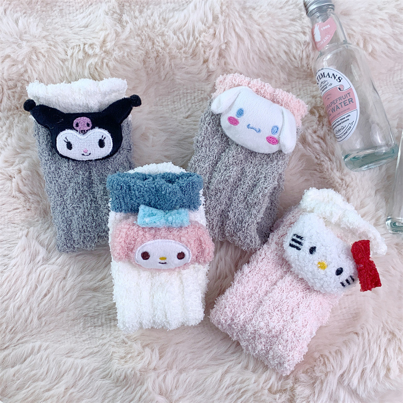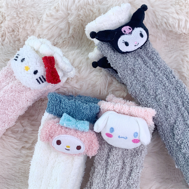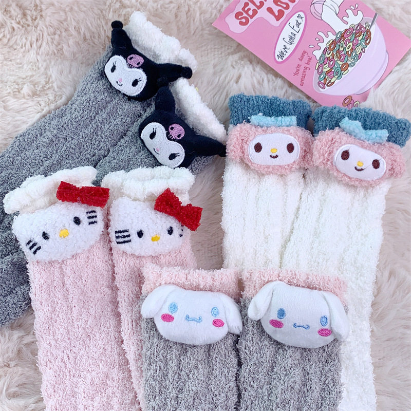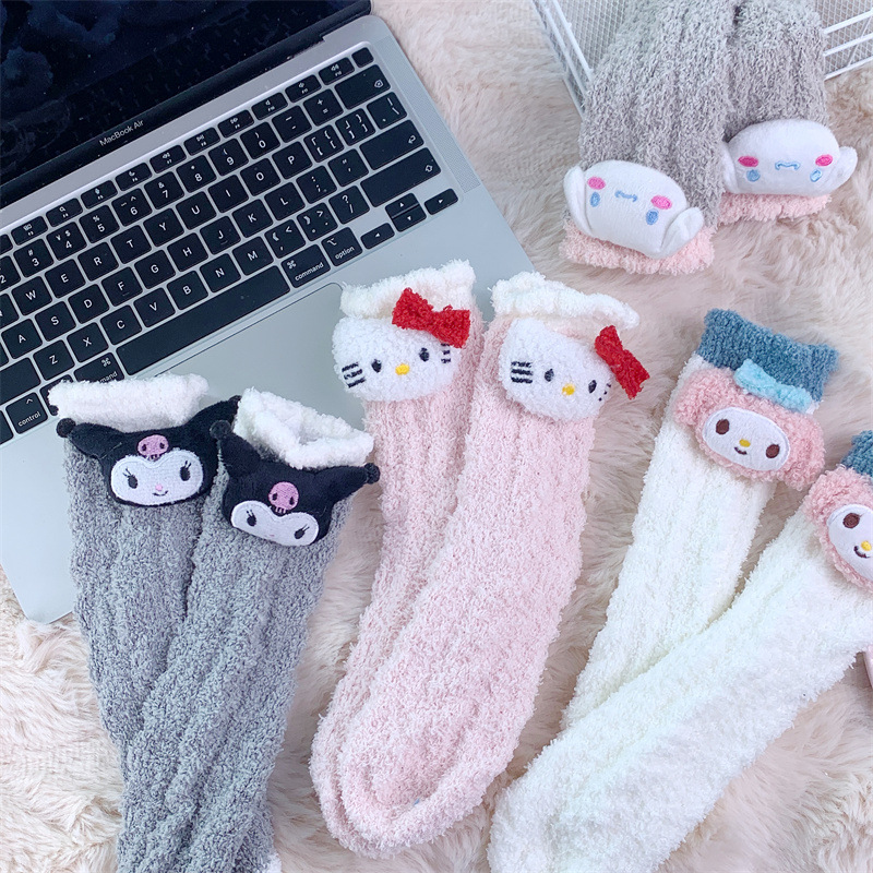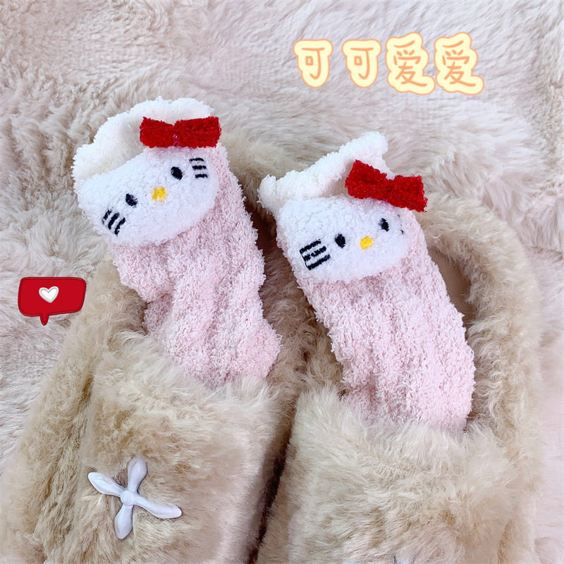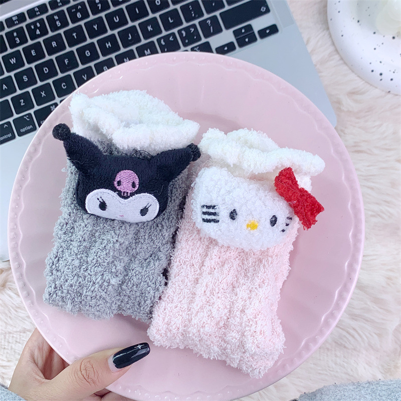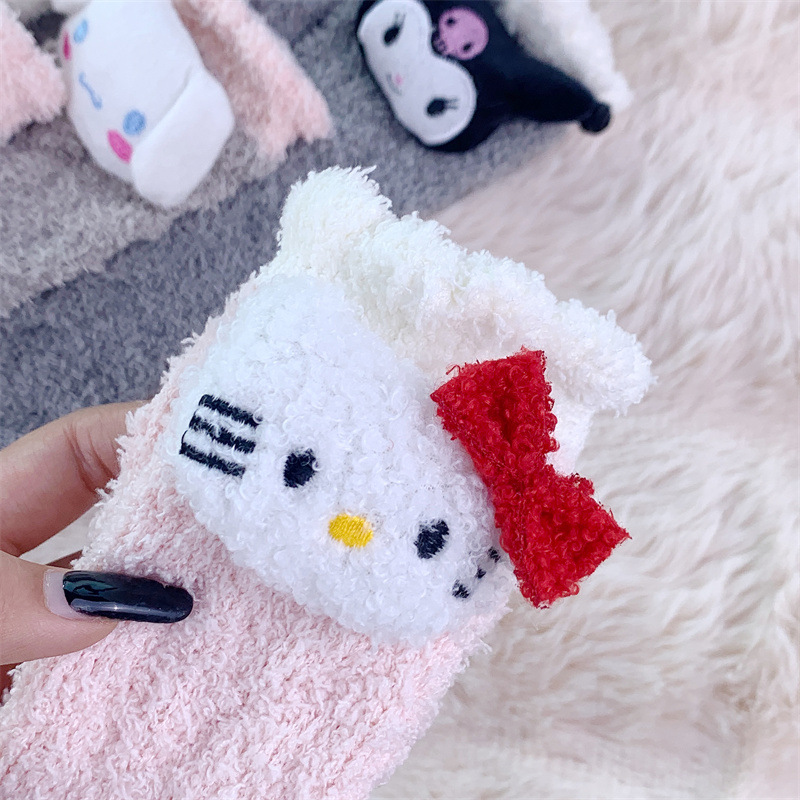 산리오 새로운 산호 양털 양말 통기성 두꺼운 따뜻한 흰색 로리타 귀여운 만화 잠자는 바닥 양말