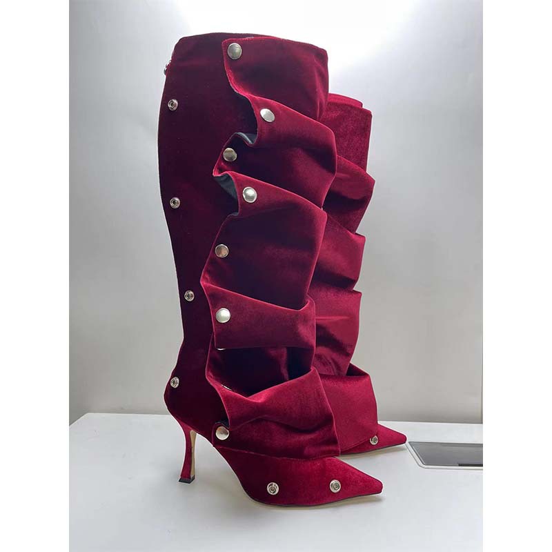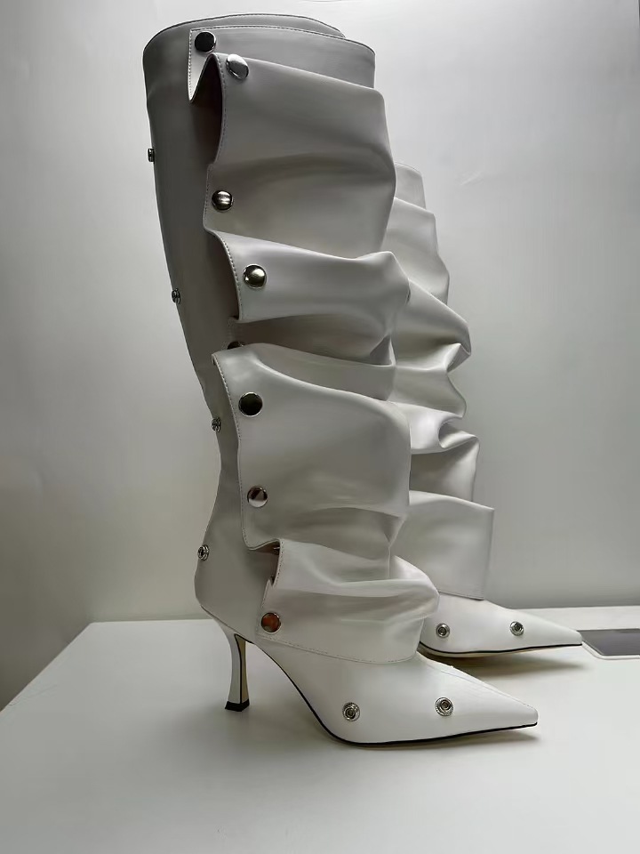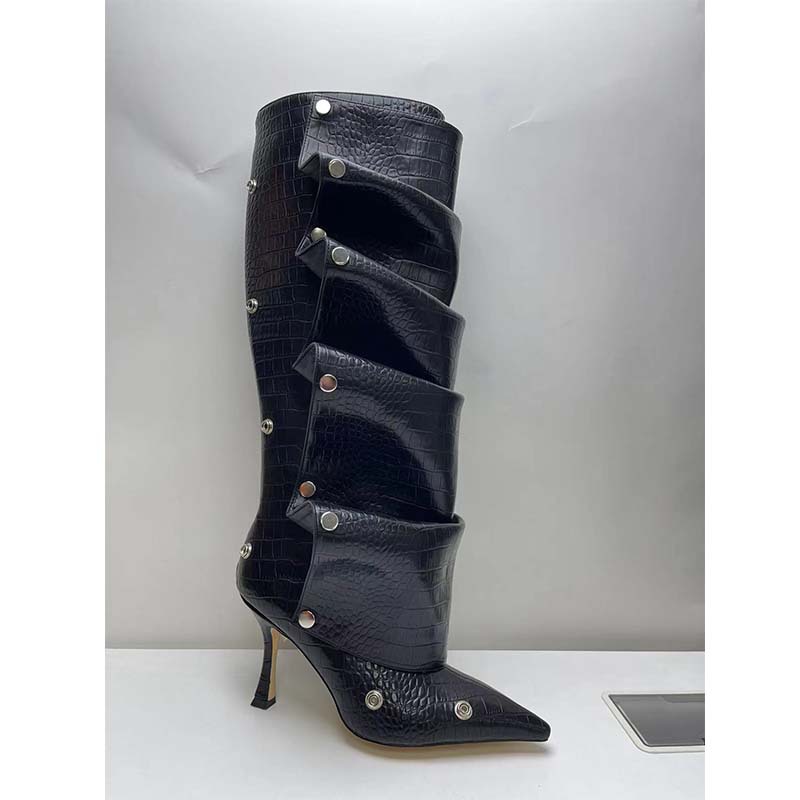 2025년 신상품 하이힐 뾰족코 메탈 스터드 데님 배색 투웨이 롱부츠 (큰 사이즈 여성용)