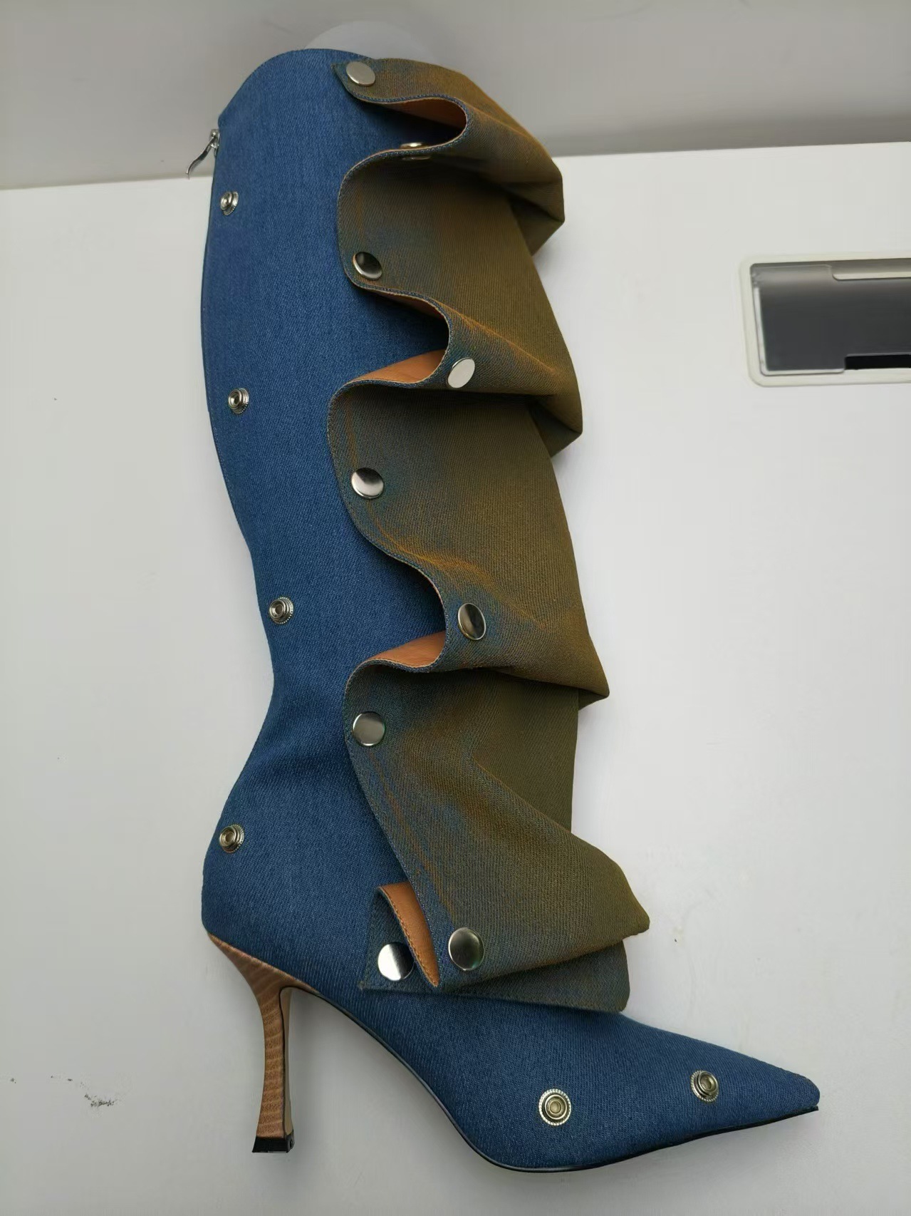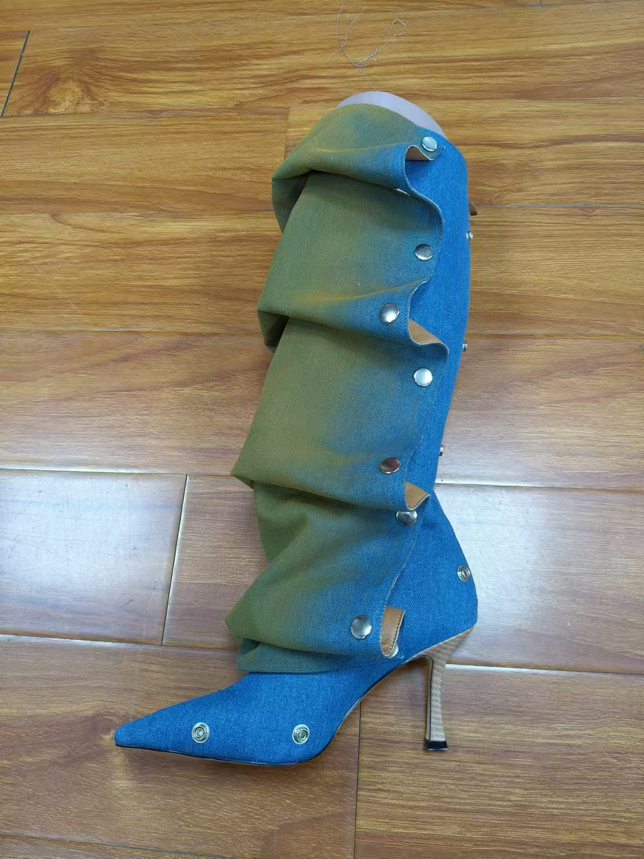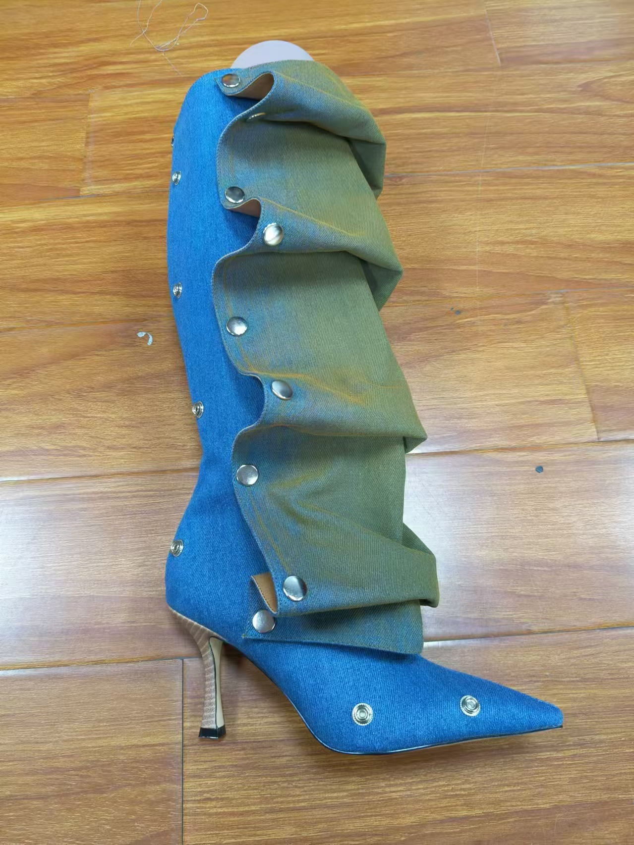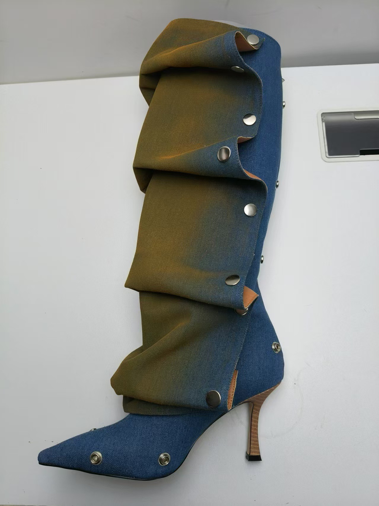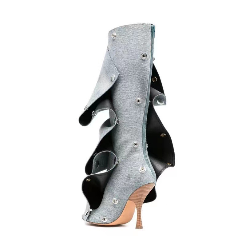 2025년 신상품 하이힐 뾰족코 메탈 스터드 데님 배색 투웨이 롱부츠 (큰 사이즈 여성용)스토어 가기