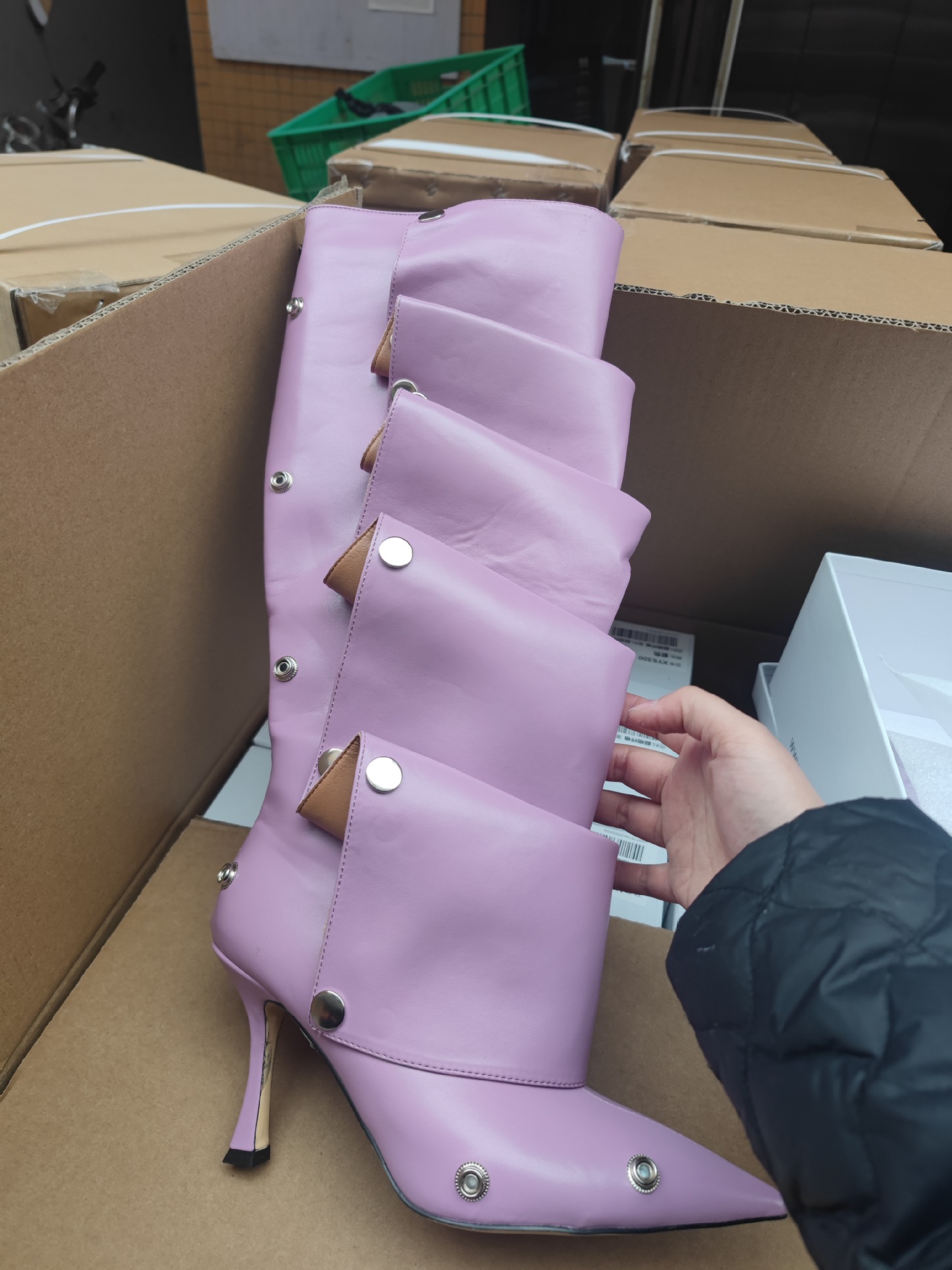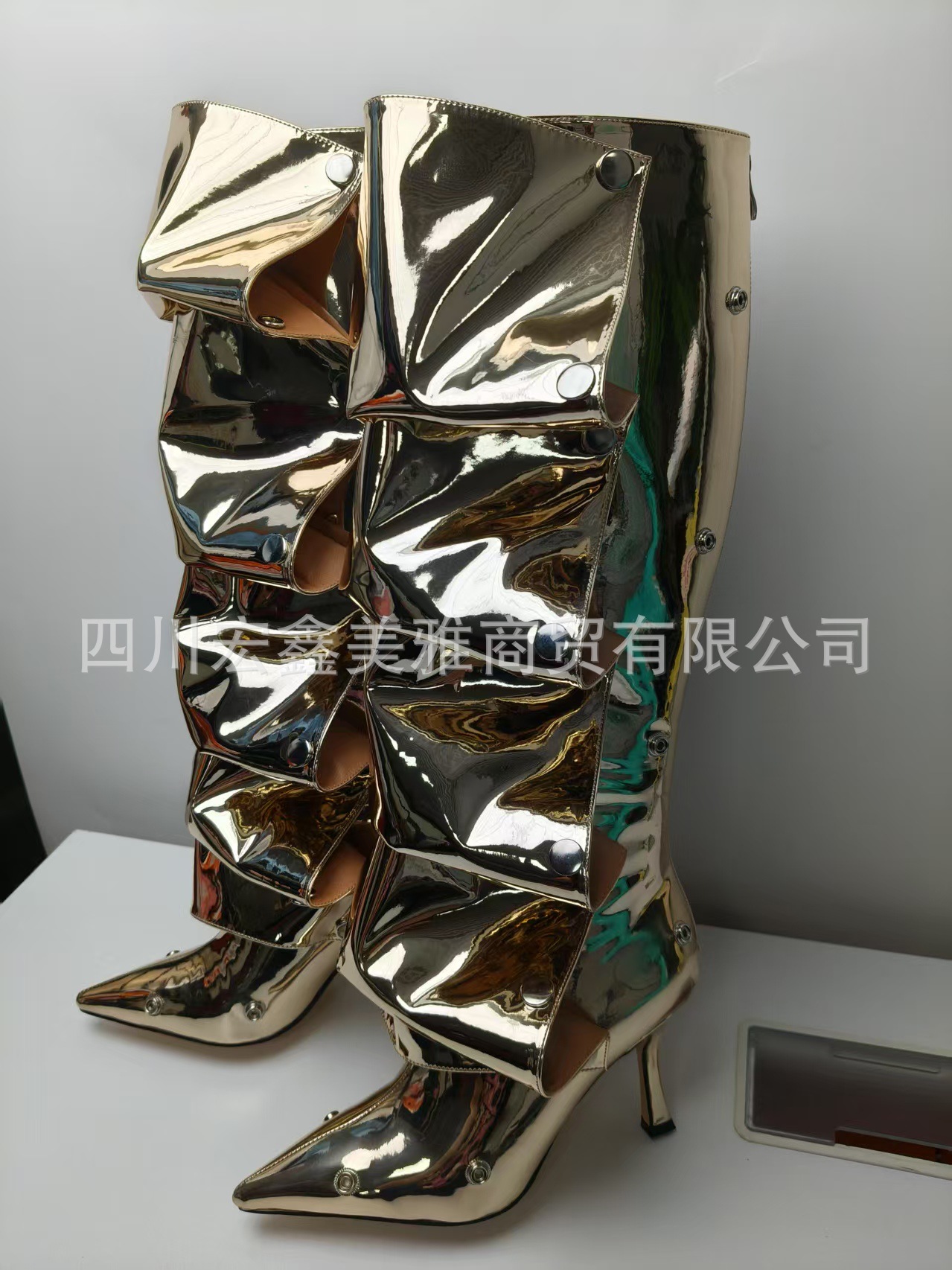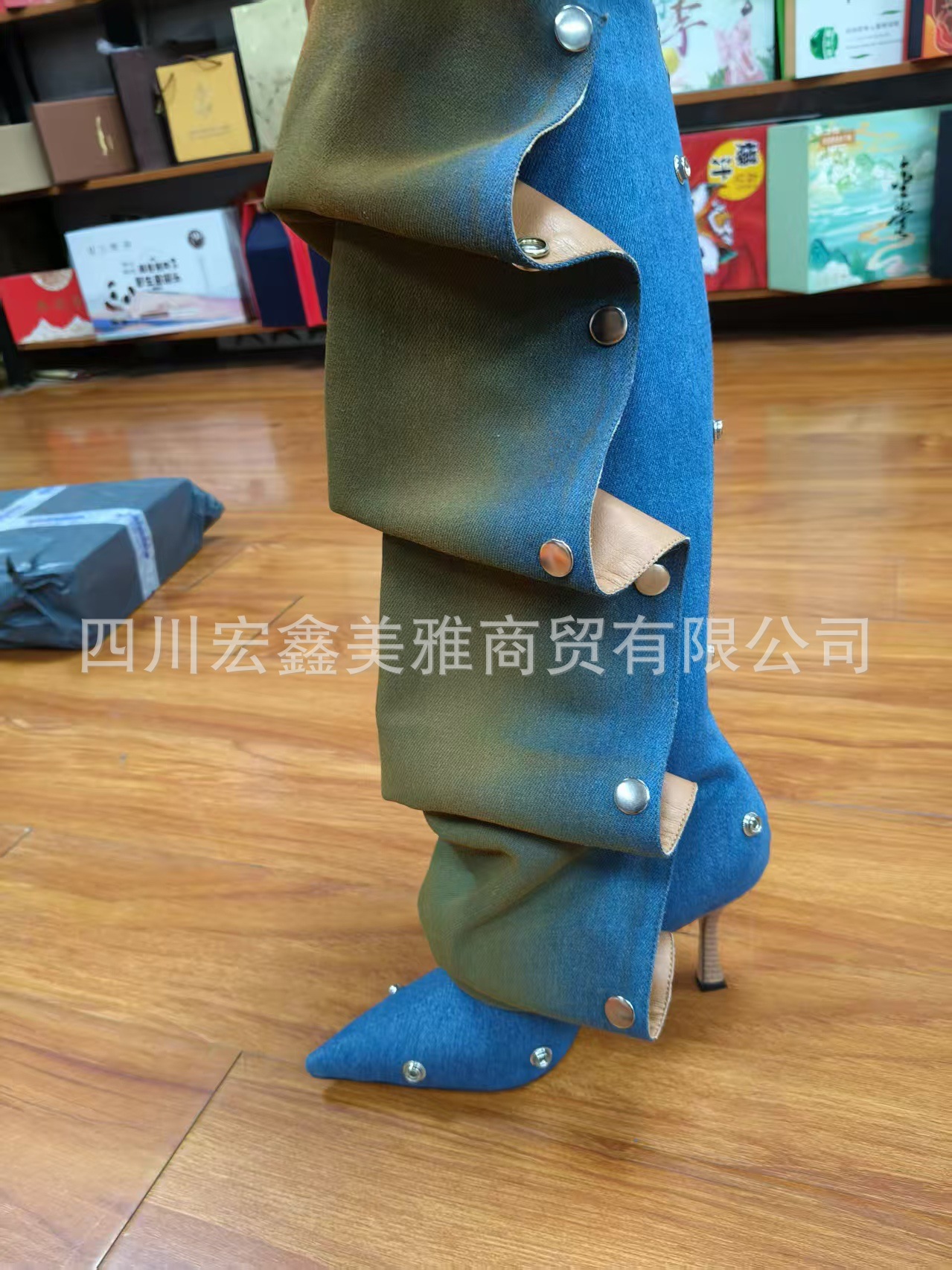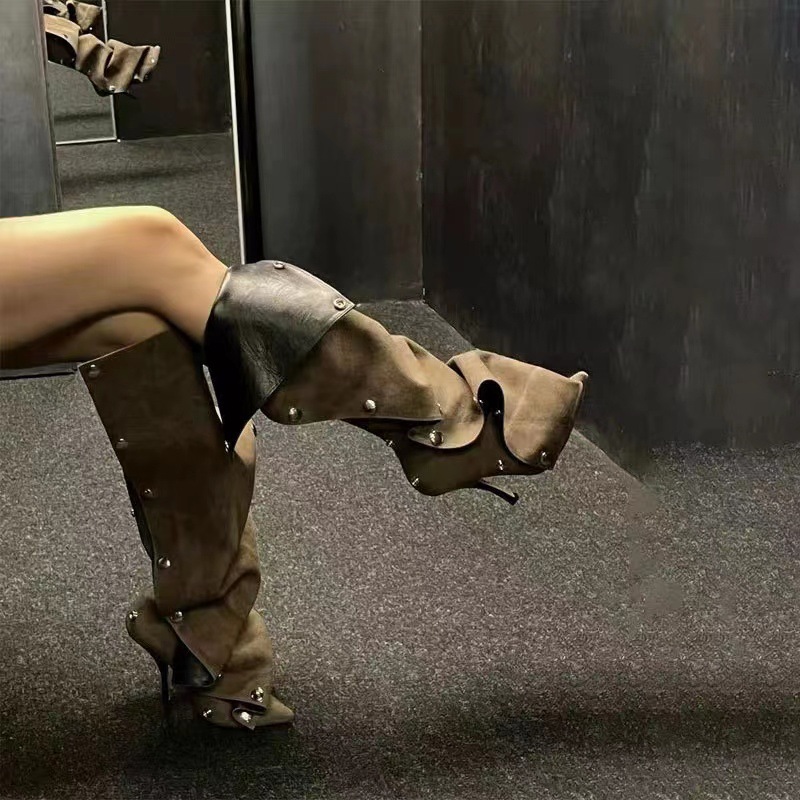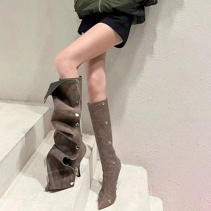 2025년 신상품 하이힐 뾰족코 메탈 스터드 데님 배색 투웨이 롱부츠 (큰 사이즈 여성용)스토어 가기