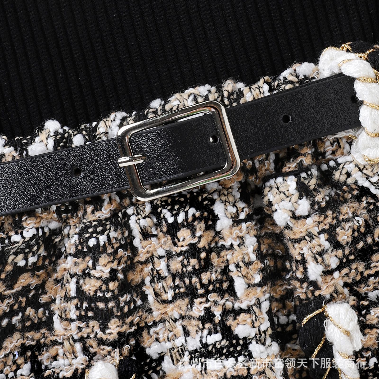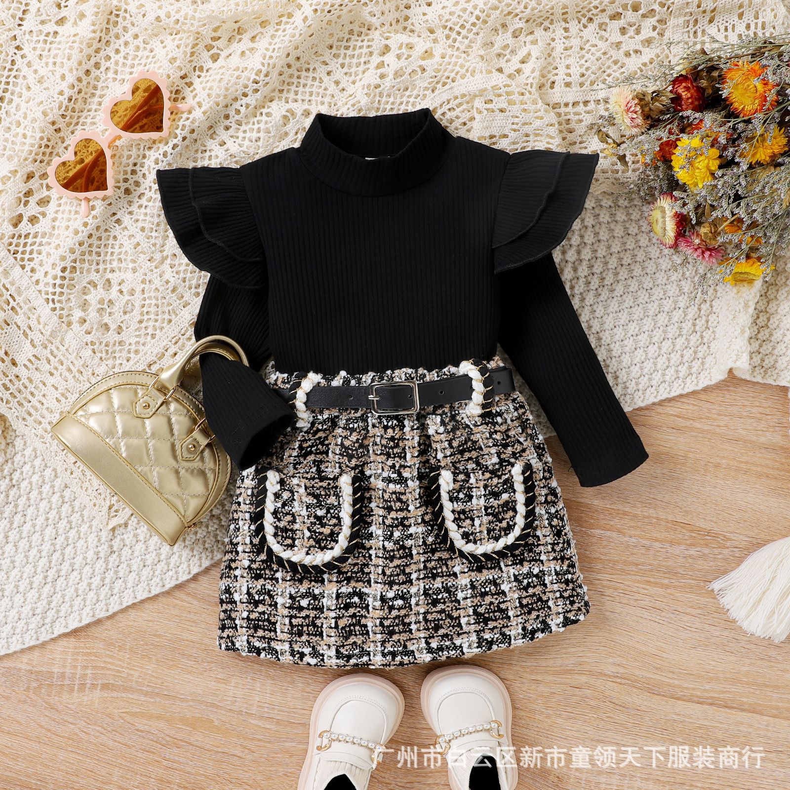 블랙 핏 스트립 하이 칼라 탑 + 체크 무늬 반바지 벨트 가을 새로운 소녀 샤넬 스타일 세트 유행 두 조각스토어 가기