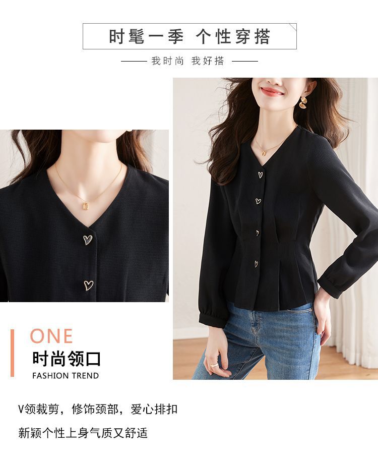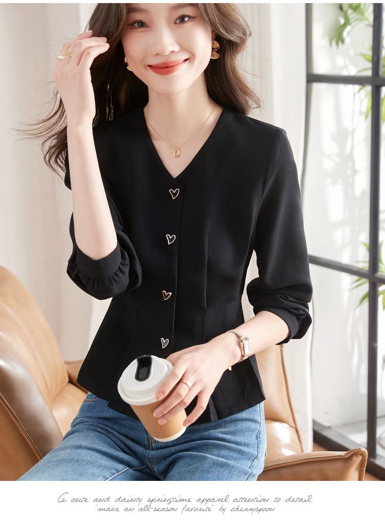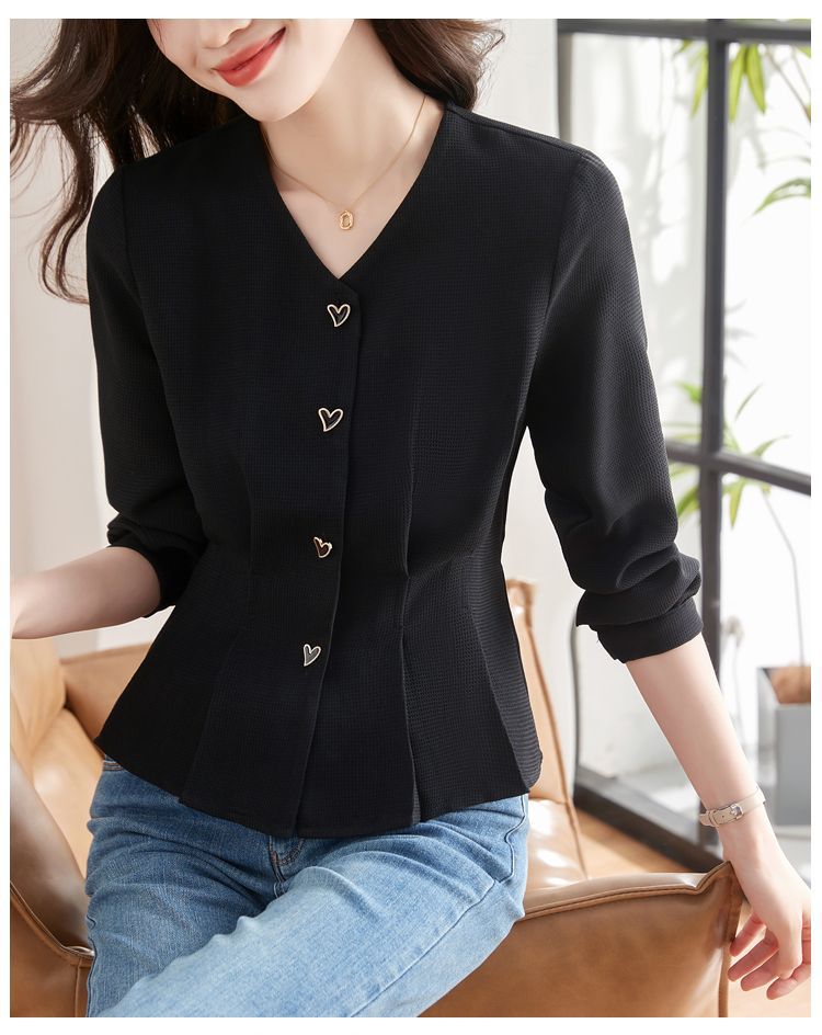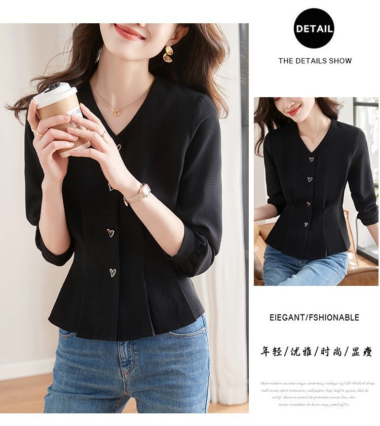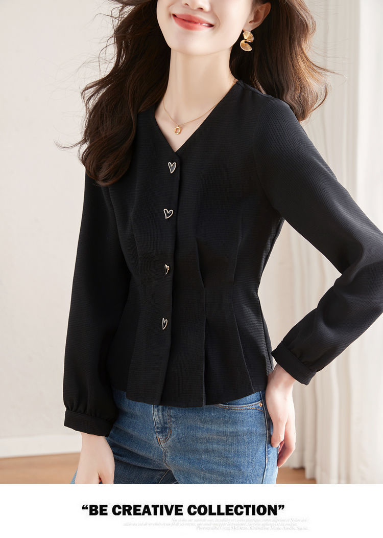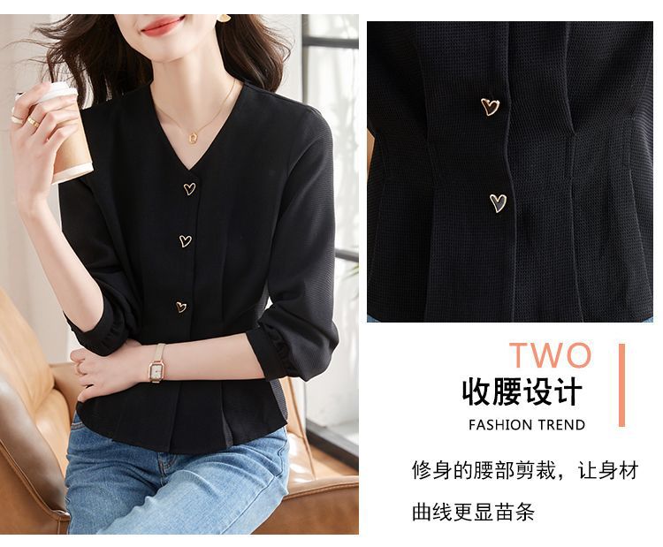 V 넥 블랙 셔츠 여성 긴팔 2025 가을 새로운 스타일 시크하고 아름다운 셔츠 느낌 허리 짧은 탑스토어 가기
