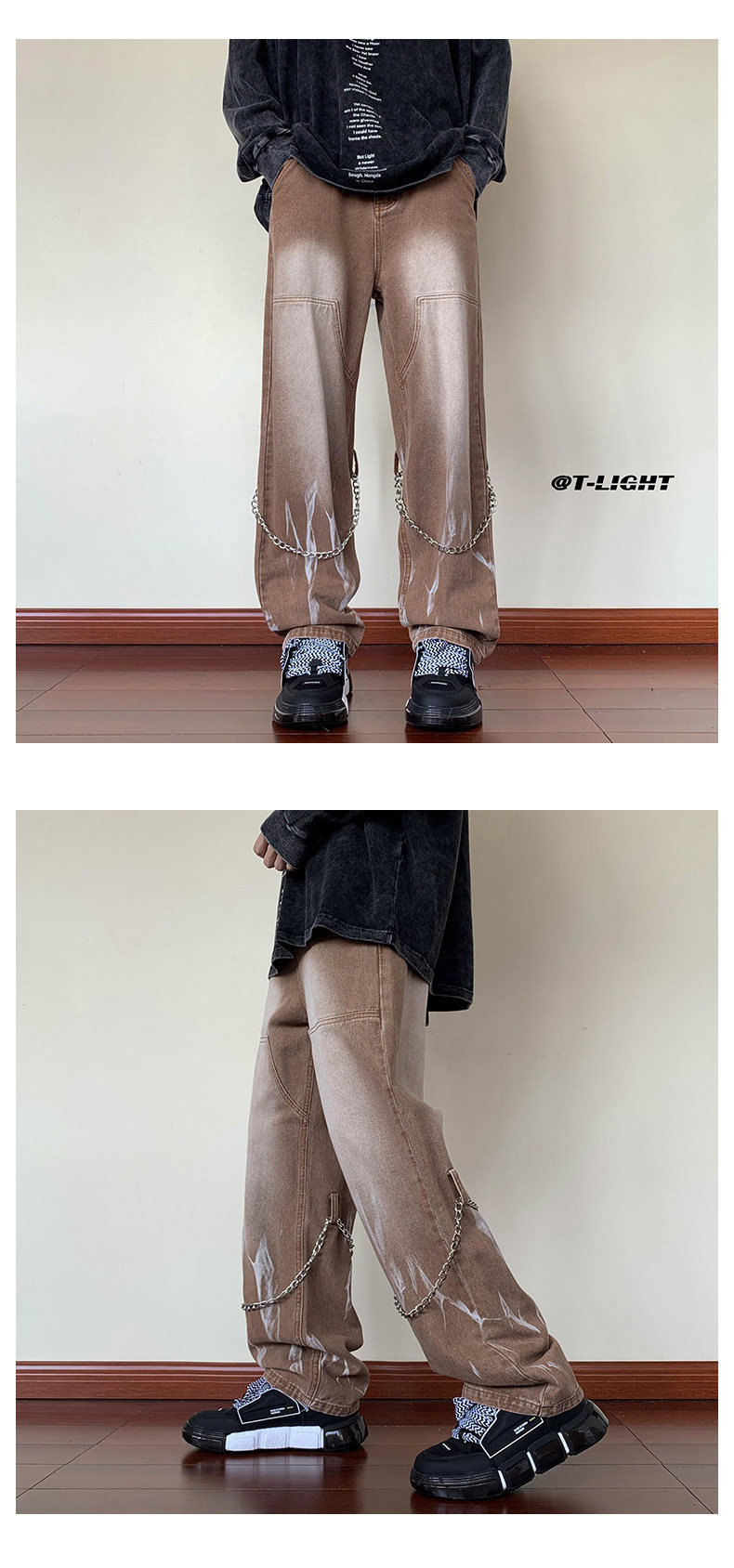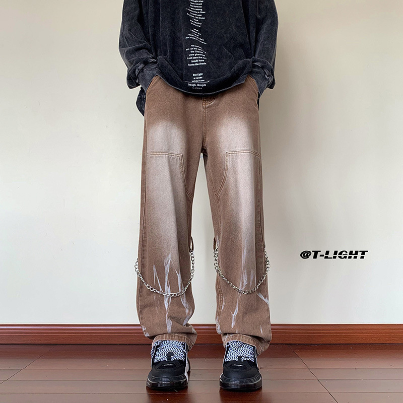 아메리칸 스타일 하이 스트리트 힙합 바지 트렌디 한 브랜드 디자인 감각 넥타이 염색 다크 브라운 청바지 남자의 느슨한 스트레이트 와이드 레그 바지