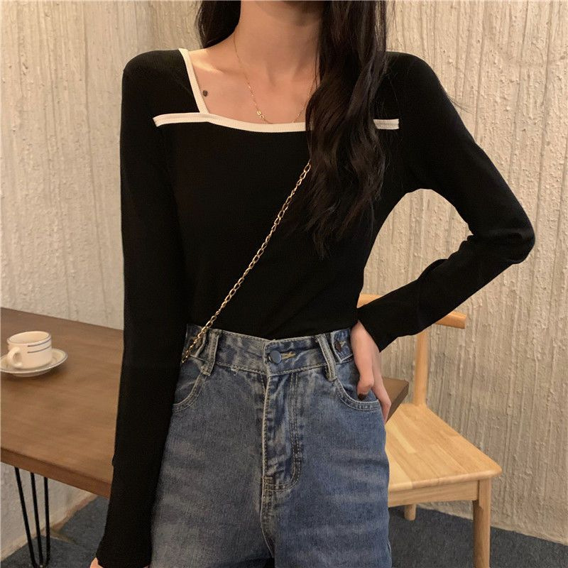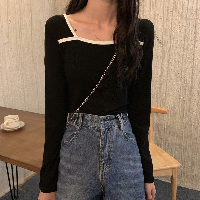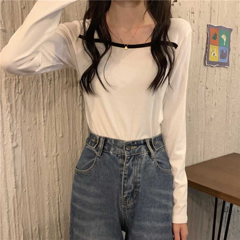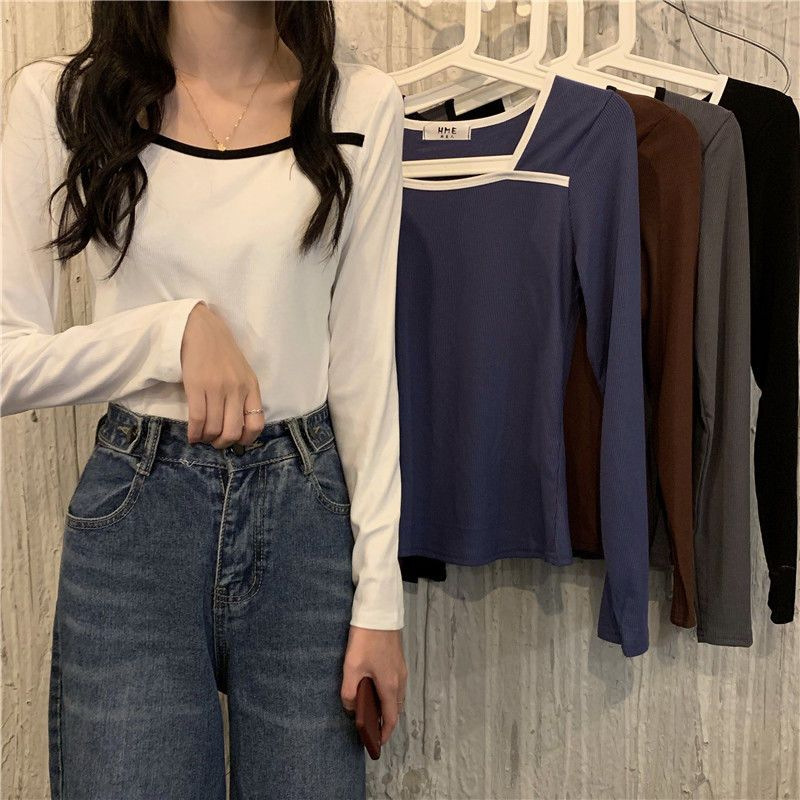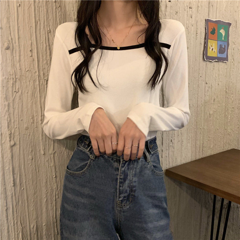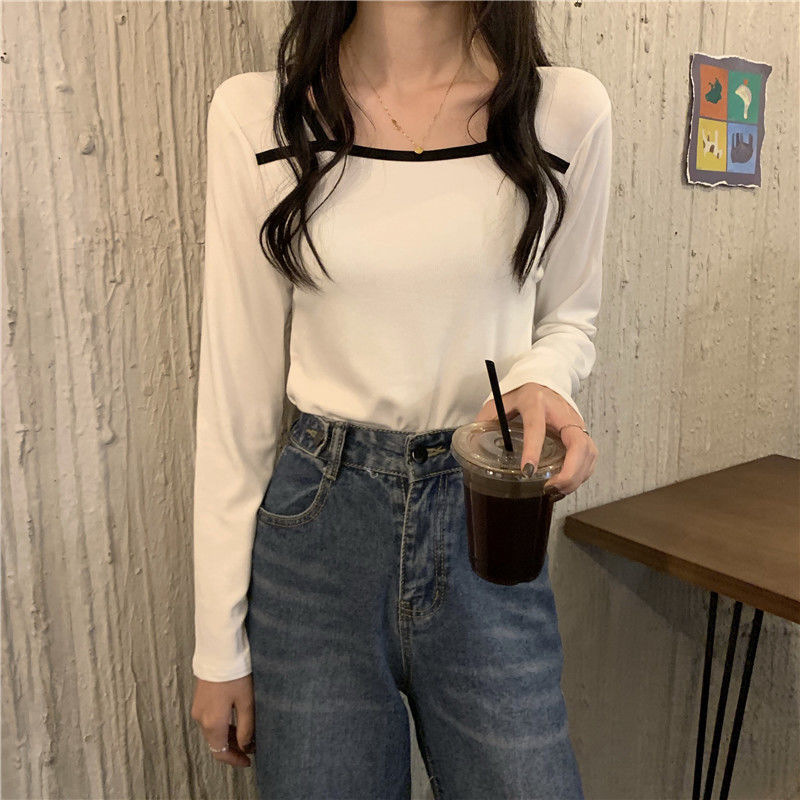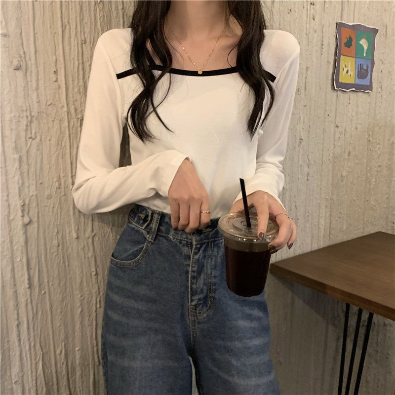 가을 2023 새로운 모든 매치 스퀘어 칼라 쇄골 긴팔 티셔츠 슬림핏 탑 인스토어 가기