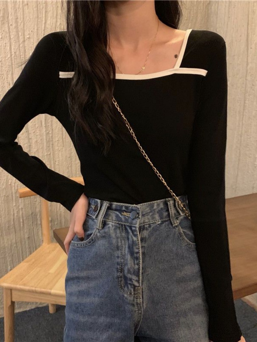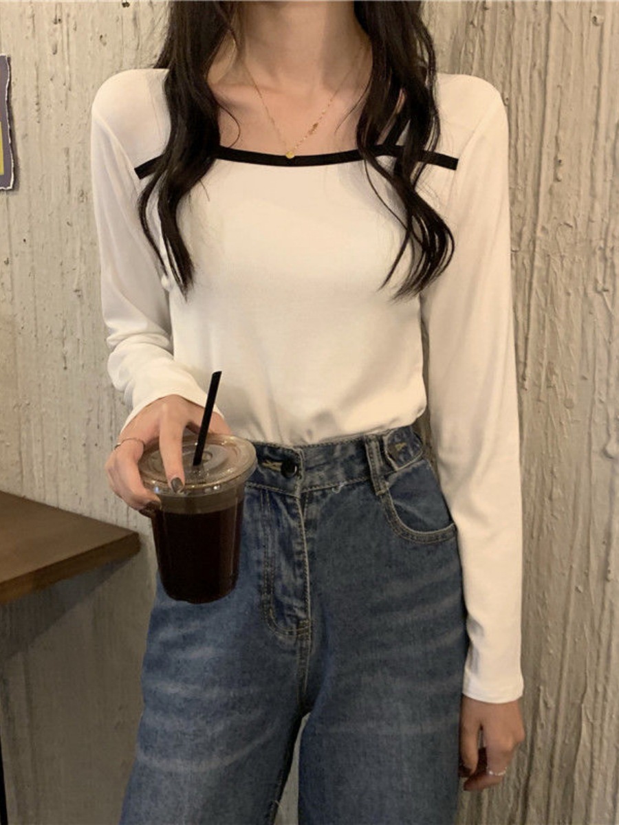 가을 2023 새로운 모든 매치 스퀘어 칼라 쇄골 긴팔 티셔츠 슬림핏 탑 인
