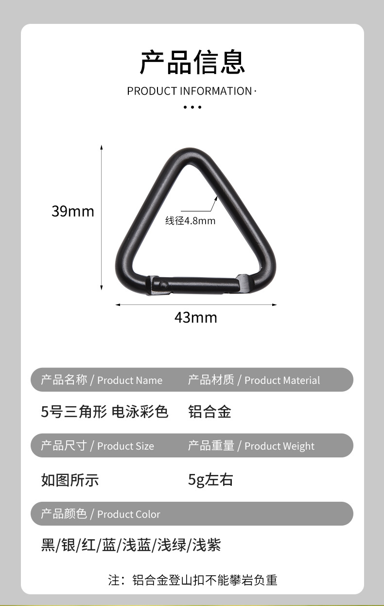 제조 업체 도매 5 호 삼각형 카라비너 다채로운 작은 배낭 걸이 버클 diy 아동 의류 야외 액세서리