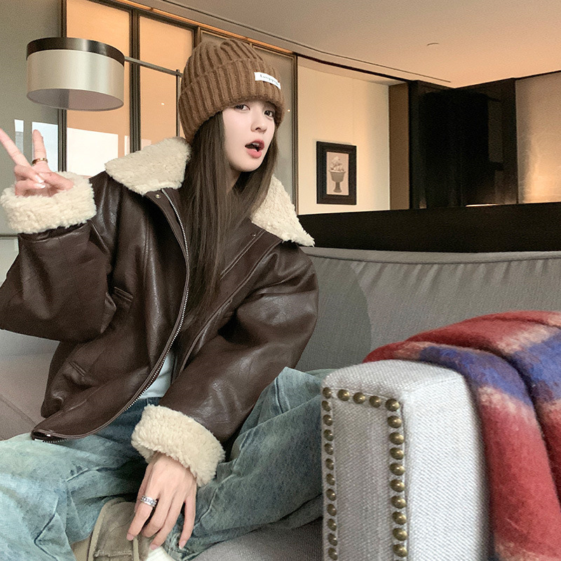 항저우 이린 의류 2024 메일라드 레트로 커피색 루즈핏 두꺼운 가죽 코튼 쇼트 재킷 여성용