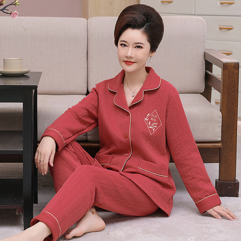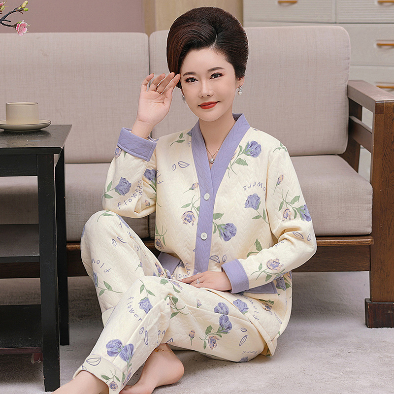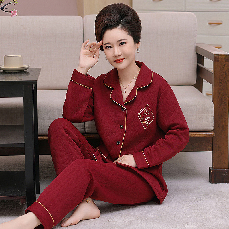 어머니 잠옷 여자의 가을과 겨울 중년 및 노인 공기 면 두꺼운 플러스 사이즈 얇은 면 외부 웨어러블 여자의 샌드위치 세트