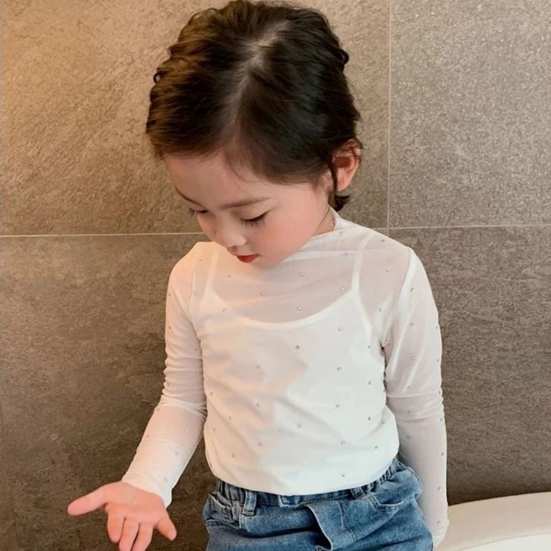 여아 여름 레이스 탑 긴팔 태양 보호 의류 메쉬 한국 티셔츠 겉옷을 위한 어린이 투명 핫 드릴링베이스 셔츠스토어 가기