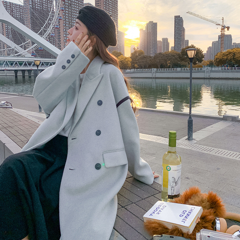 항저우 Yilin 의상 2023 대비 리본 바느질 느슨한 더블 브레스트 우아한 통근 라이트 그레이 여성용 모직 코트스토어 가기