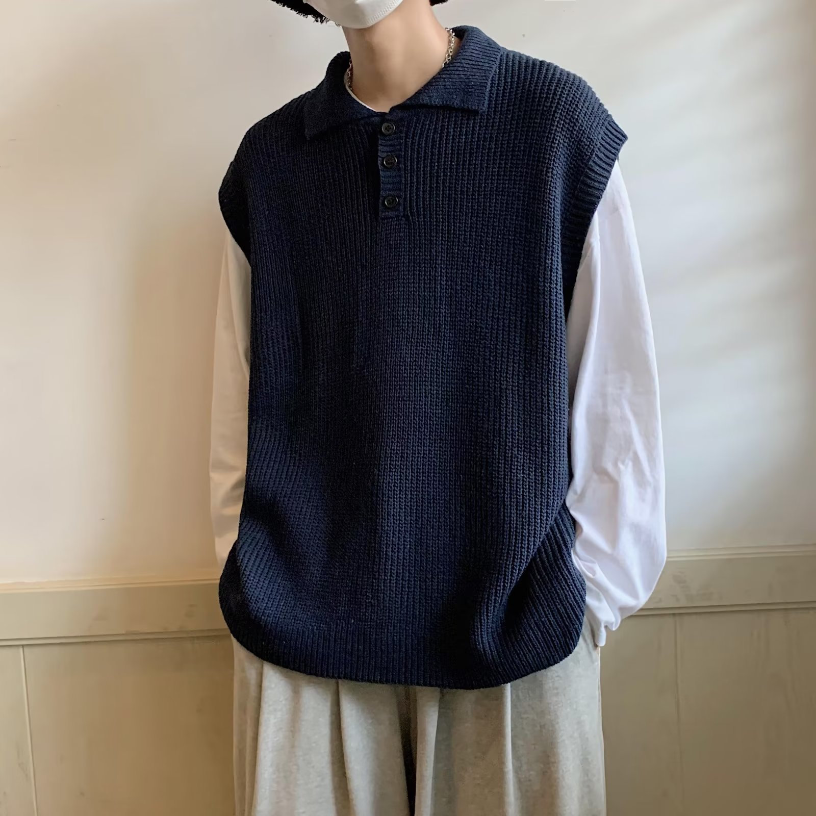 한국 스타일 울 조끼 남자의 인기있는 인스 타 그램 스타일 가을 옷깃 느슨한 니트 스웨터 단색 겉옷을 입고 조끼 탑 옷스토어 가기