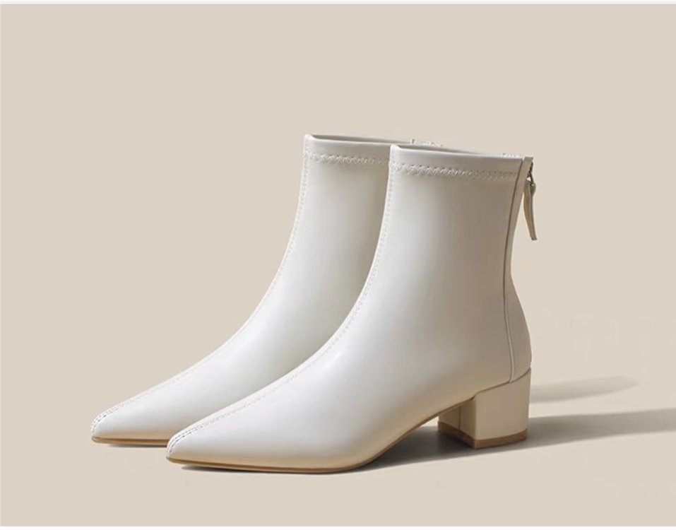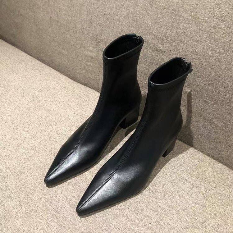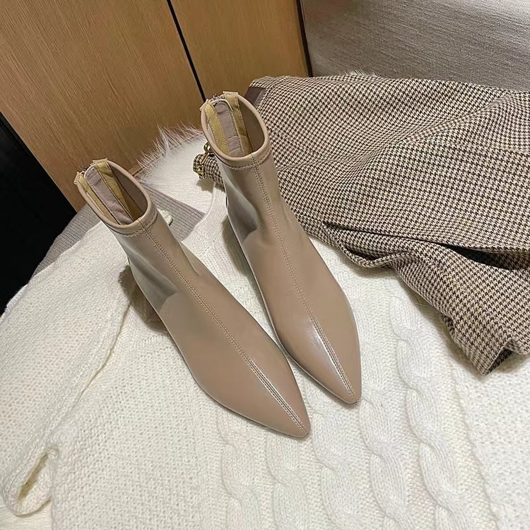 패션 뾰족한 두꺼운 뒤꿈치 여성용 가죽 부츠 2023 가을과 겨울 새로운 낮은 굽 지퍼 패션 낮은 부츠 도매스토어 가기