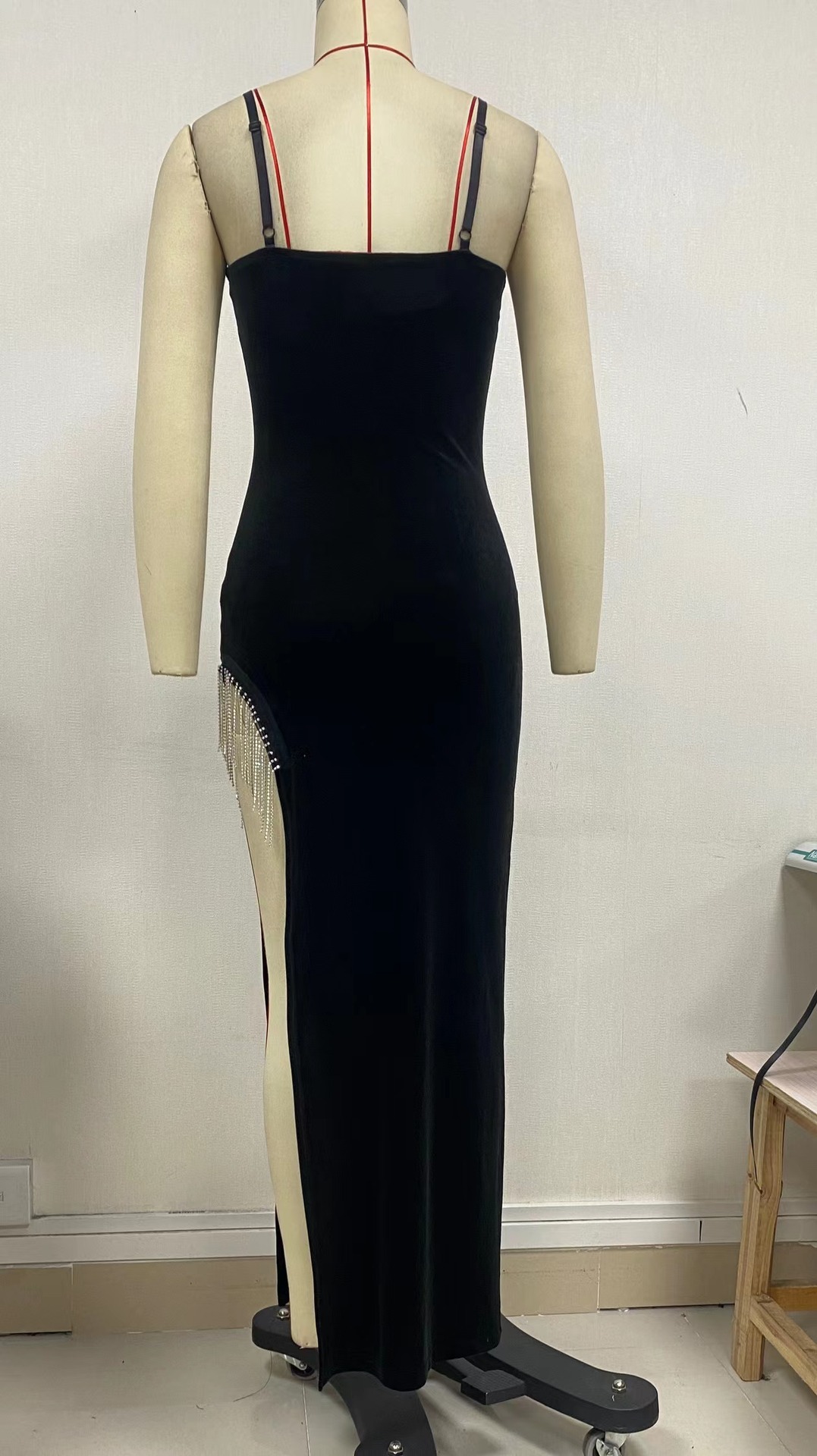 여자의 섹시한 벨벳 멜빵 술 밝은 다이아몬드 원피스 사이드 슬릿 원피스