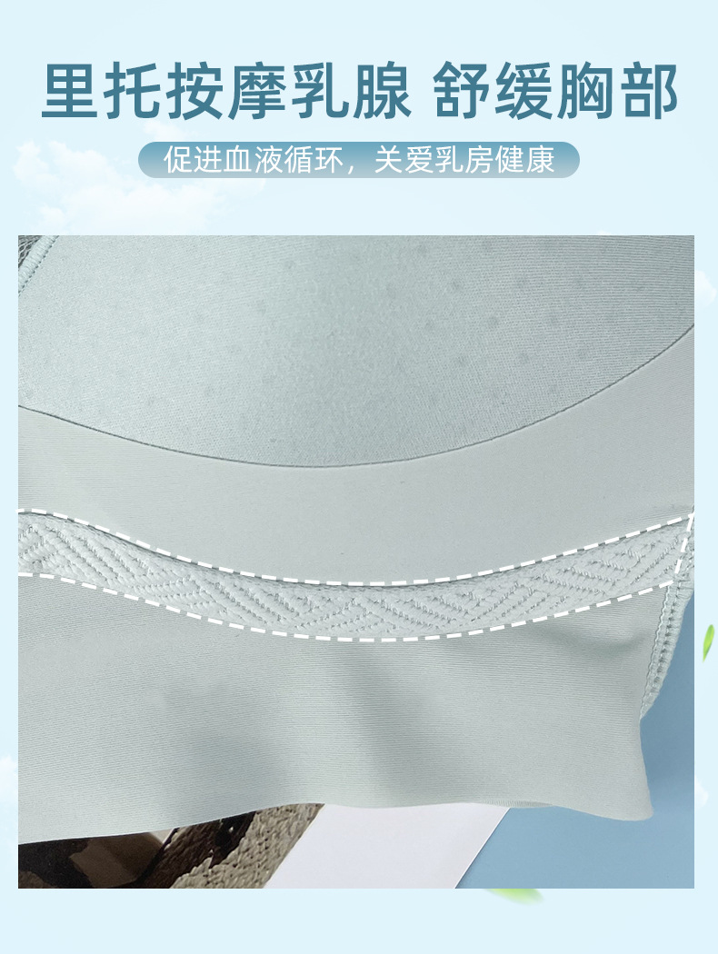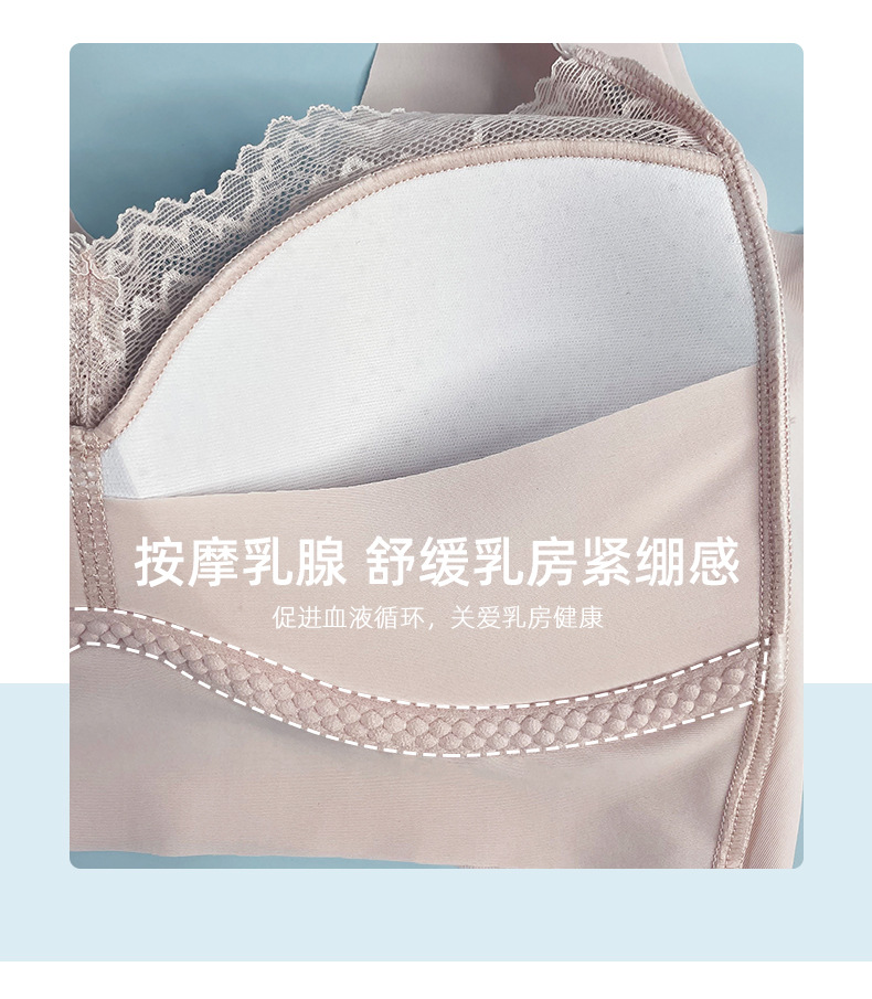 内杯透气孔 + 下围按摩:内杯透气孔温柔包裹胸部,向上推拢显圆润饱满,同时透气不闷热;下围带按摩乳腺功能,舒缓乳房紧绷感,促进血液循环。