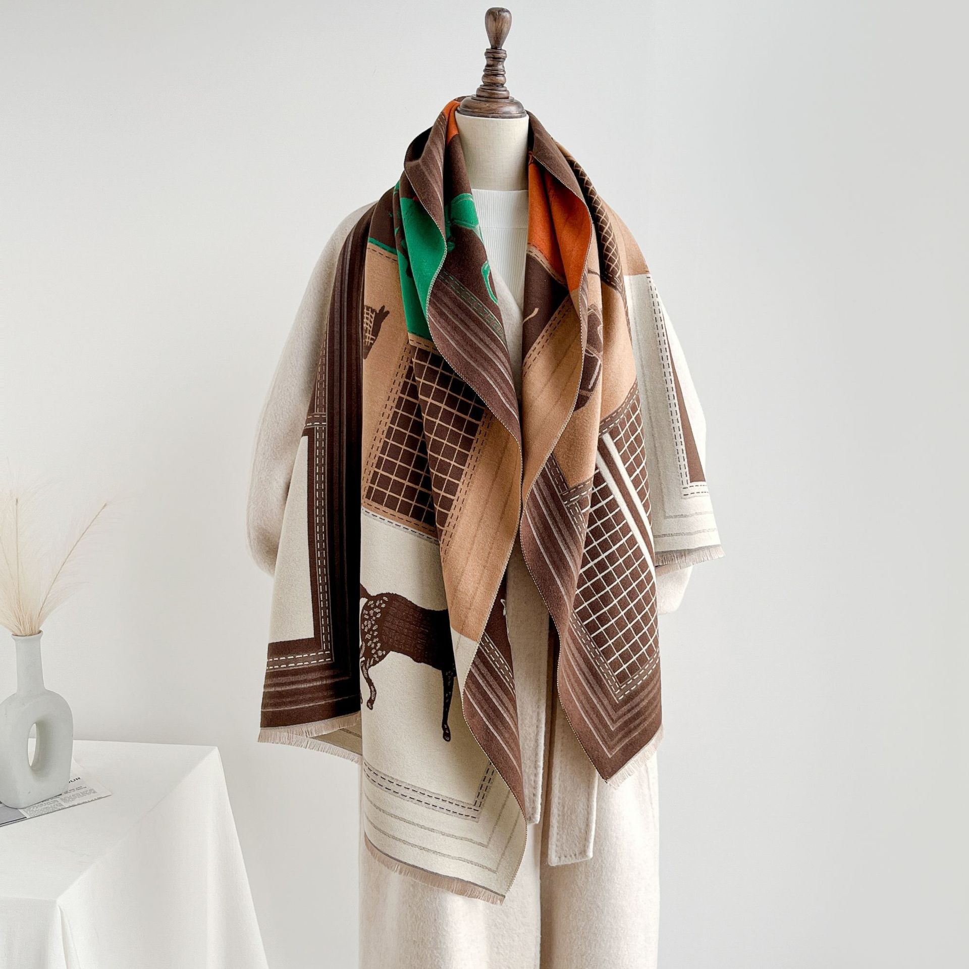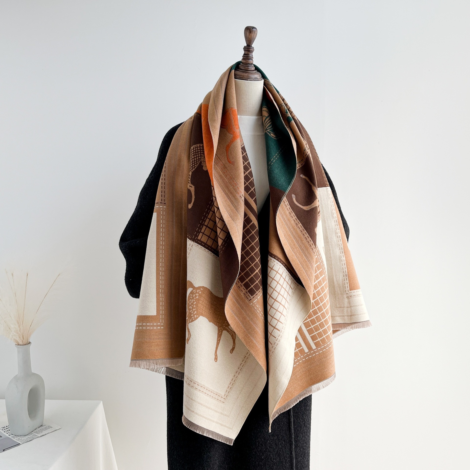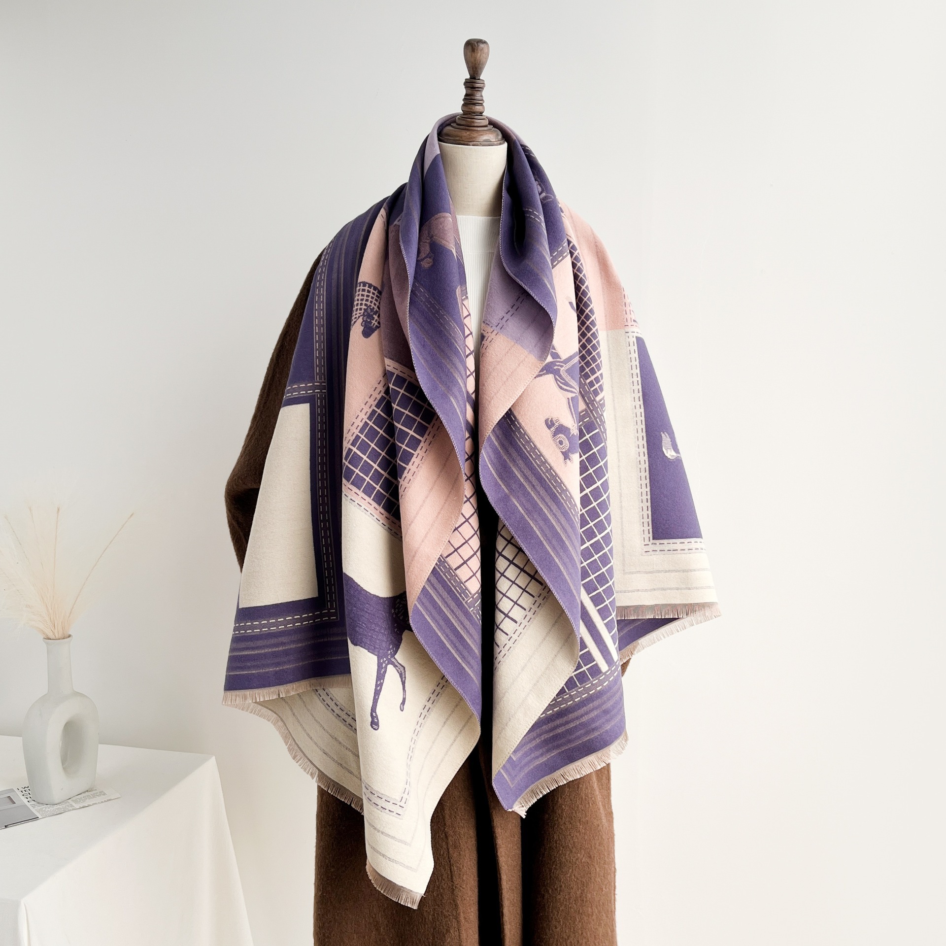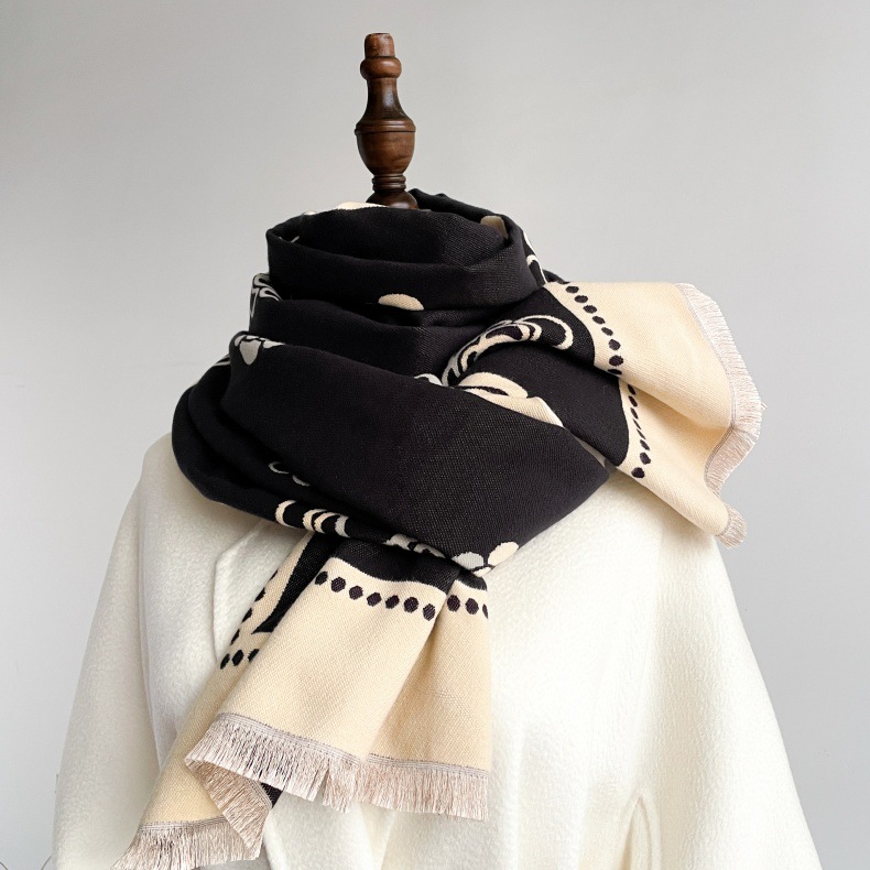 秋季仿羊绒保暖外搭披肩时髦百搭复古提花四梭围巾女短须流苏围脖