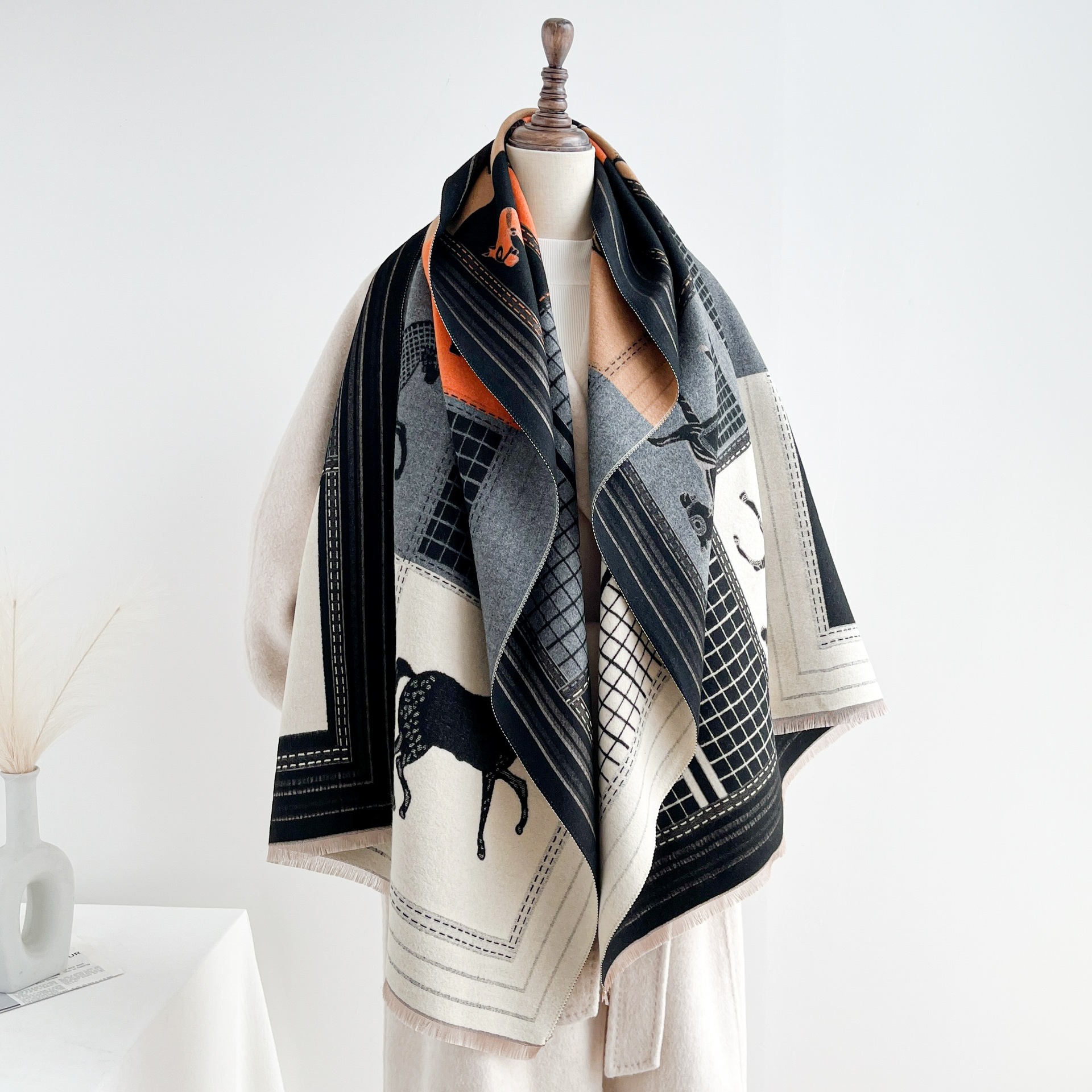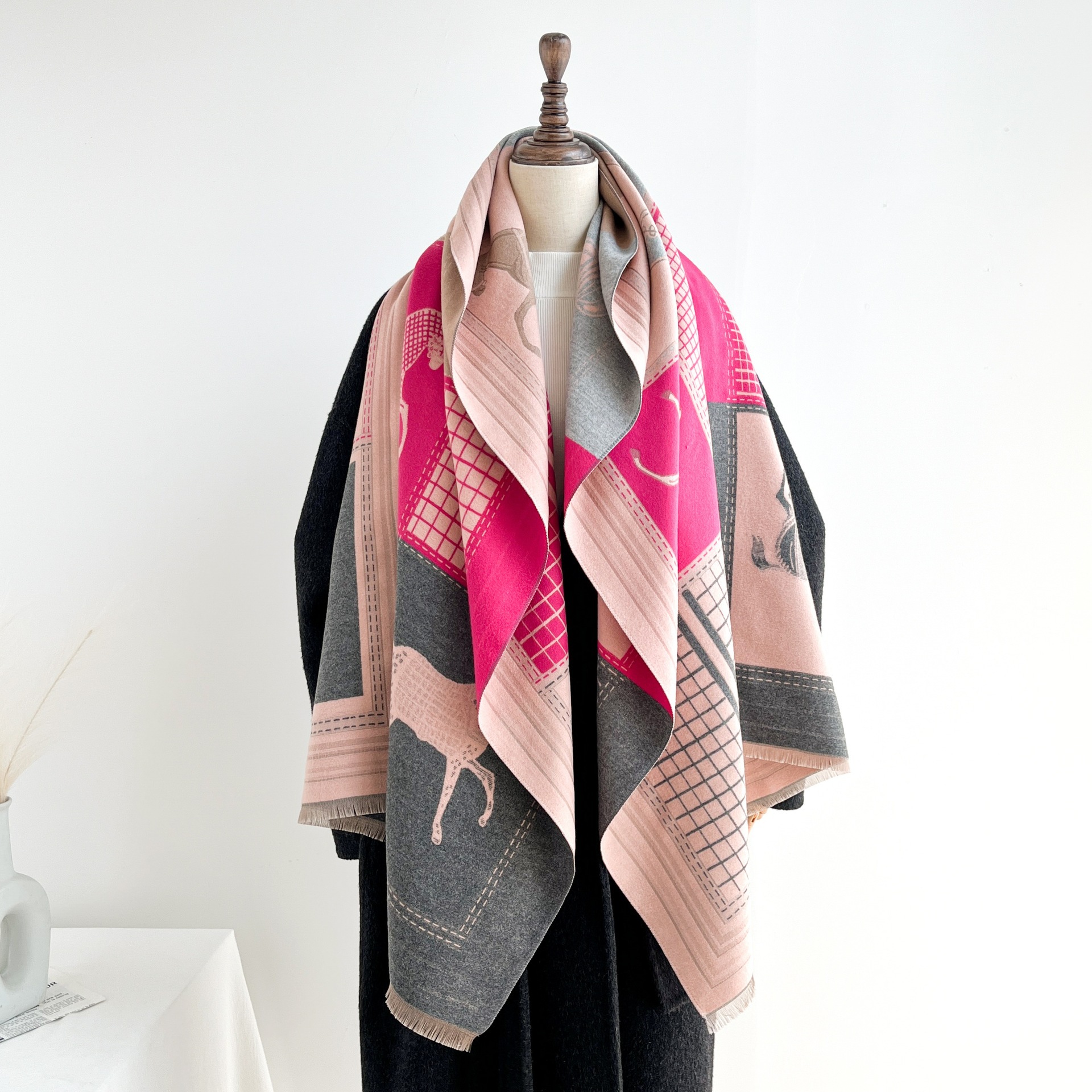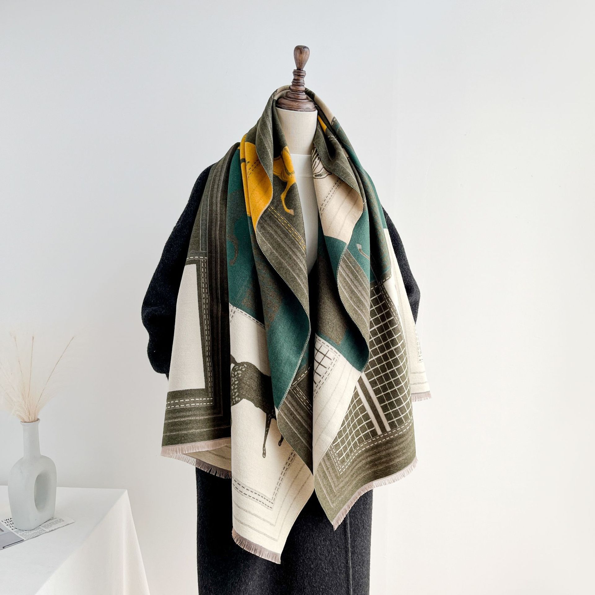 秋季仿羊绒保暖外搭披肩时髦百搭复古提花四梭围巾女短须流苏围脖