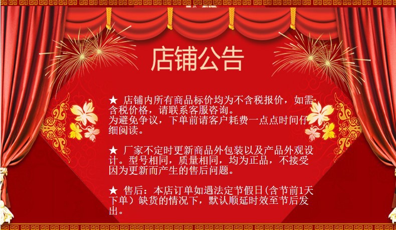 所有商品厂家会不定时更新产品外包装以及产品外观设计,如收到的产品与图片不符,但是型号相同,质量相同,均为正品。如需固定外观产品,请提前确认款式后再下单,不接受因为更新而产生的售后问题,请见谅。