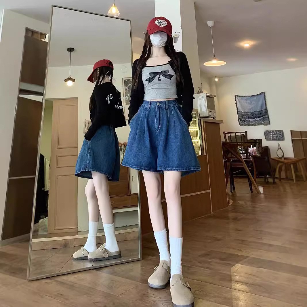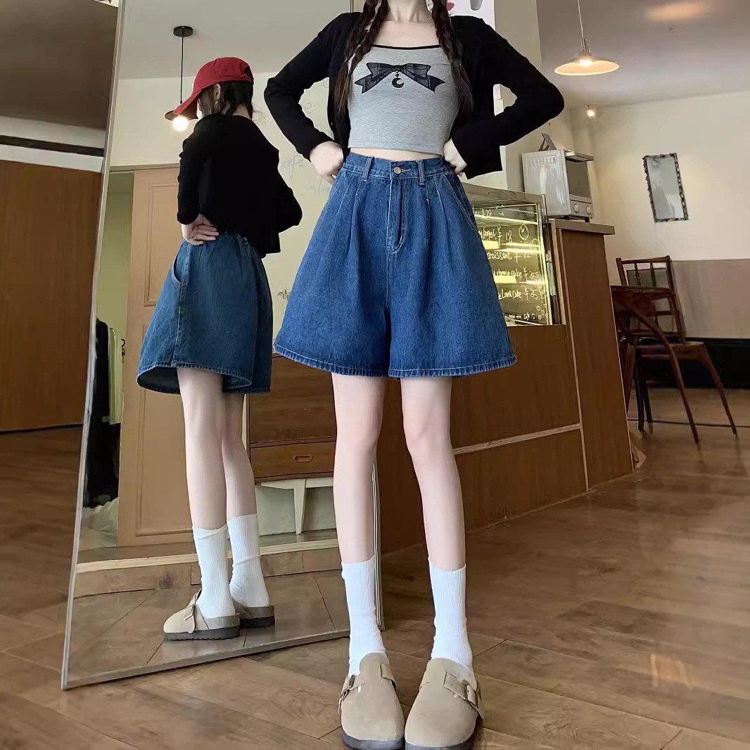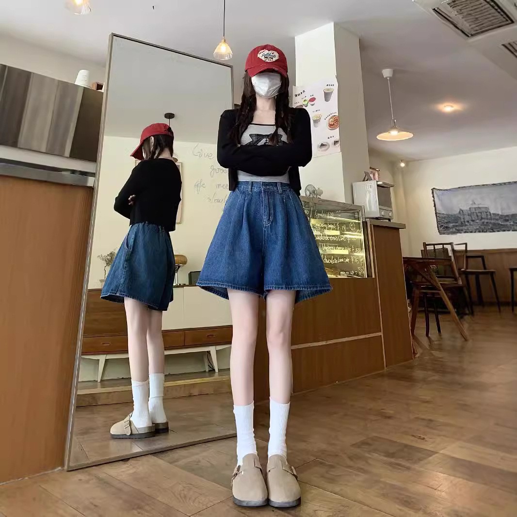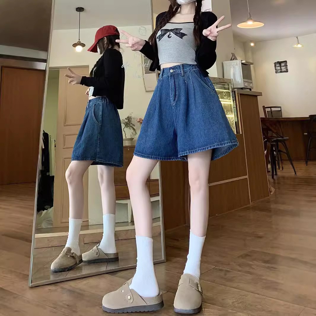 여름 얇은 넓은 다리 데님 반바지 여성 배 모양의 높은 허리 대형 통통녀 덮고있는 슬리밍 A 자 모양의 뜨거운 바지스토어 가기