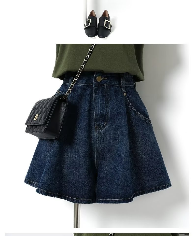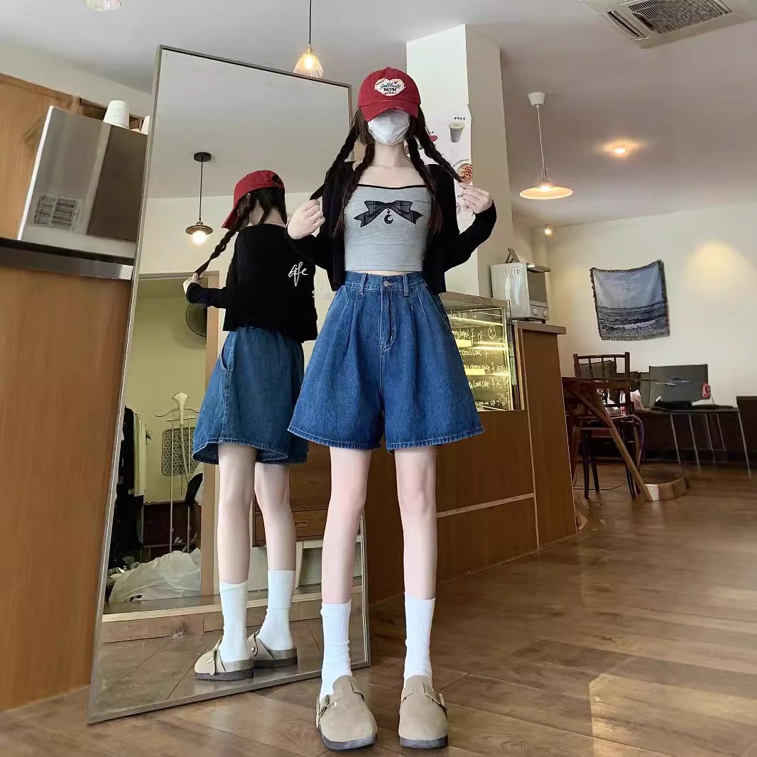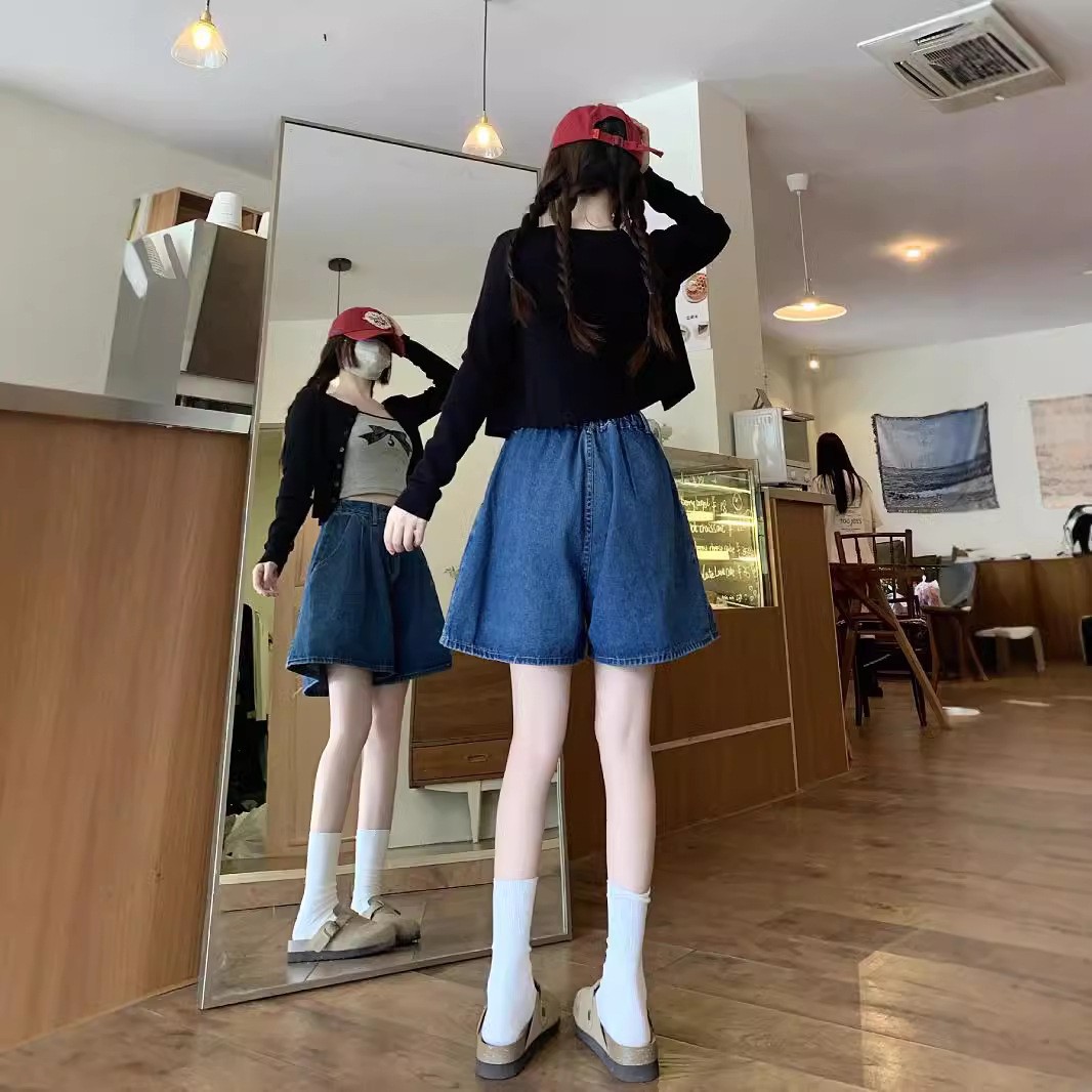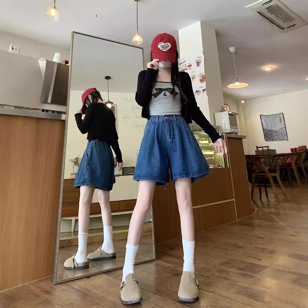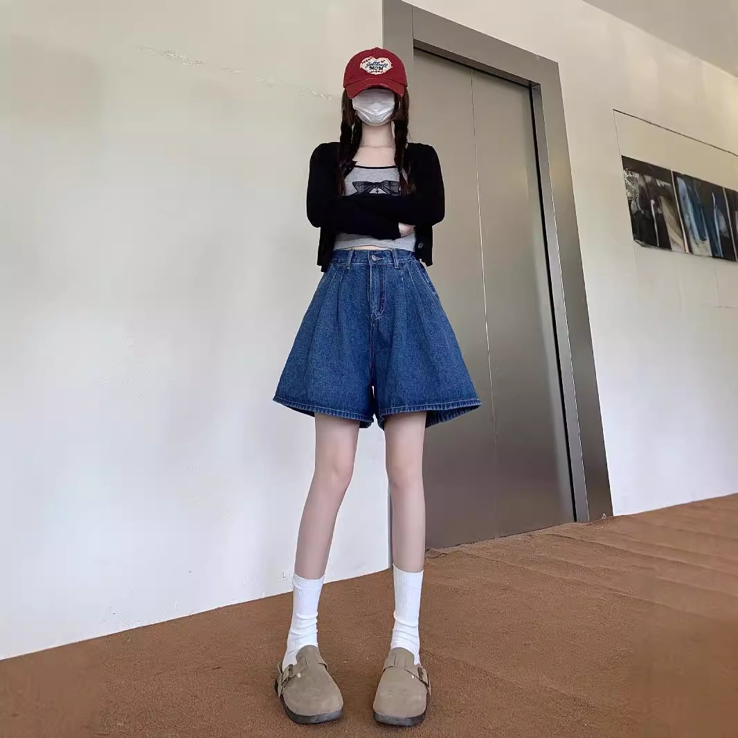 여름 얇은 넓은 다리 데님 반바지 여성 배 모양의 높은 허리 대형 통통녀 덮고있는 슬리밍 A 자 모양의 뜨거운 바지스토어 가기