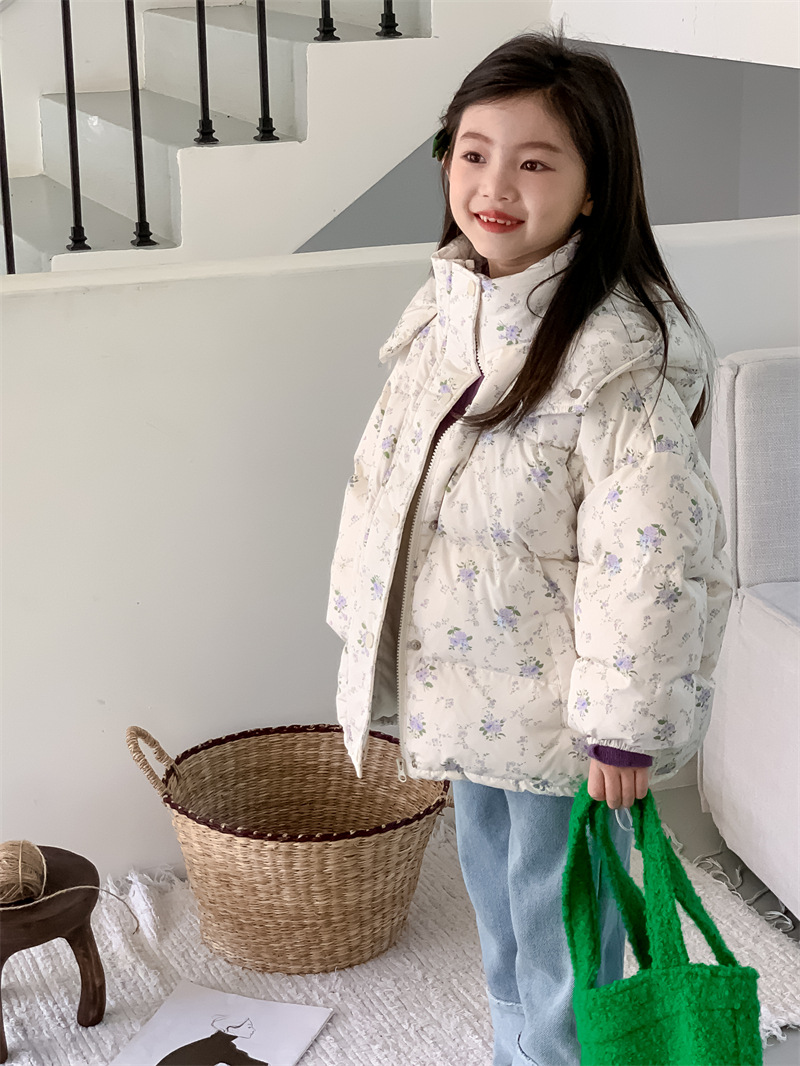 꽃과 소녀 다운 재킷 겨울 2024 새로운 작은 신선한 꽃 후드 화이트 오리 다운 따뜻한 코트 조수
