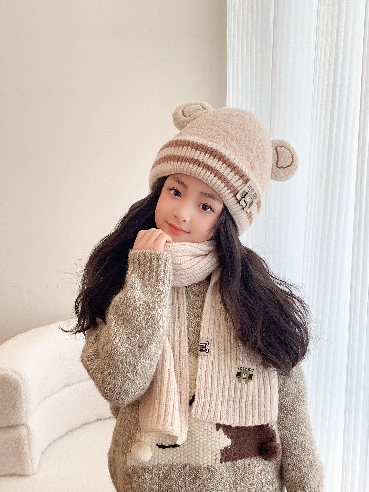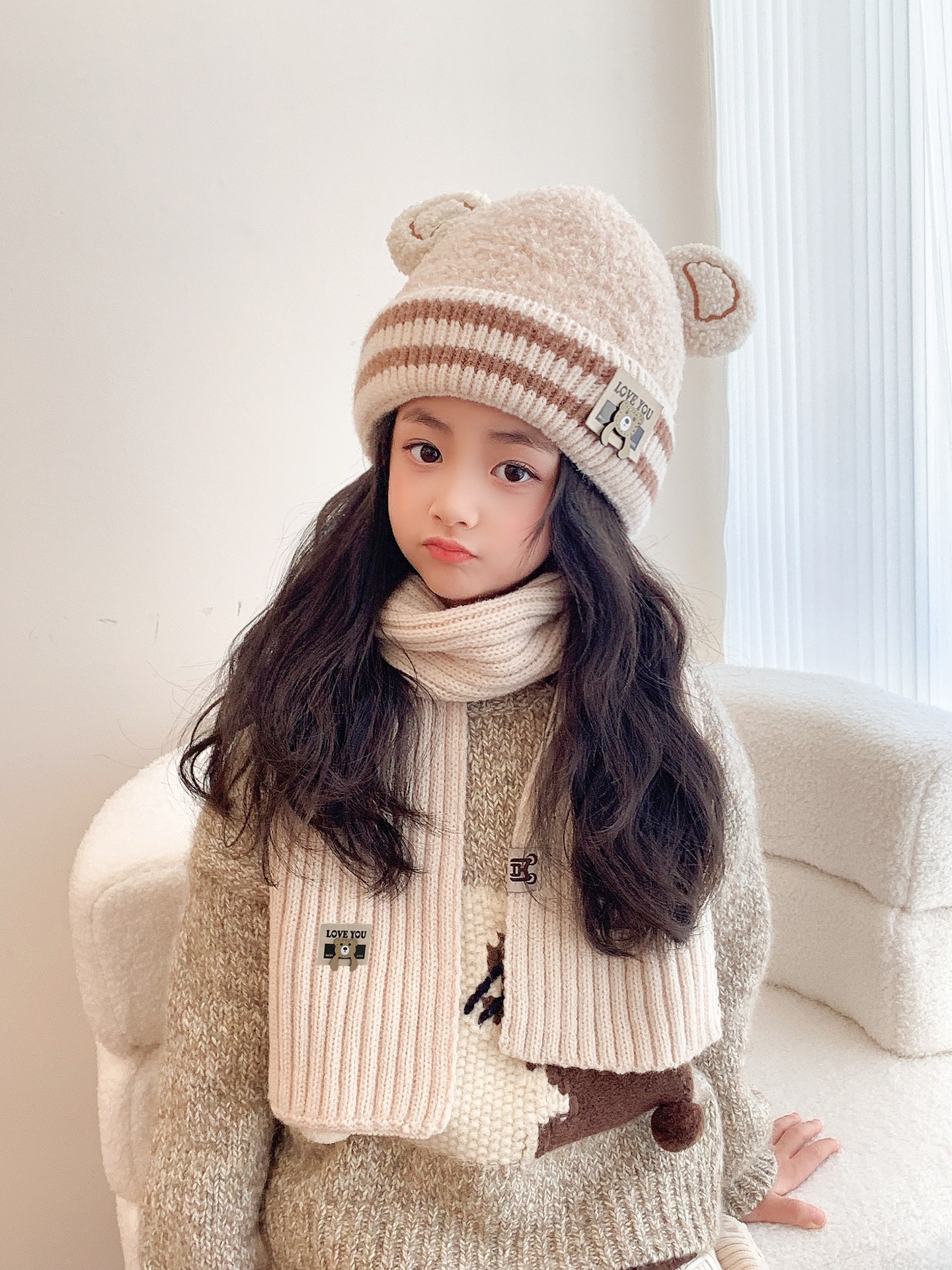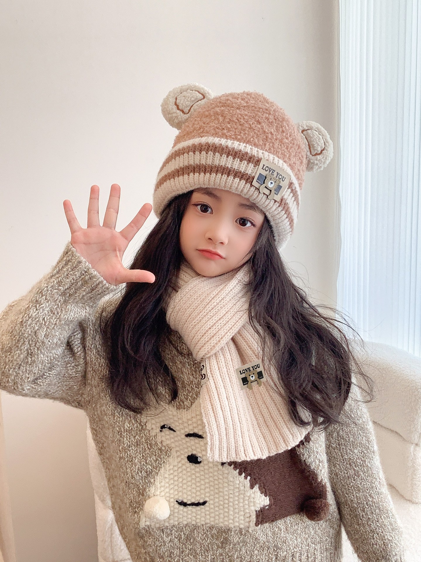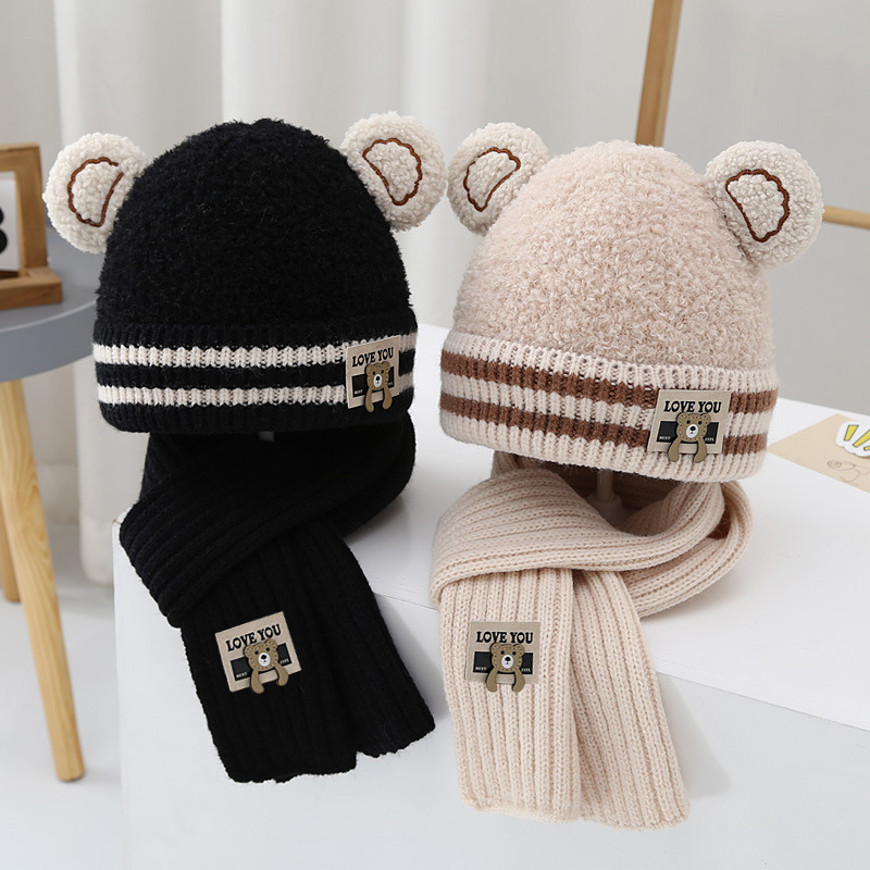 어린이 니트 모자 스카프 세트 가을과 겨울 만화 곰 라벨 아기 따뜻한 귀 보호 모자 여아 양모 모자