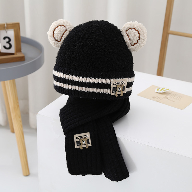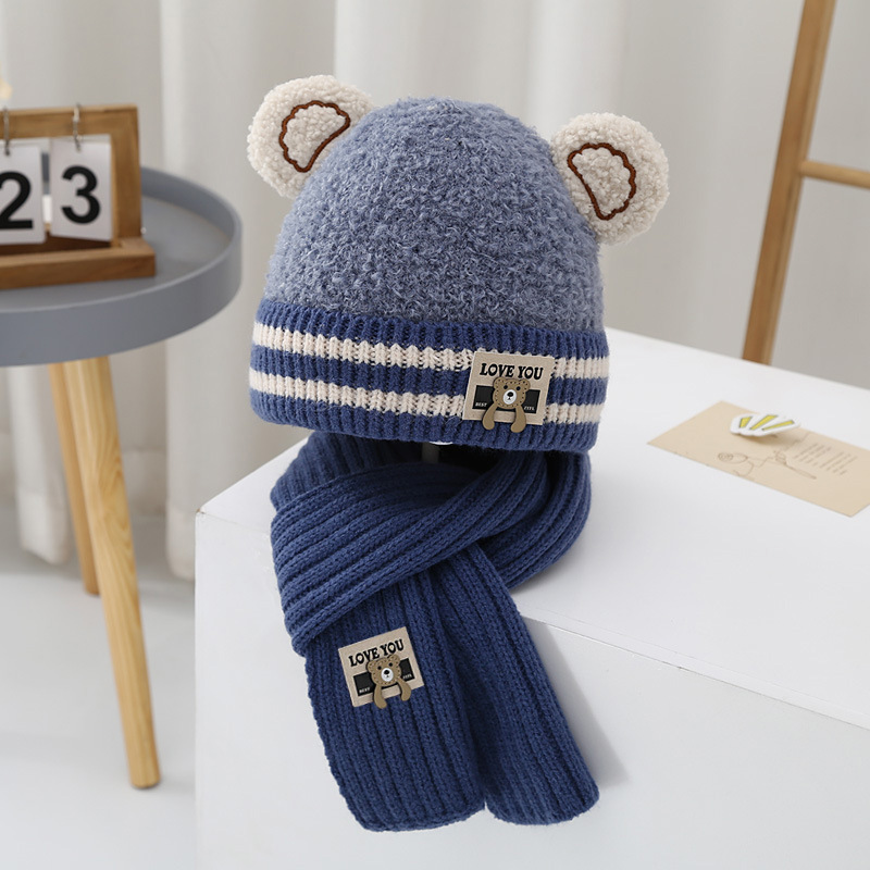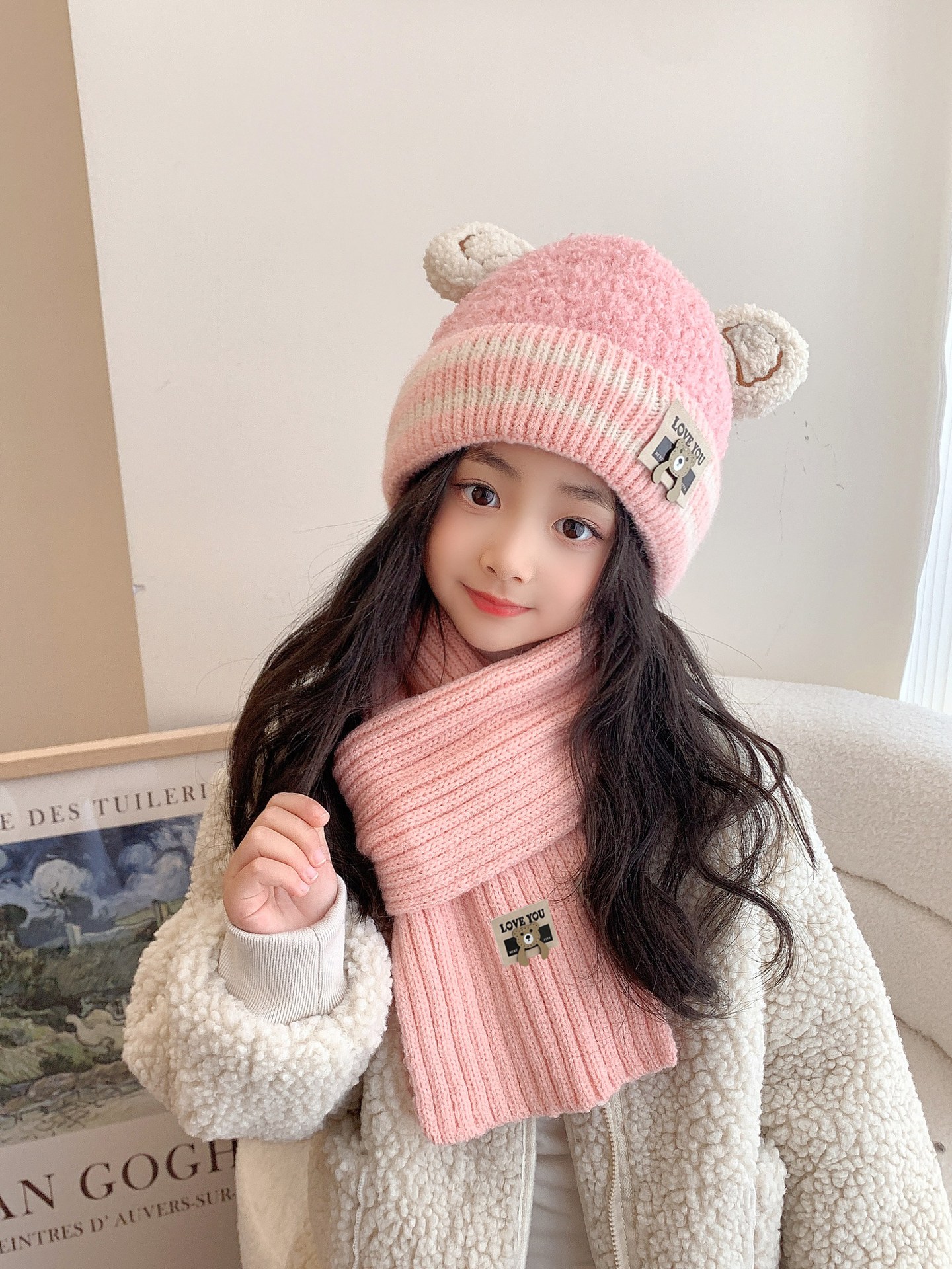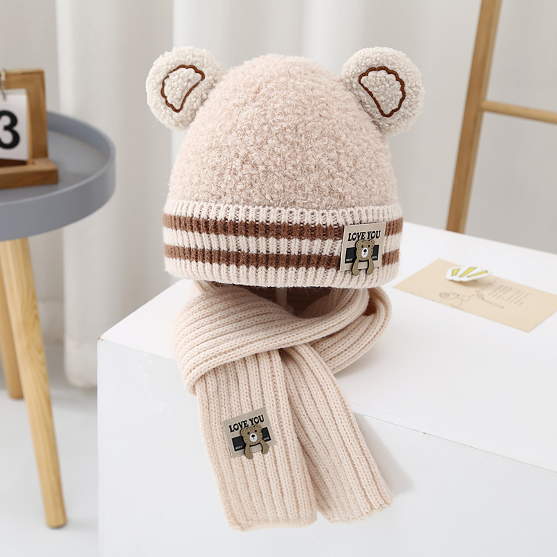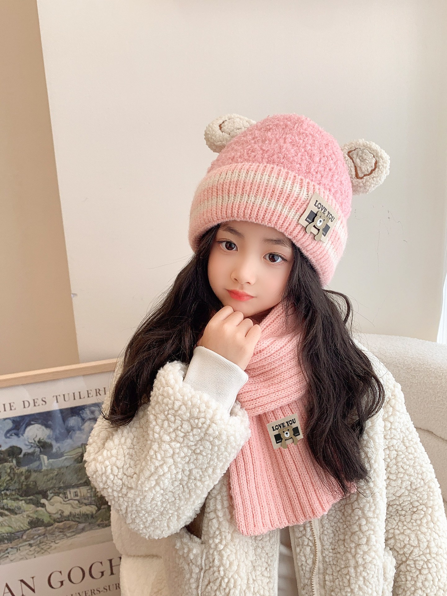 어린이 니트 모자 스카프 세트 가을과 겨울 만화 곰 라벨 아기 따뜻한 귀 보호 모자 여아 양모 모자