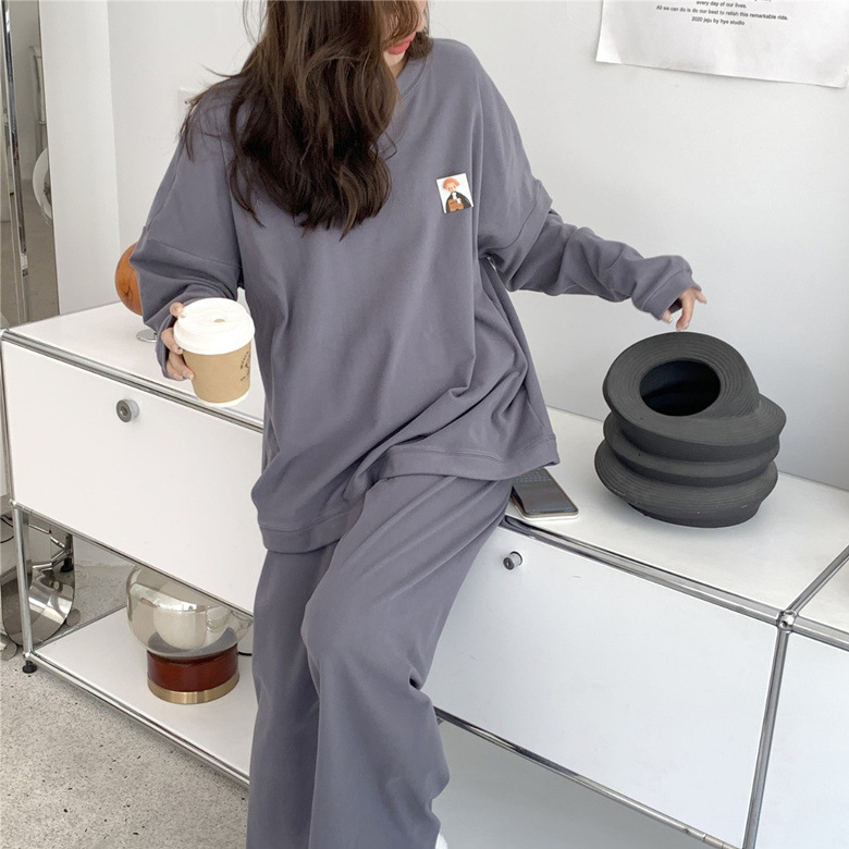 • 긴팔 다크 그레이 스웨트셔츠 KT 베어 그레이 플로럴 팬츠 저먼 벨벳