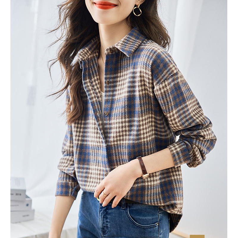 빈티지 샌딩 재킷 2023 가을 새로운 느슨한 대비 격자 무늬 긴 소매 옷깃 셔츠 여성용스토어 가기